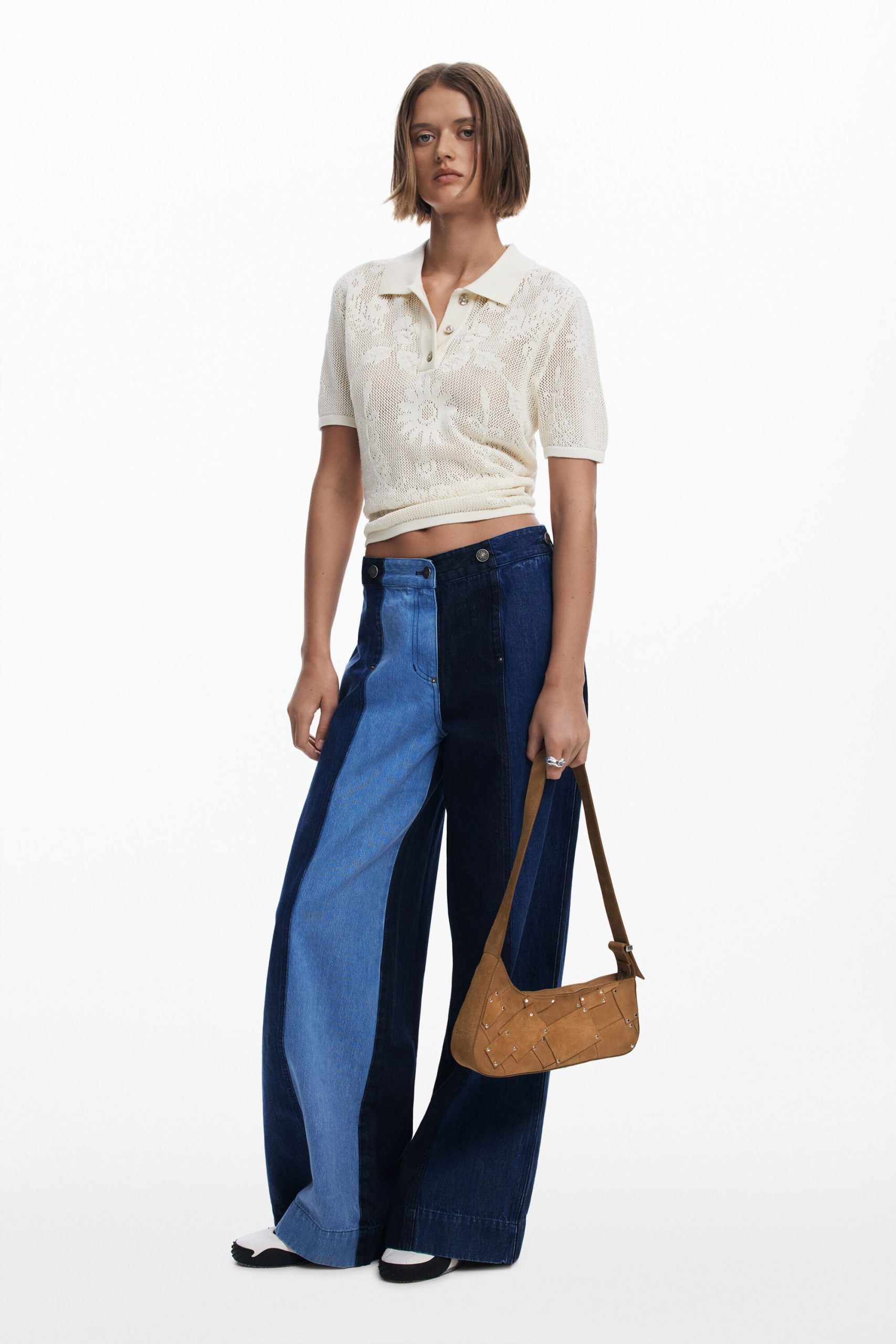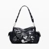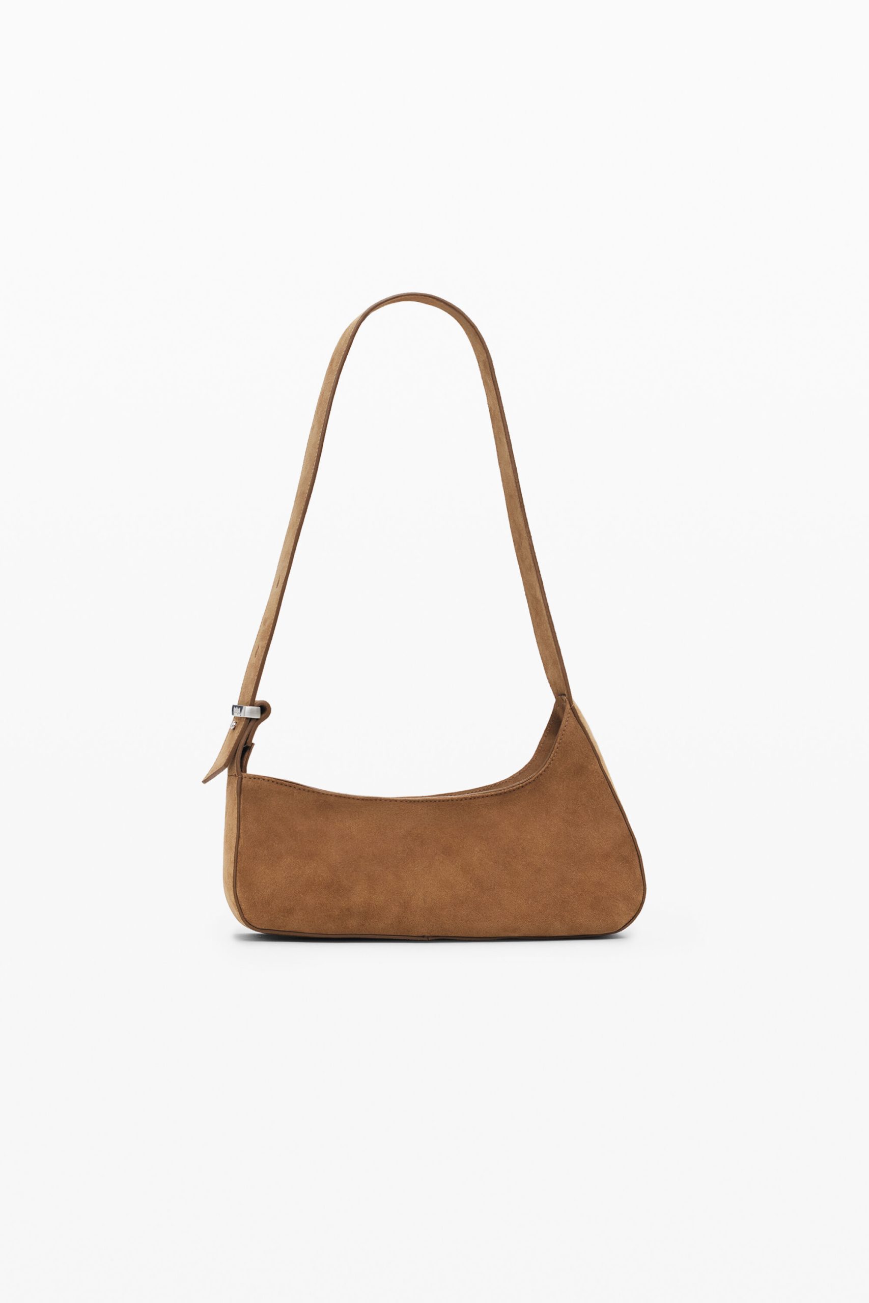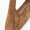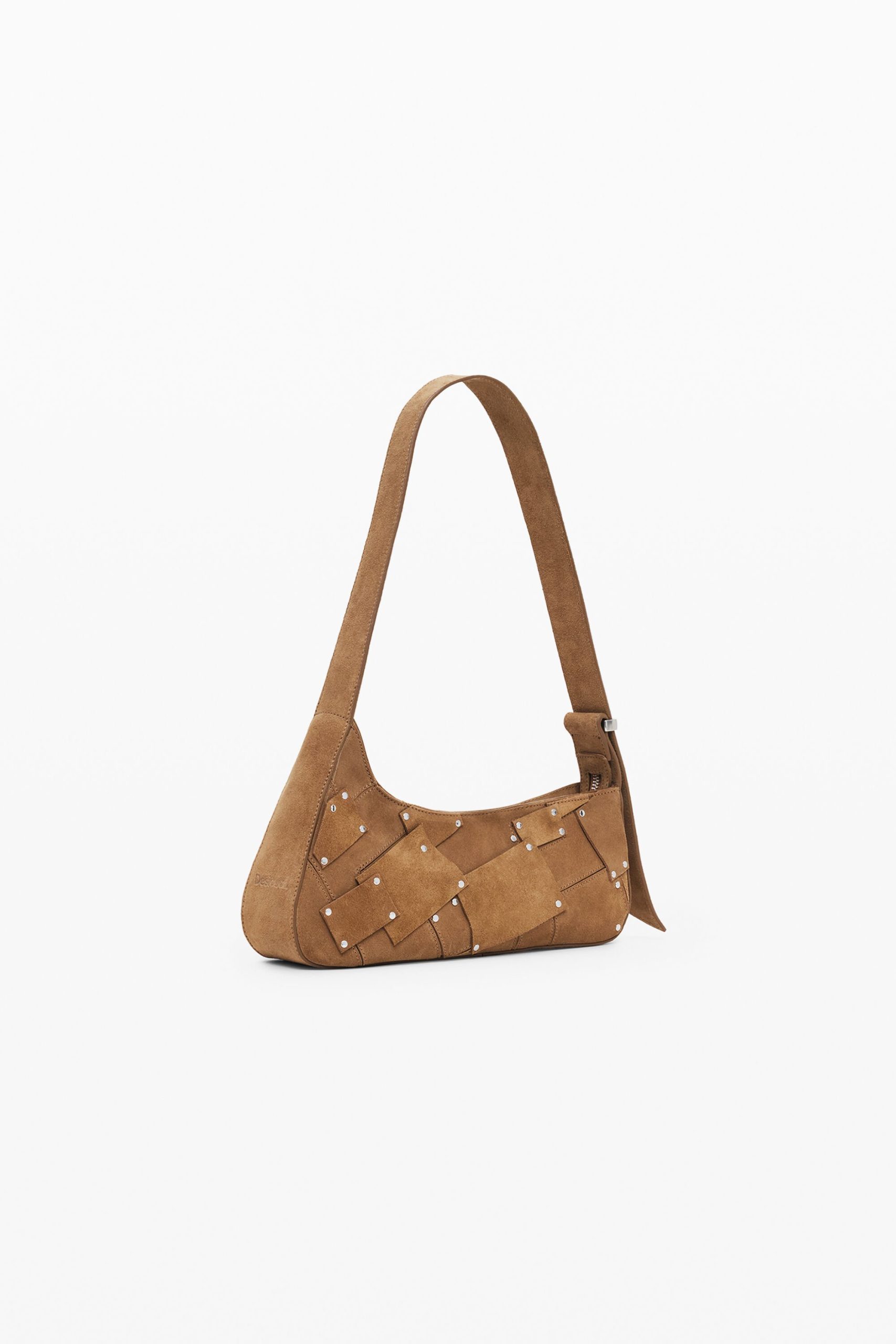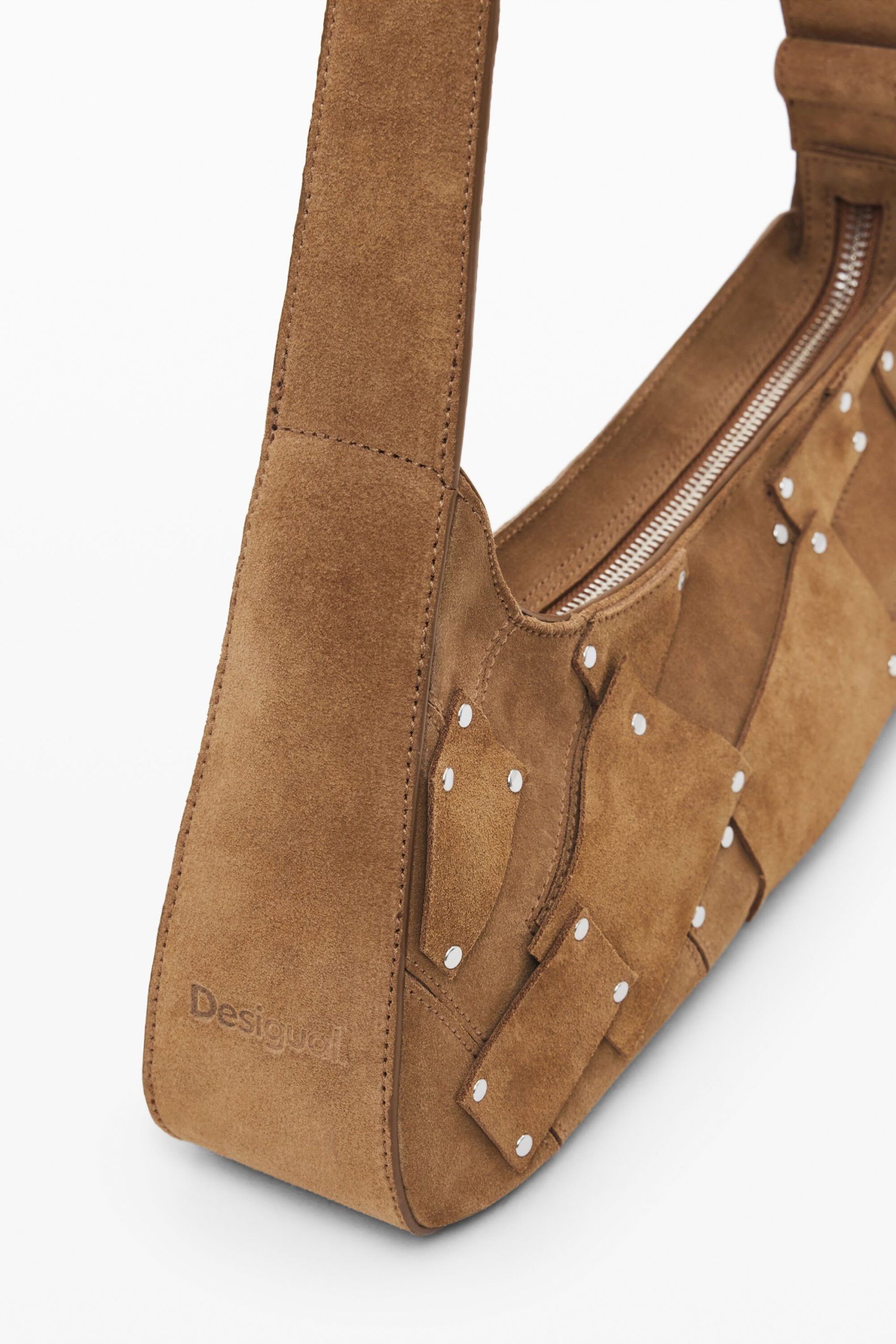 Small crossbody style bag in 100% leather fabric, asymmetrical flap and metal stud detail.