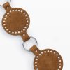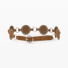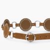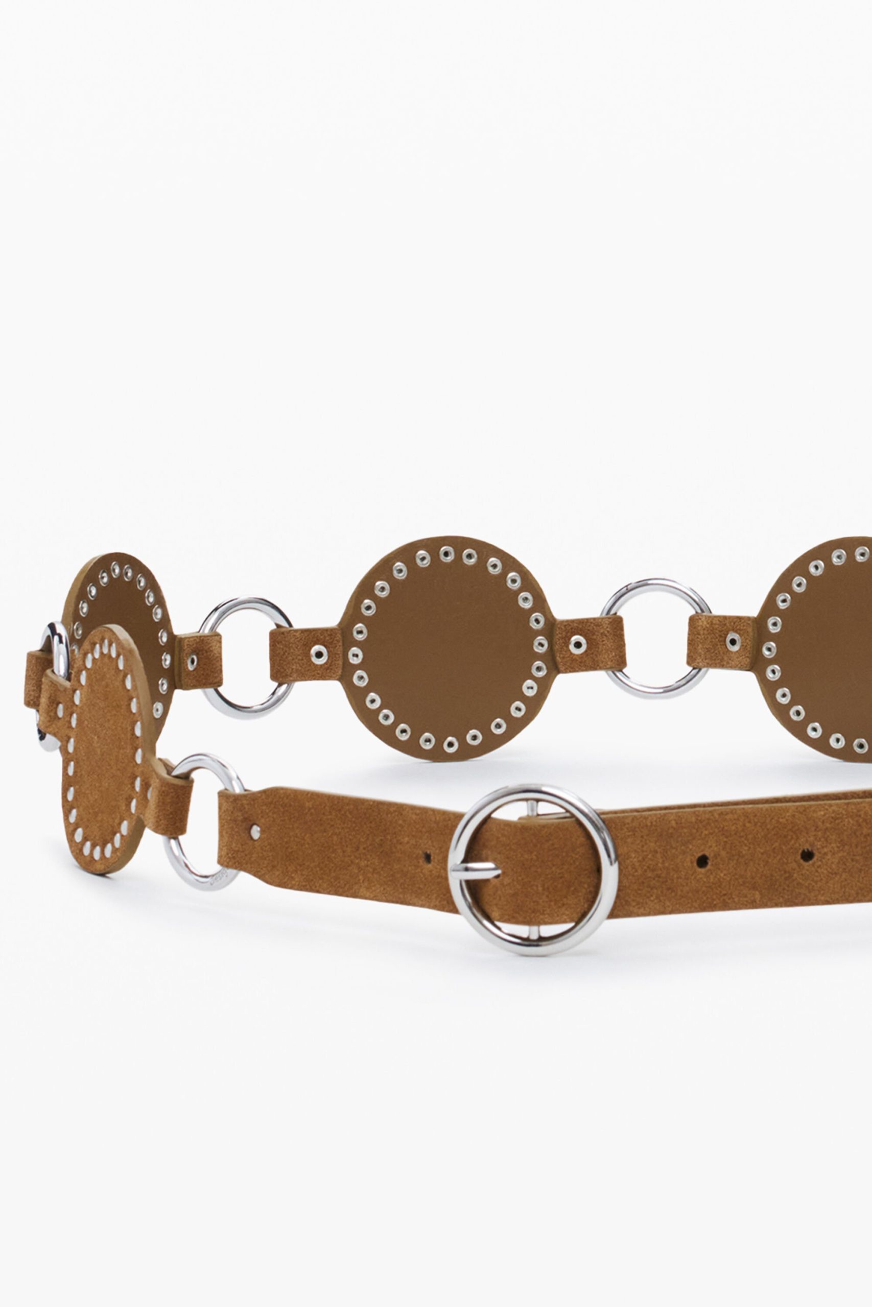 Belt in recycled leather made up of round pieces and articulated rings, with stud details and buckle closure.