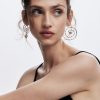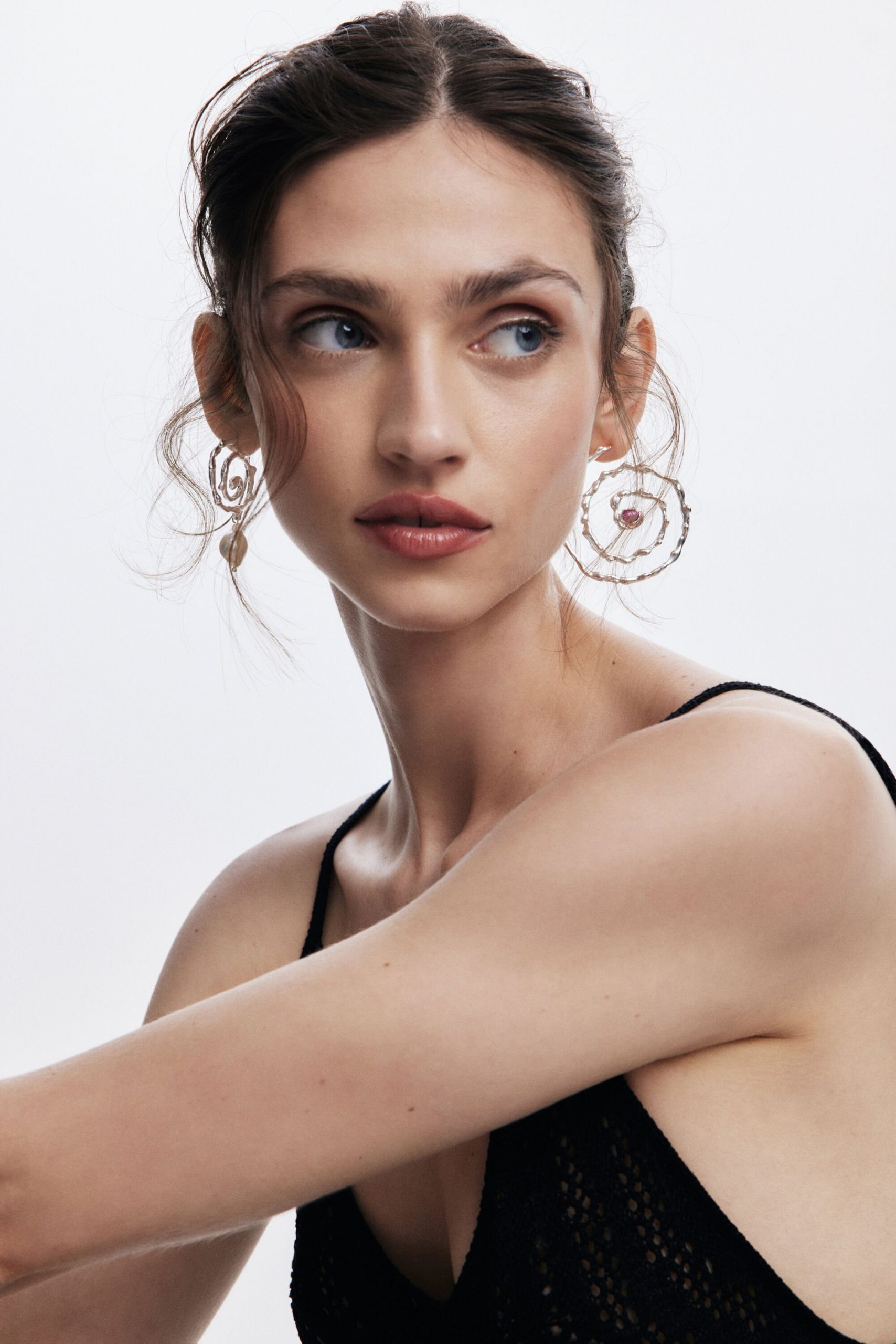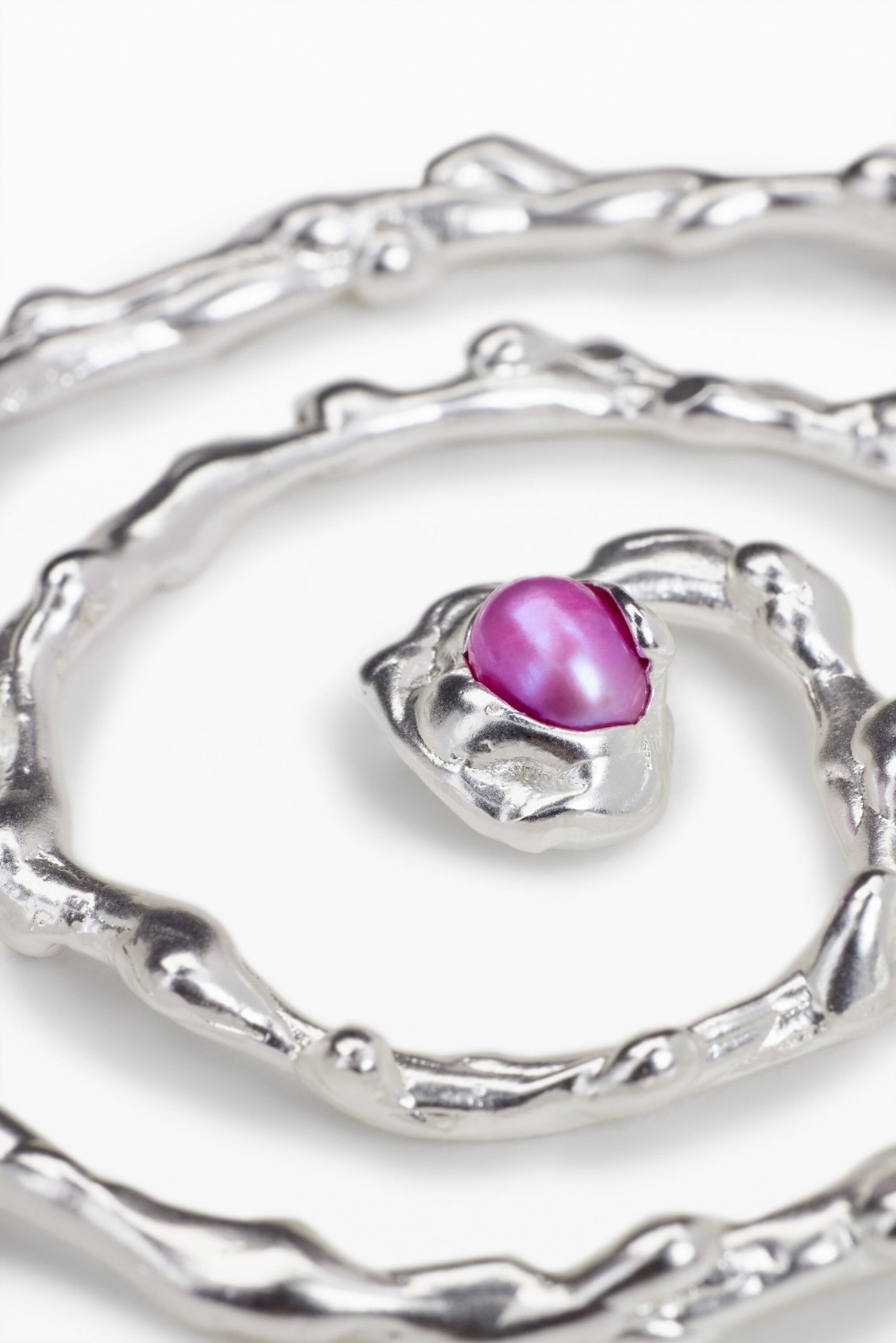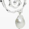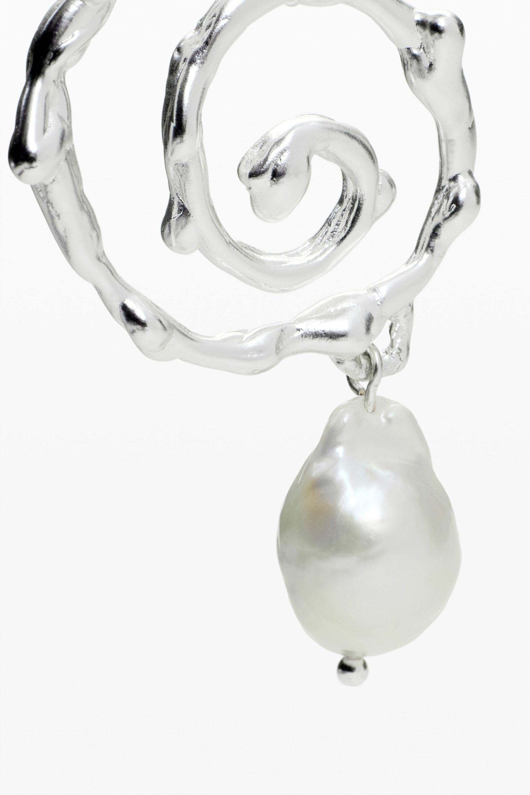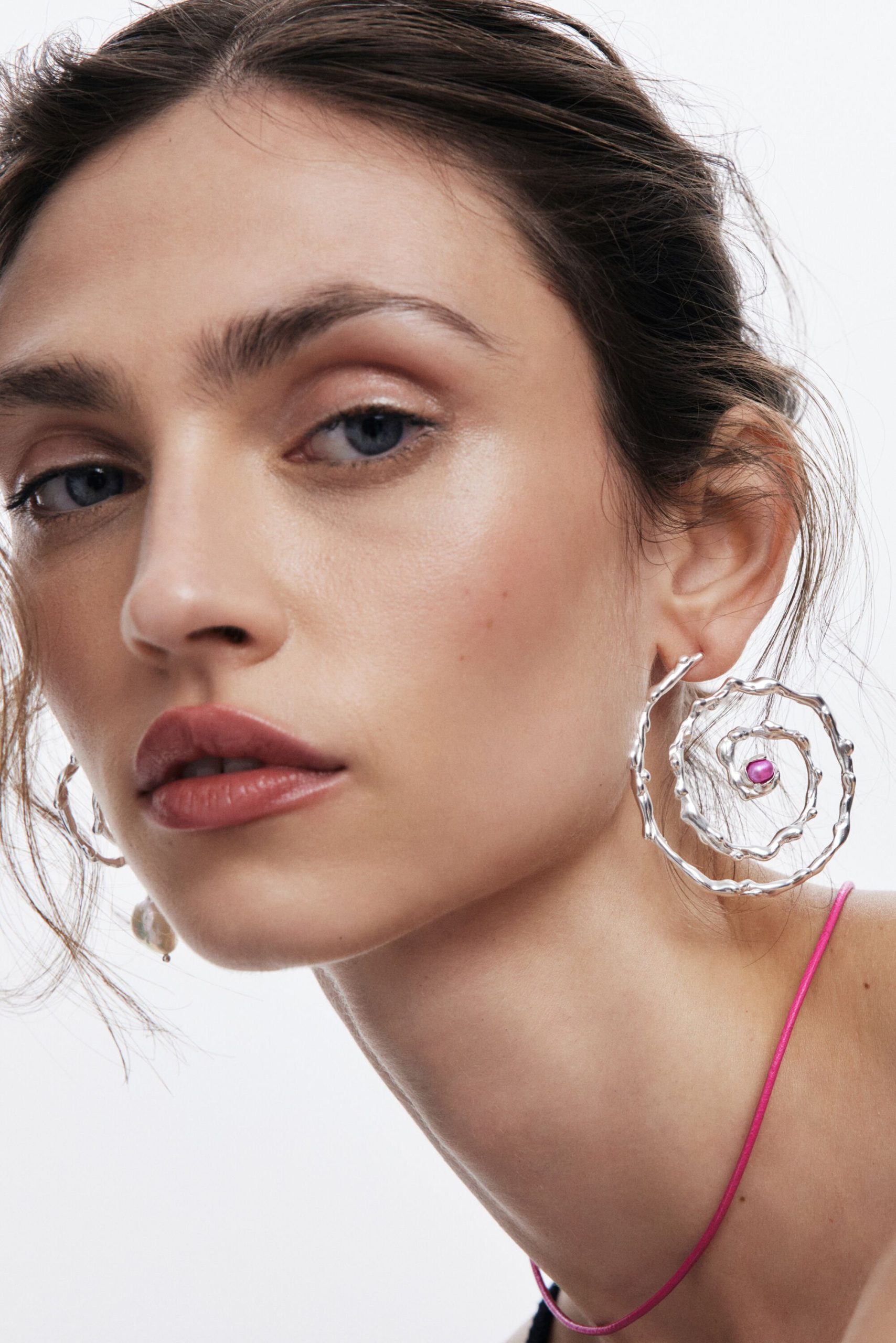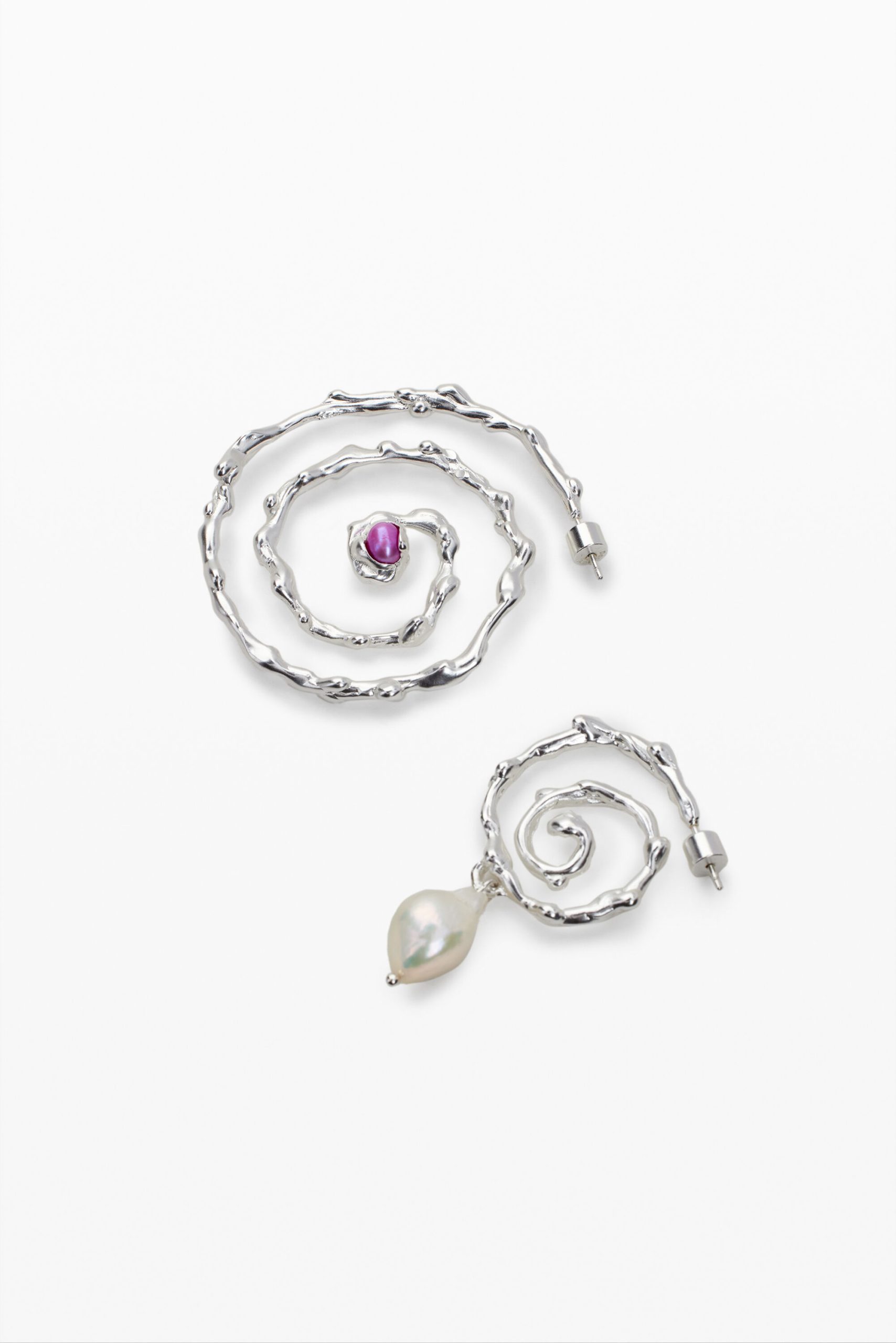 Irregular earrings with spiral shapes, plated in 1st Law silver of 3 micro inches, with pressure closure and pearl detail. Zalio x Desigual collection; designed by Gala Meyer.