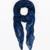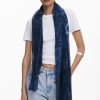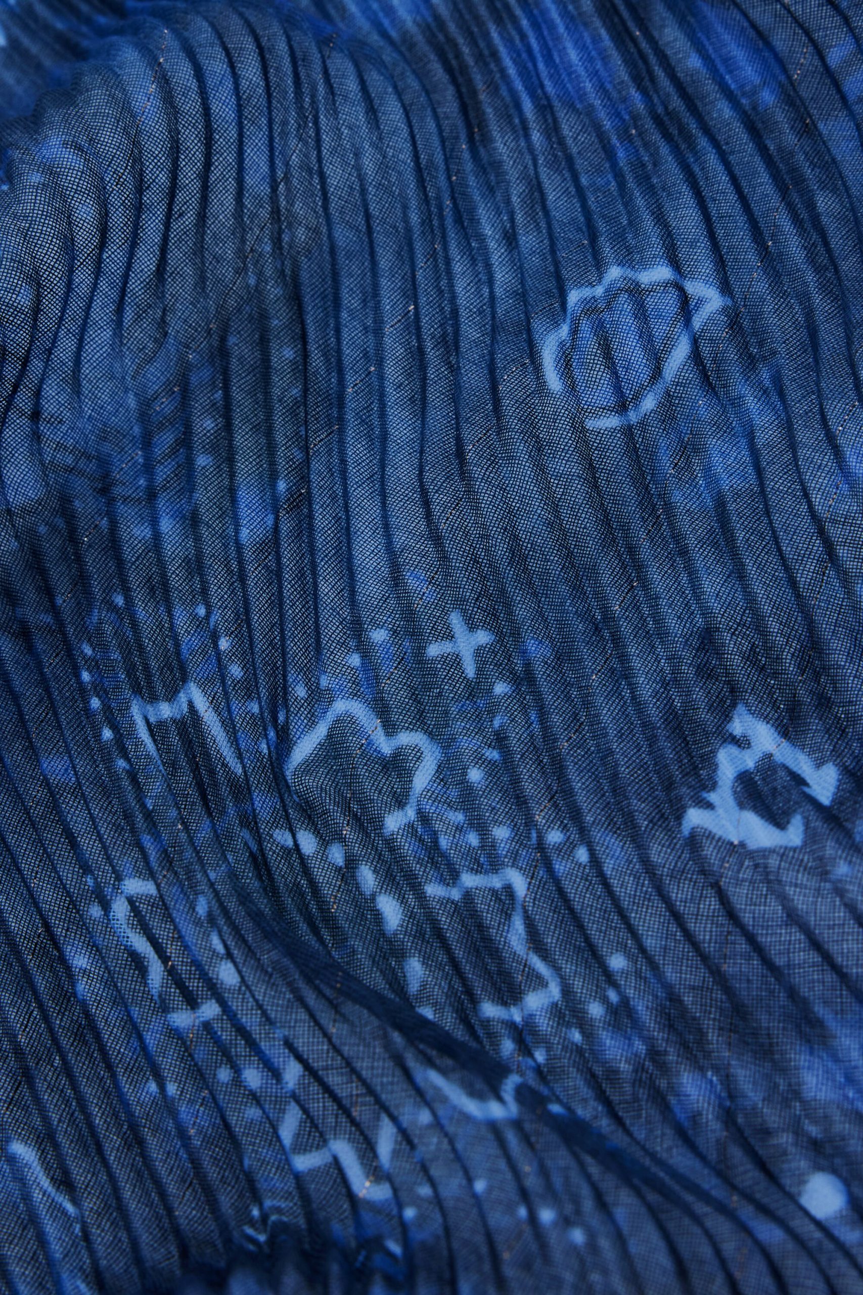 Large rectangular scarf made of pleated fabric with paisley print in blue tones.