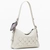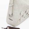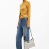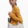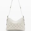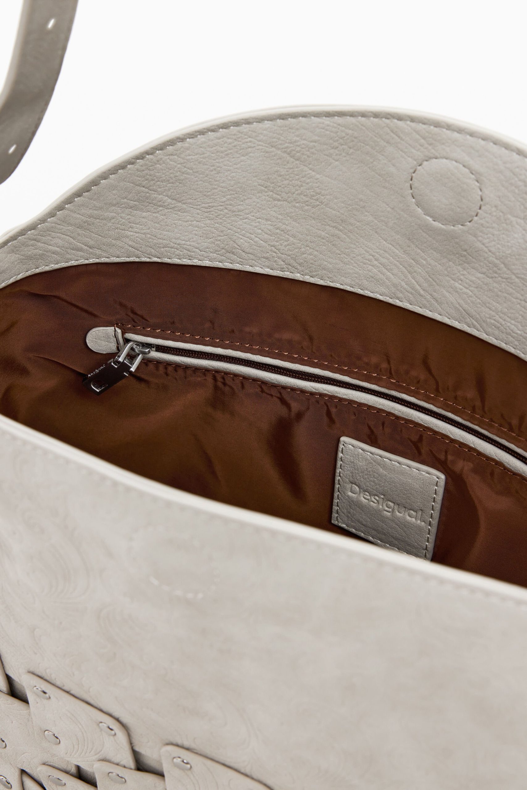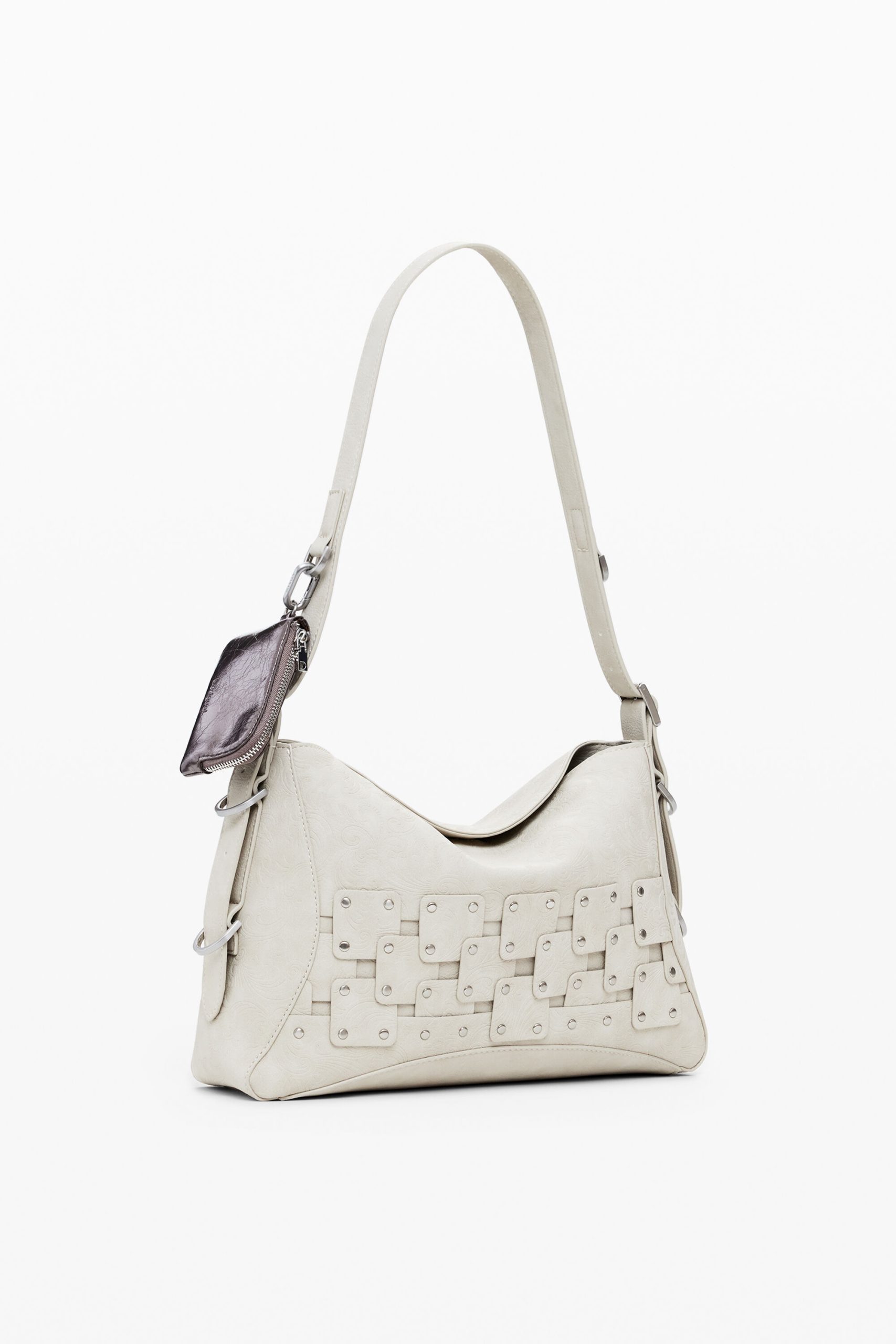 Patchwork-style handbag, in faux leather fabric, with metal stud details, adjustable handle, and detachable coin purse detail.
