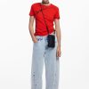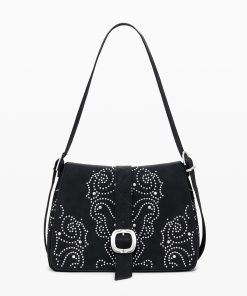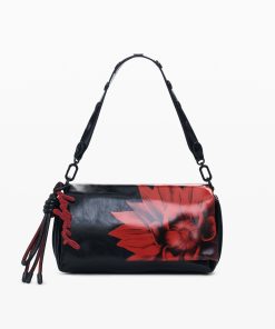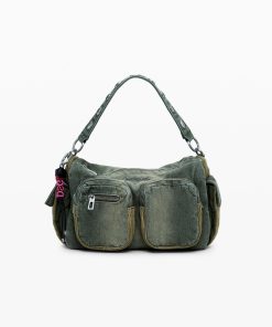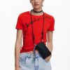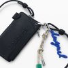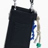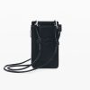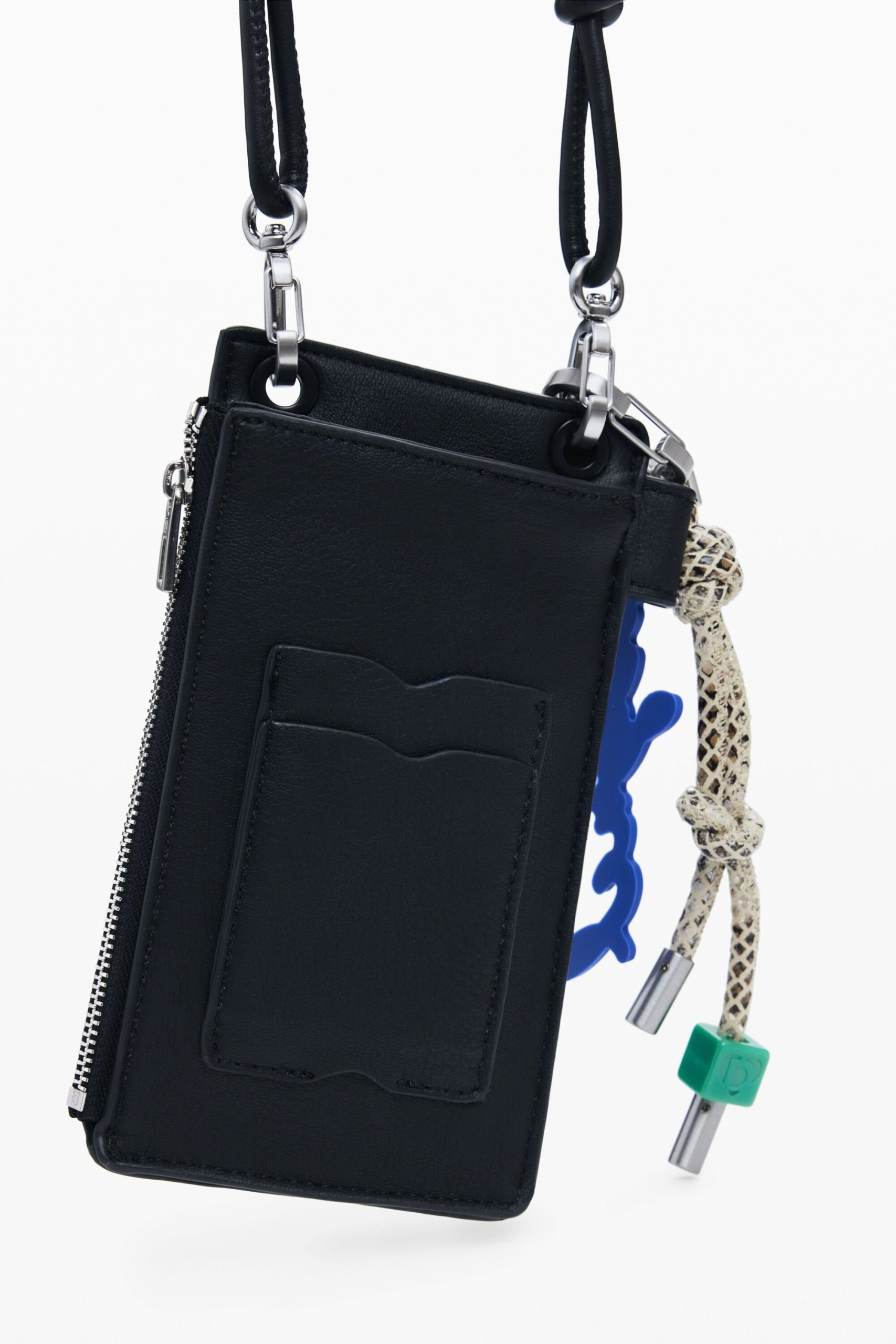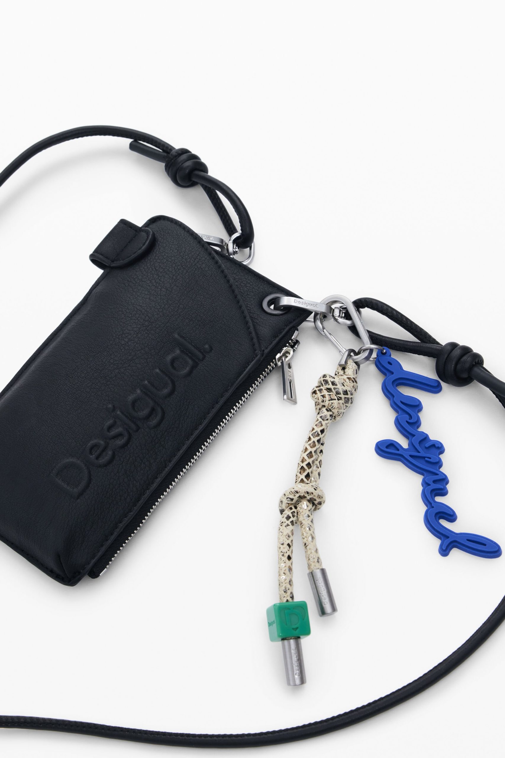 Mobile holder with zipper, different compartments, card slots, extendable strap, metallic logo, and decorative stitching.