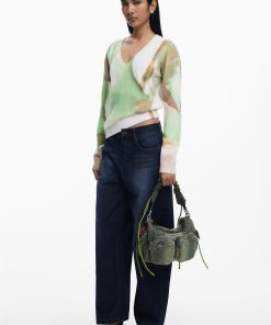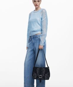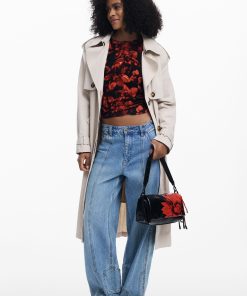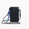 Mobile holder with zipper, different compartments, card slots, extendable strap, metallic logo, and decorative stitching.