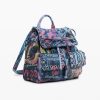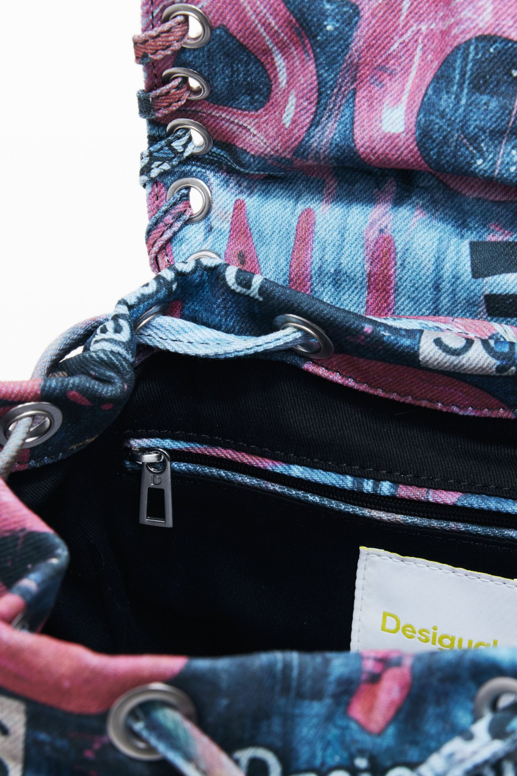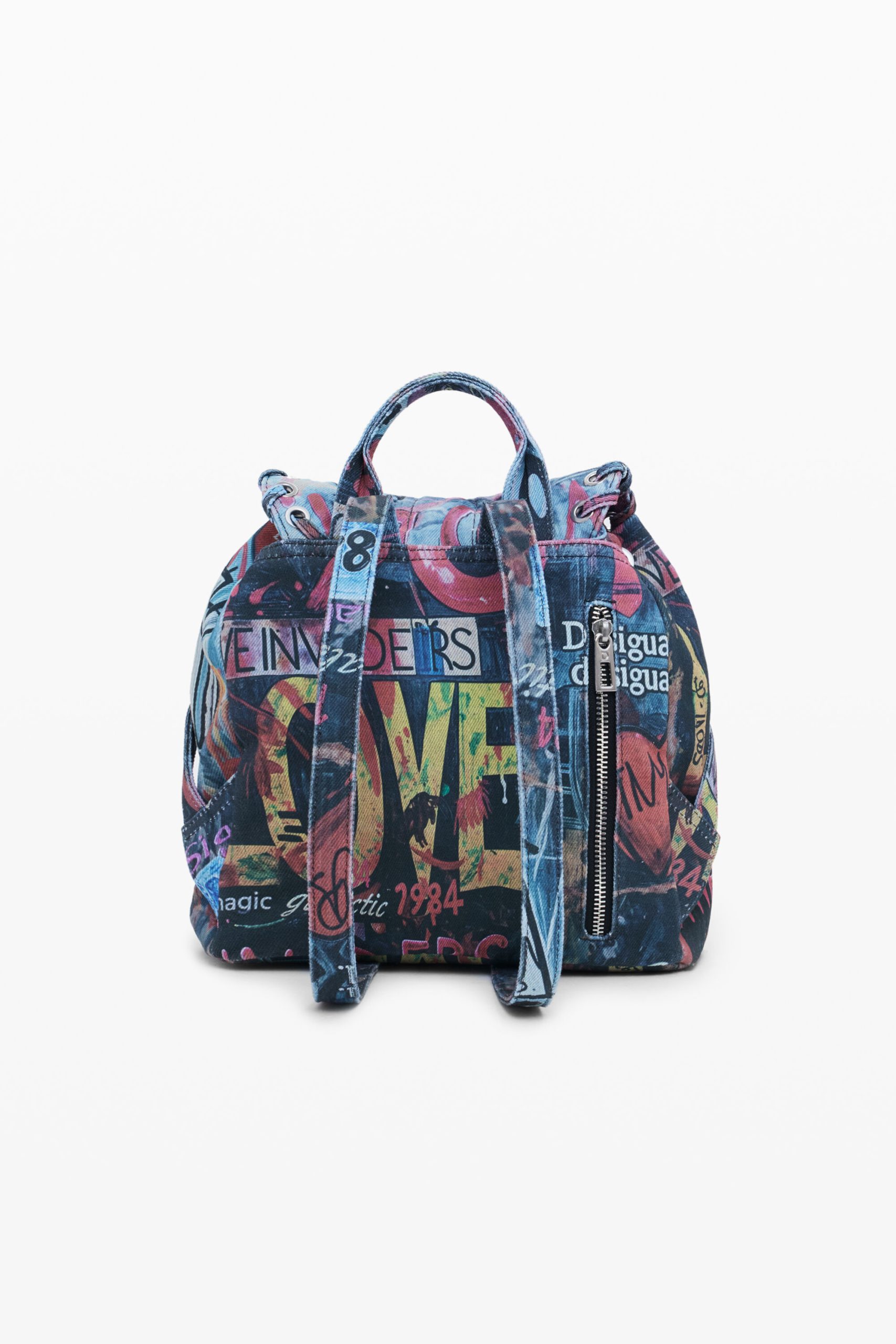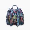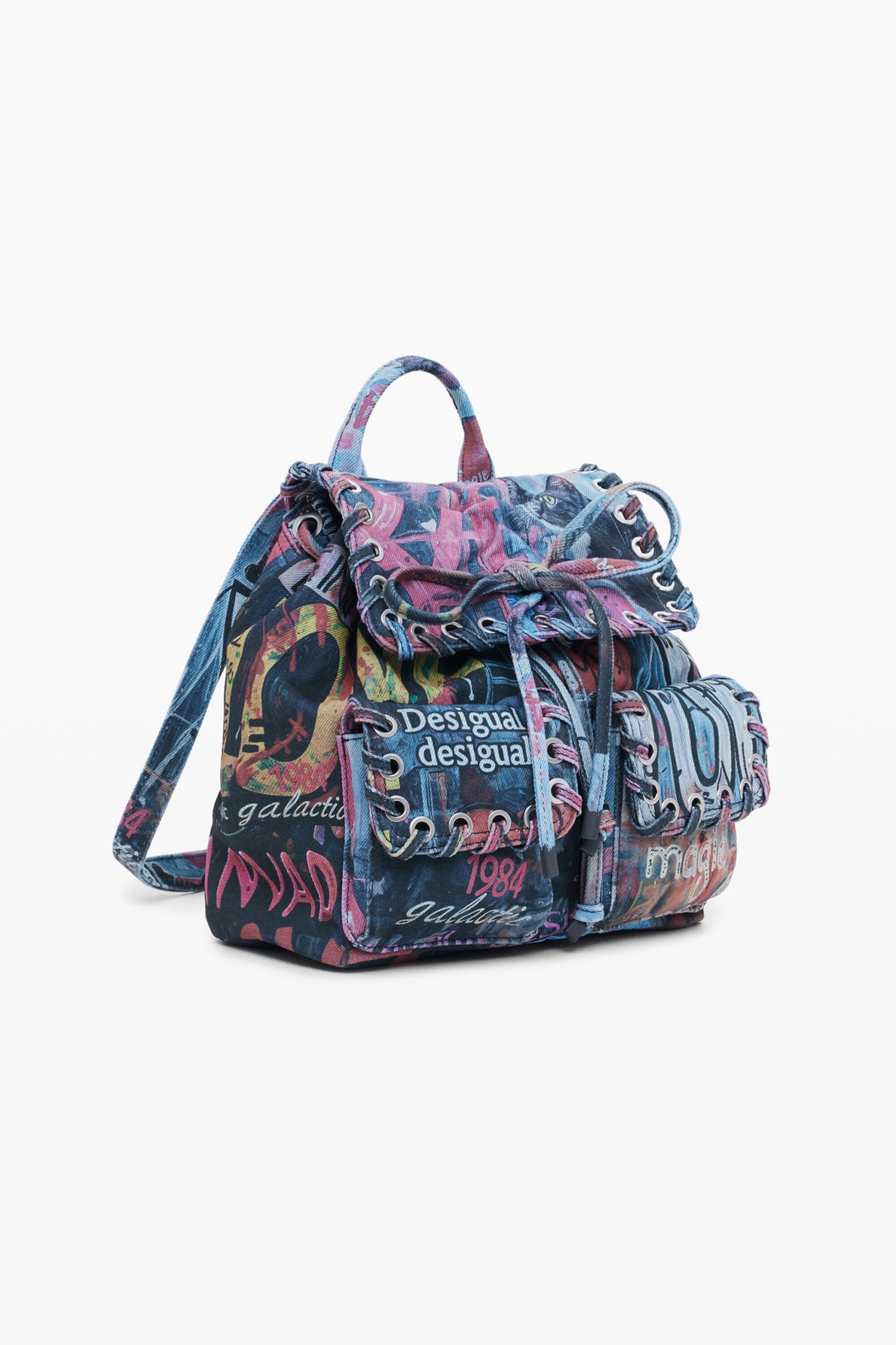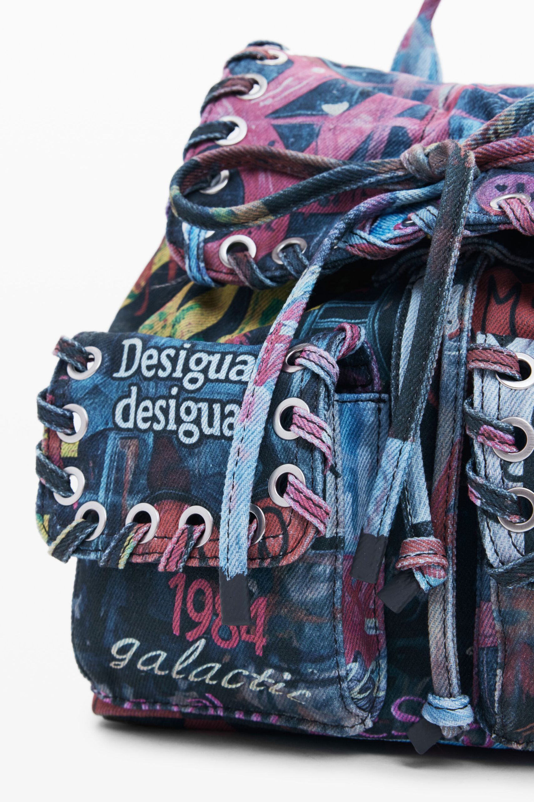 Small backpack with flap, front pockets, braided details, and graffiti-style print with cat image.