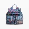 Small backpack with flap, front pockets, braided details, and graffiti-style print with cat image.
