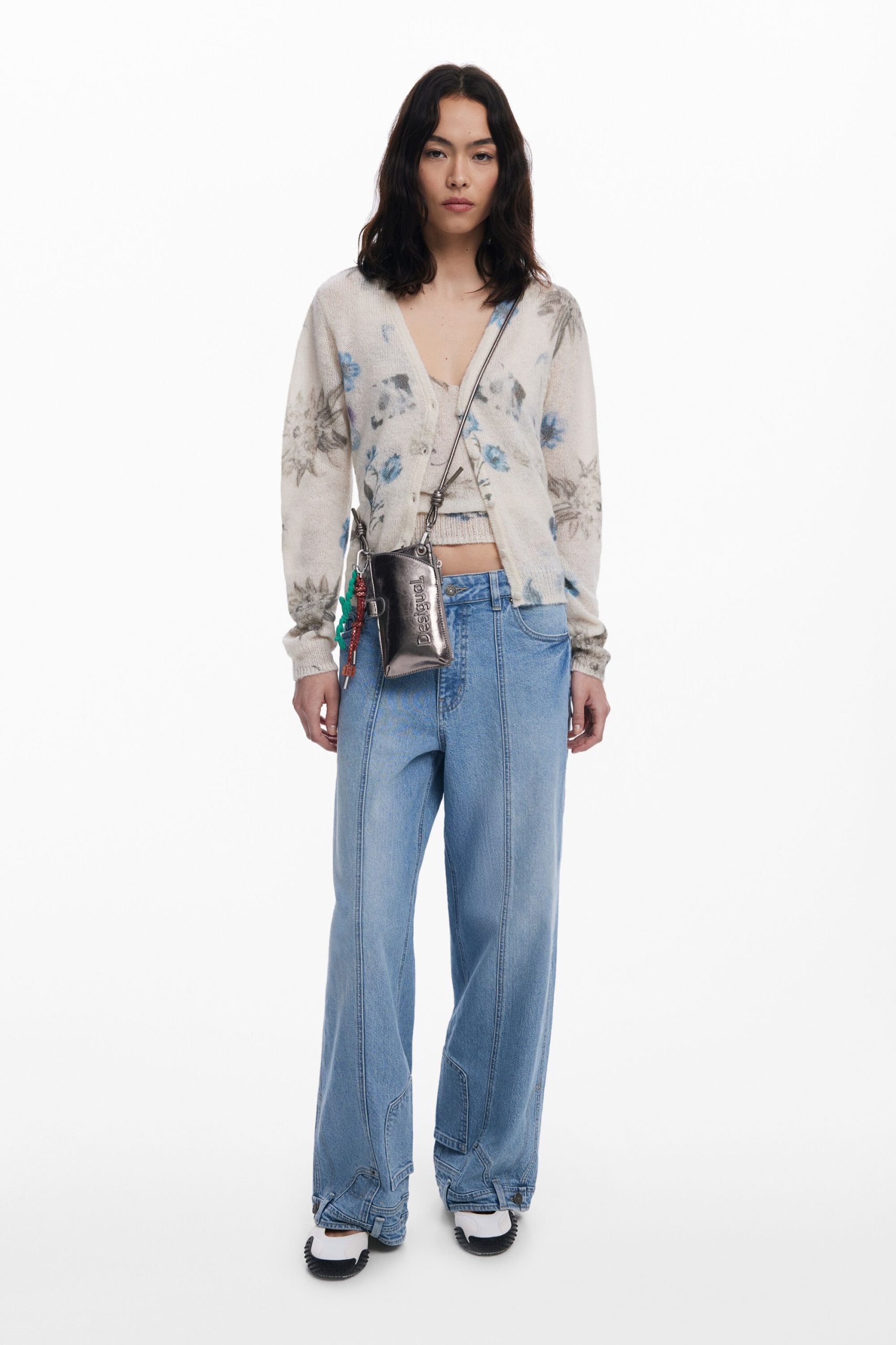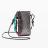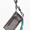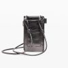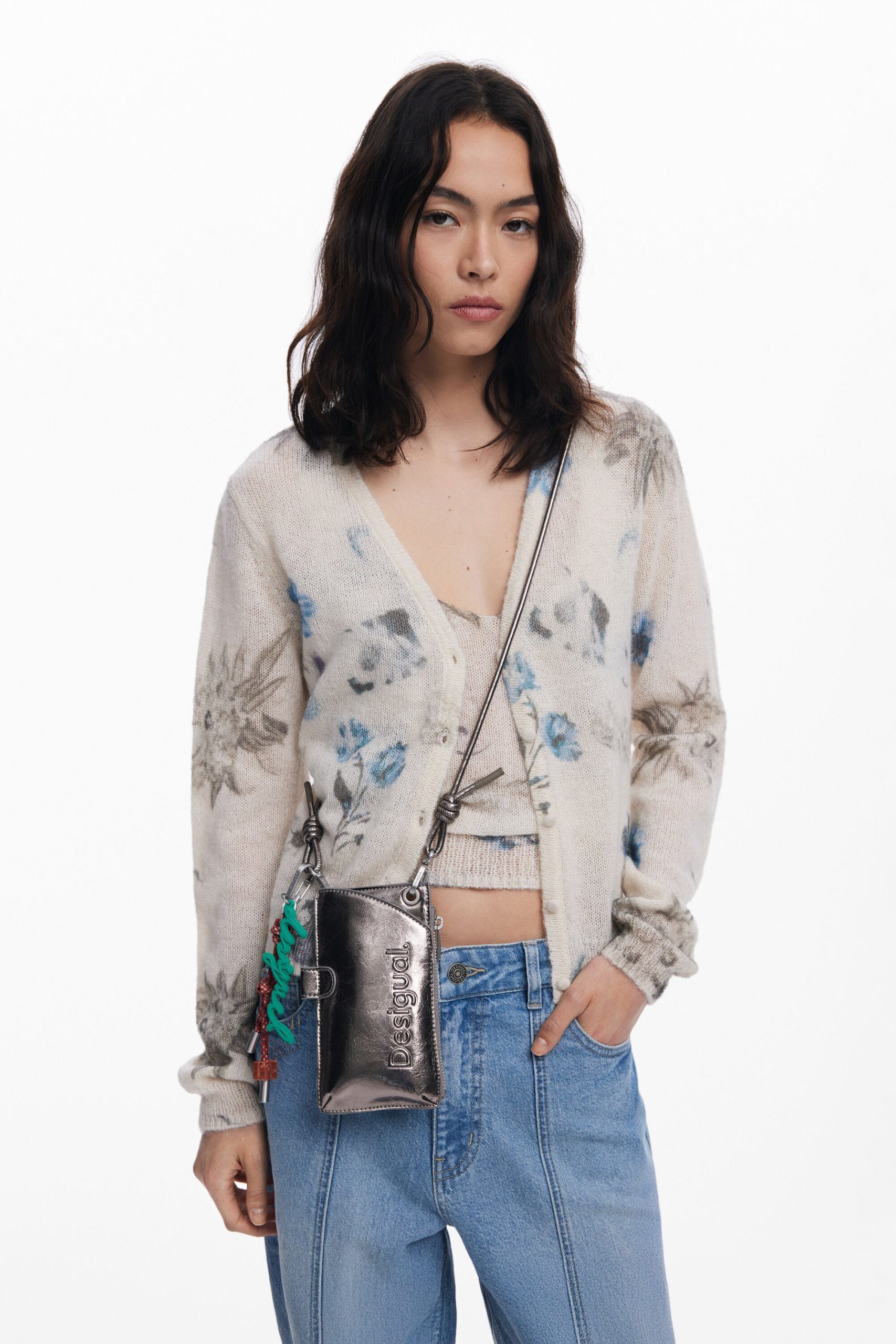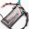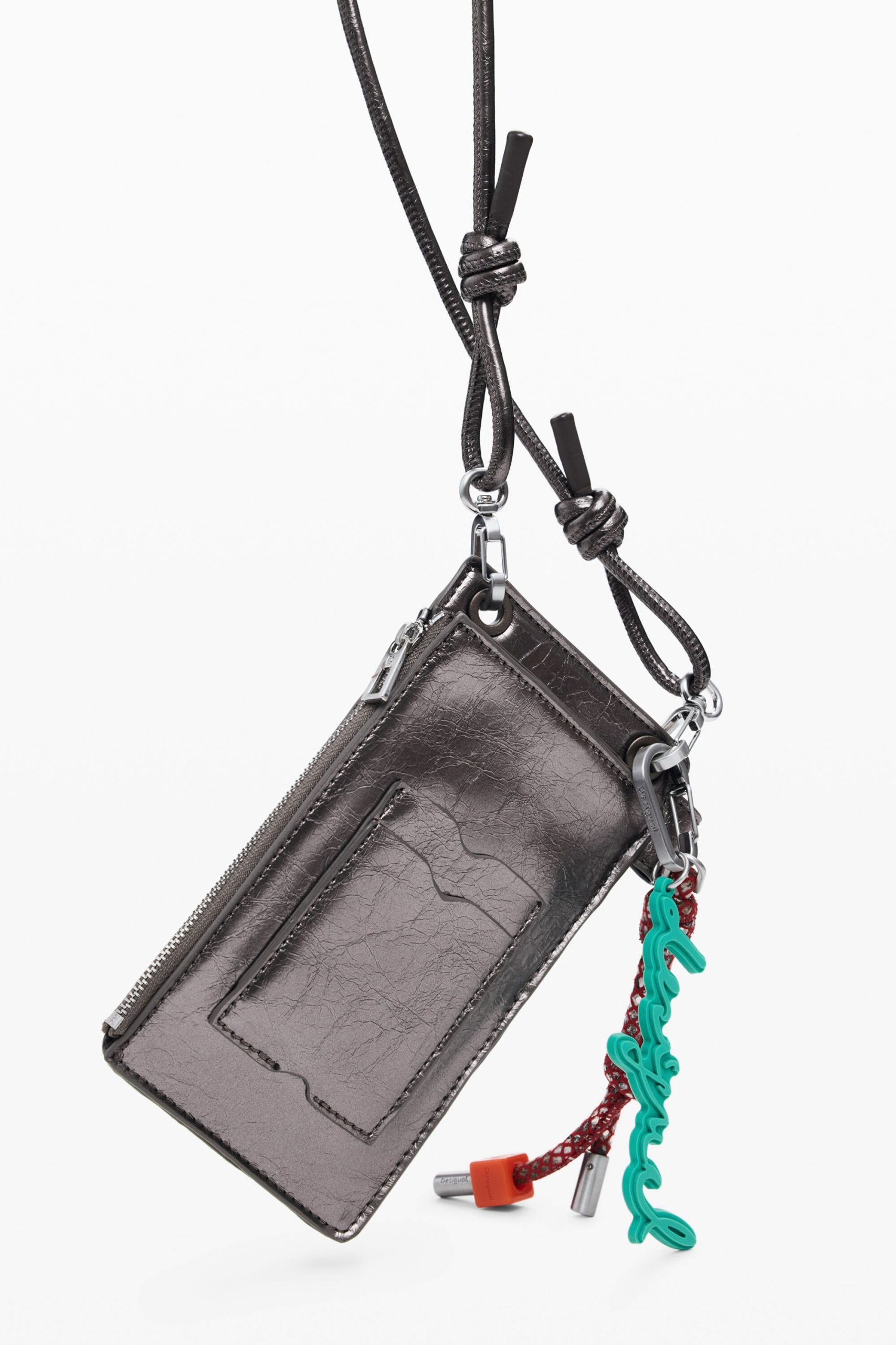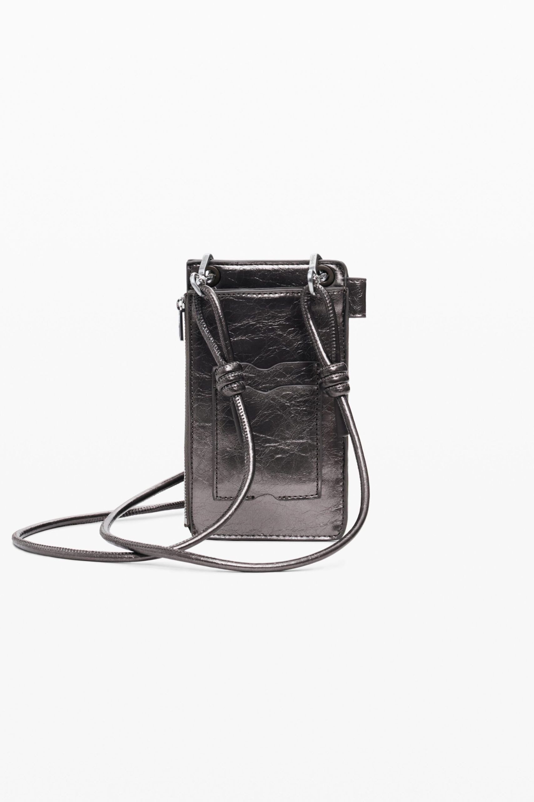Mobile phone style wallet, in faux leather fabric, with metallic finish, 3D effect logo, detachable keychain, and zipper closure.