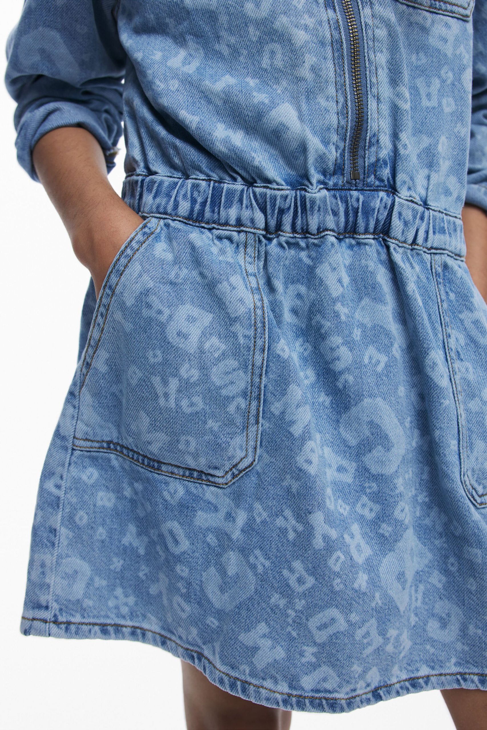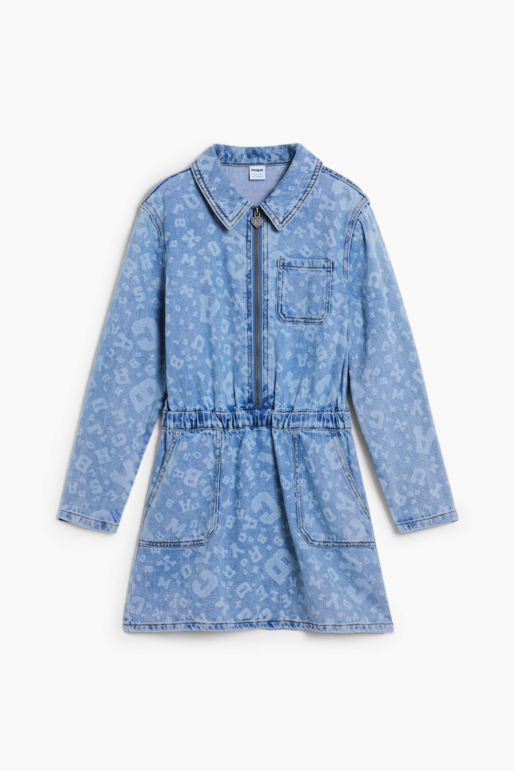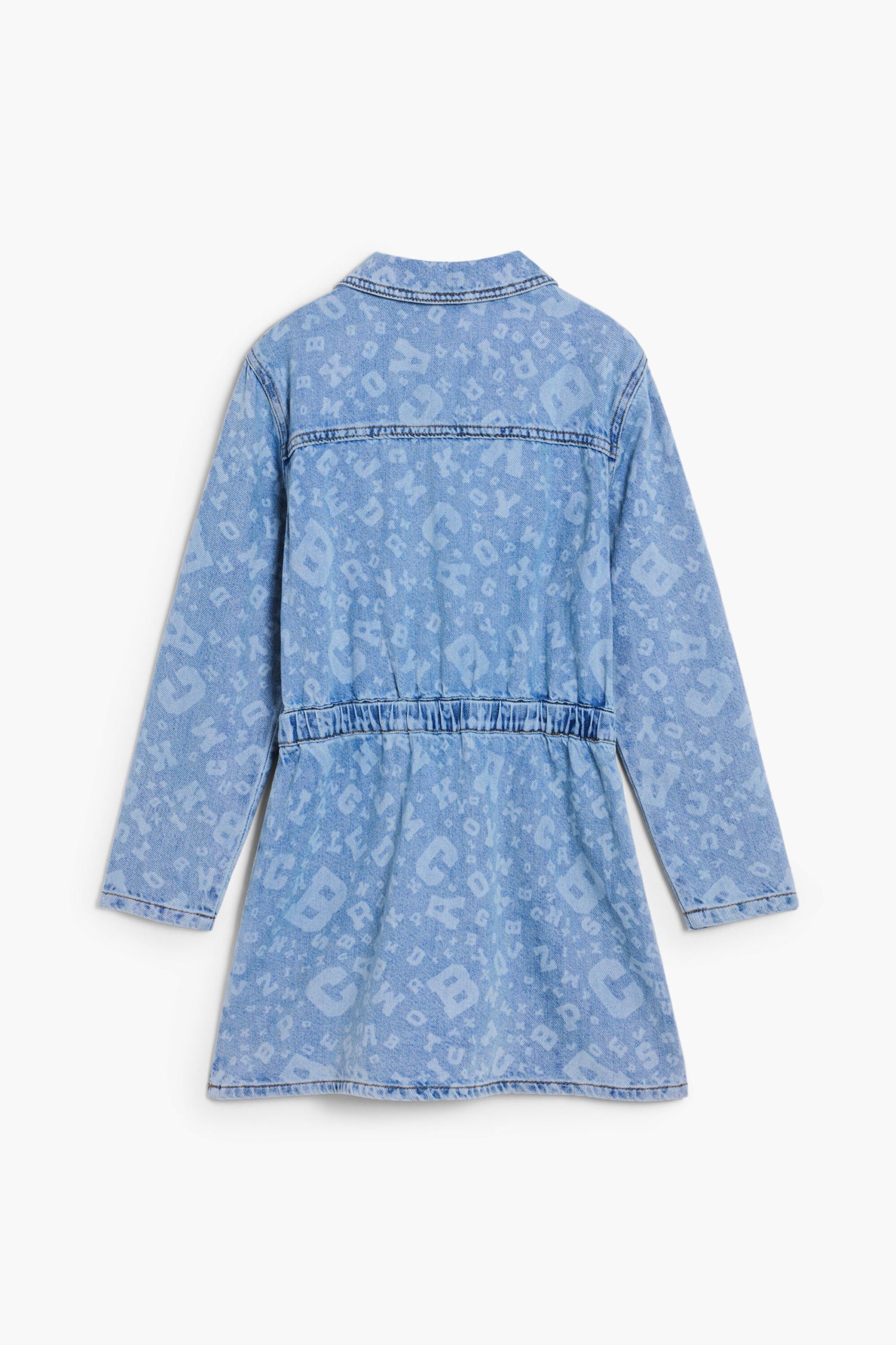 Blue denim dress with medium wash, three-quarter sleeve structure, and classic collar. Visible contrasting stitching detail and front button closure. Outer fabric made entirely of organic cotton.
