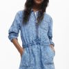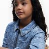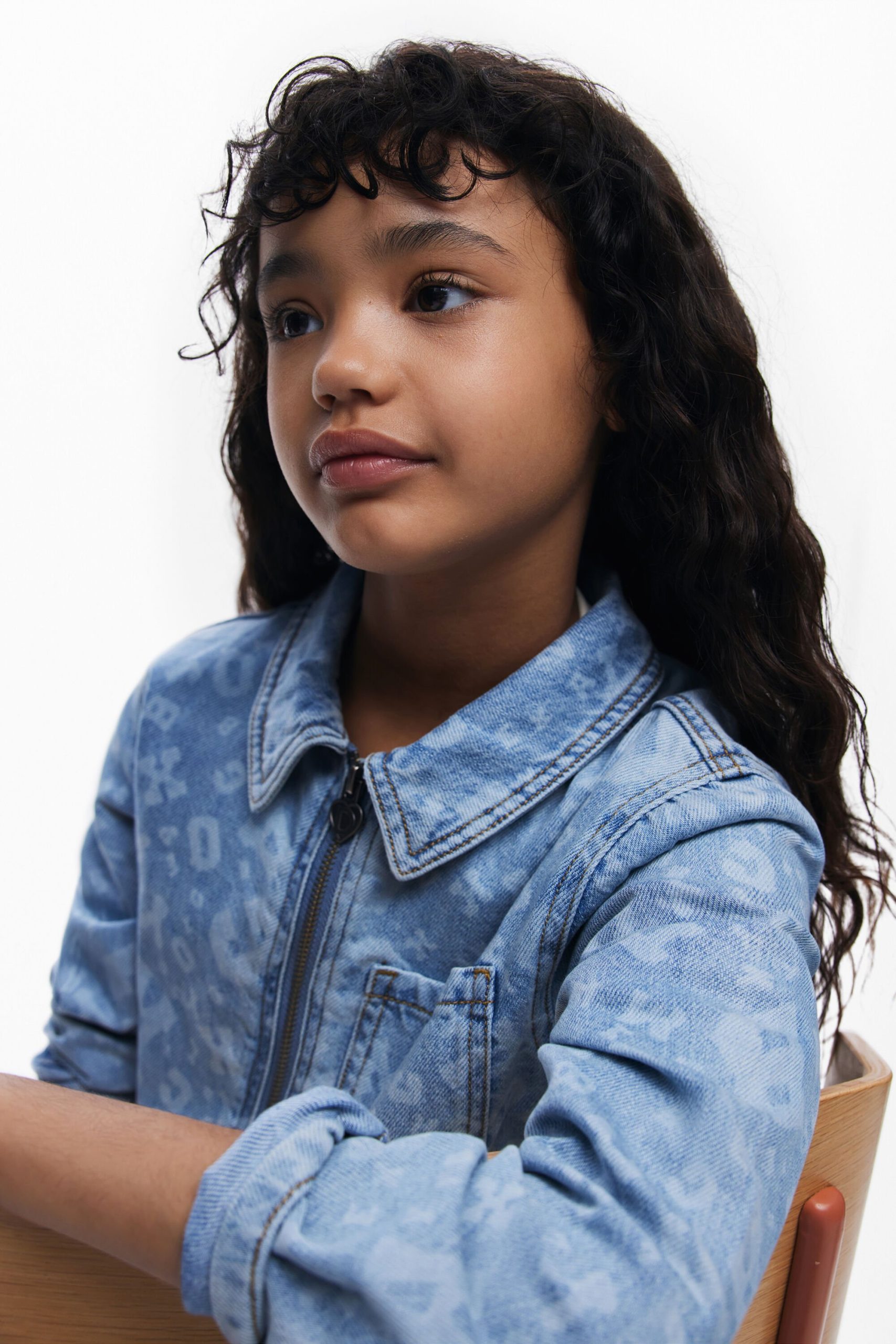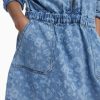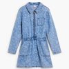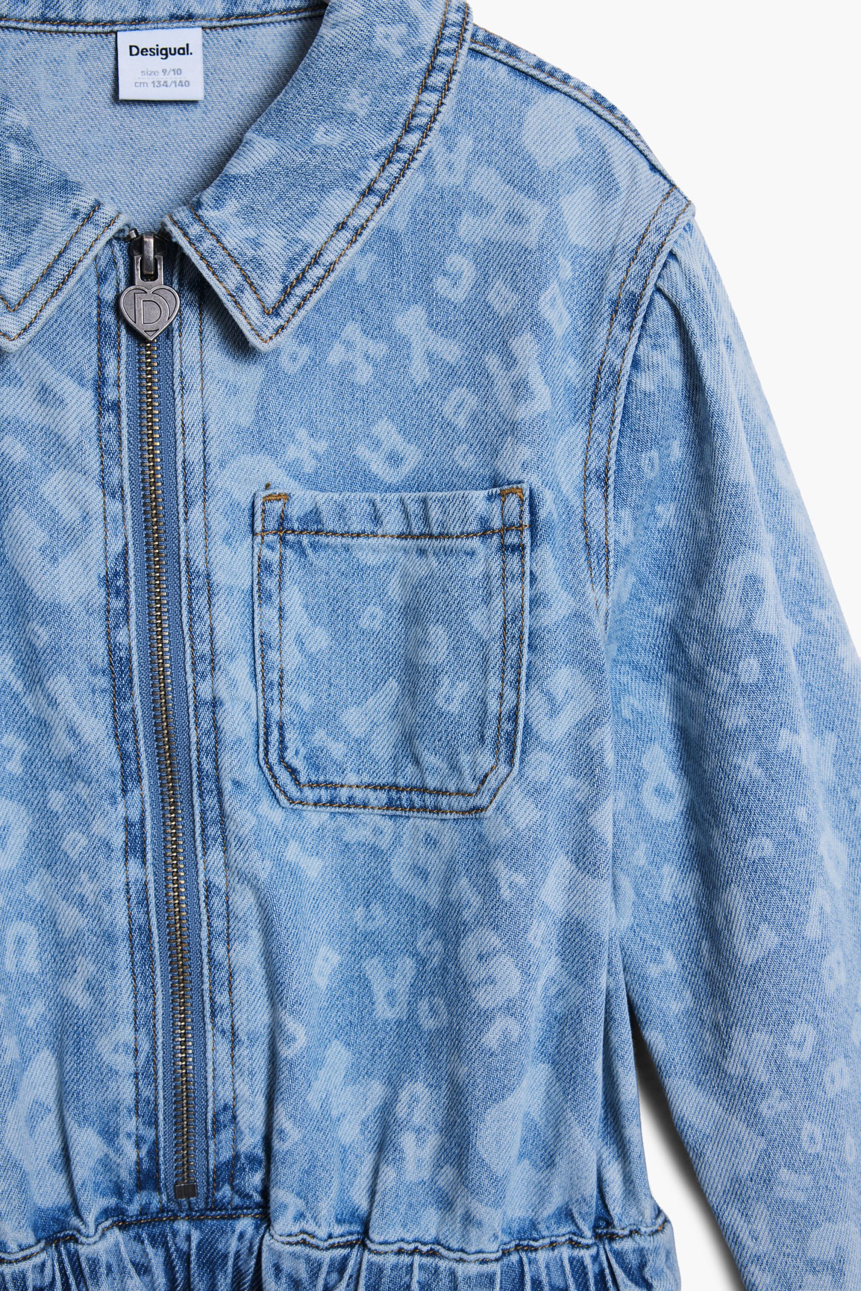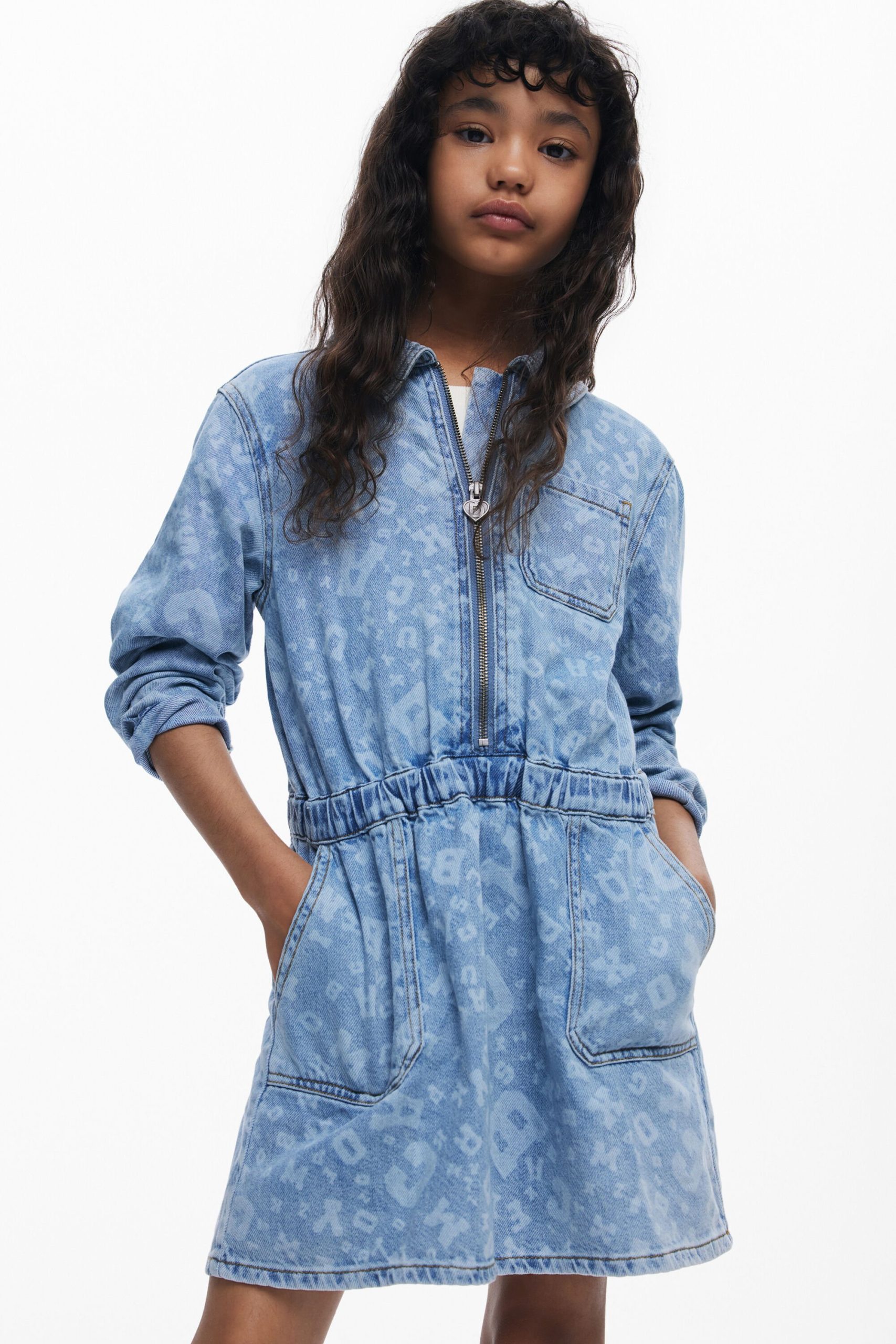 Blue denim dress with medium wash, three-quarter sleeve structure, and classic collar. Visible contrasting stitching detail and front button closure. Outer fabric made entirely of organic cotton.