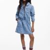 Blue denim dress with medium wash, three-quarter sleeve structure, and classic collar. Visible contrasting stitching detail and front button closure. Outer fabric made entirely of organic cotton.