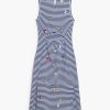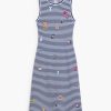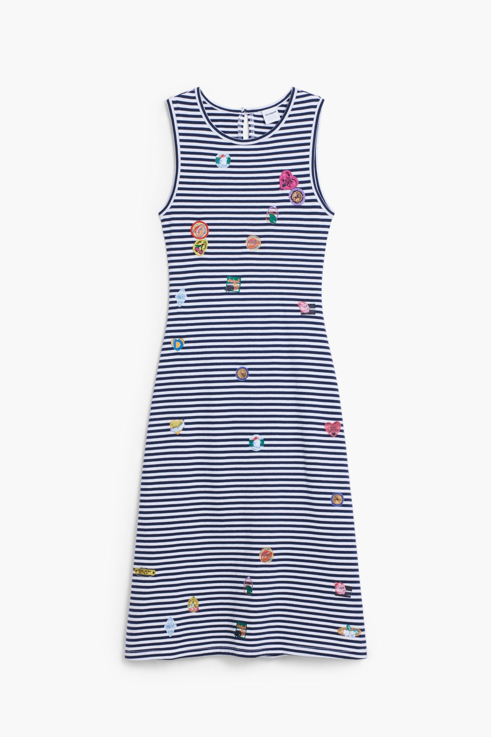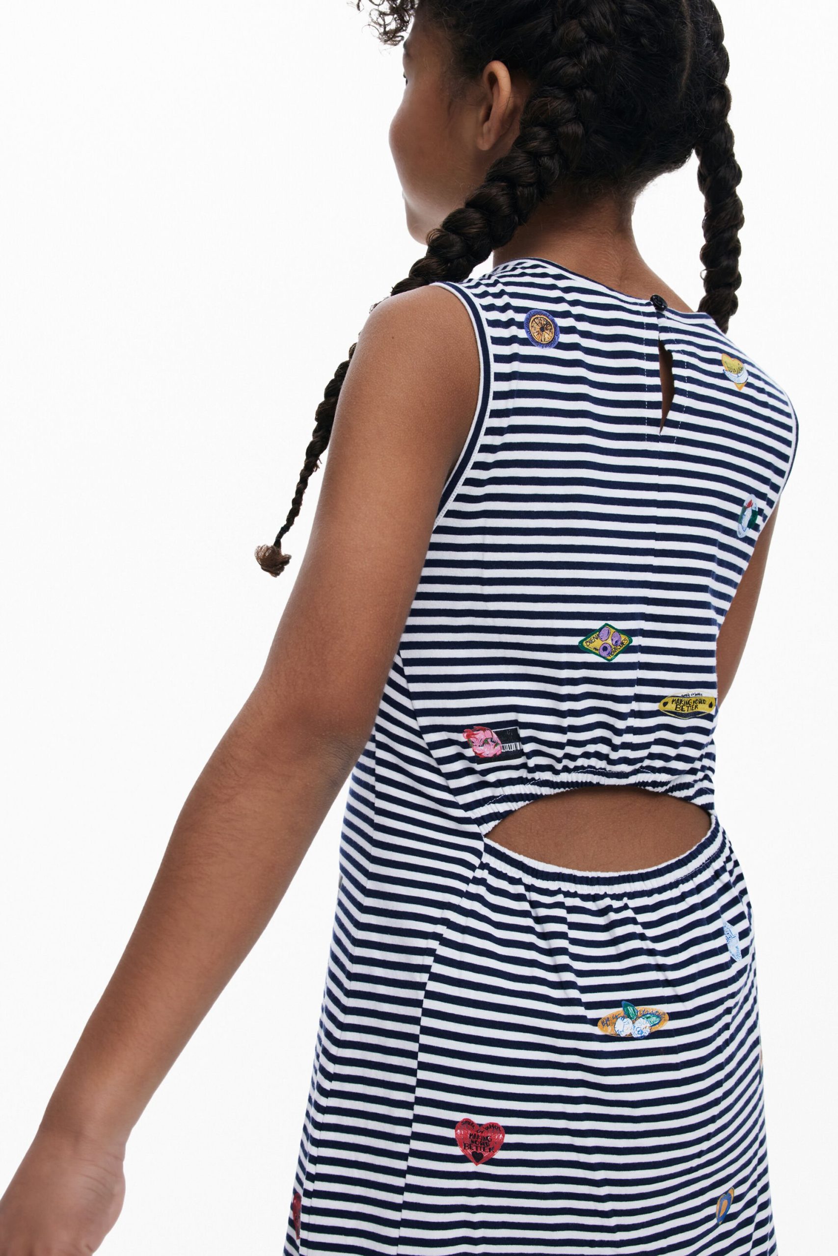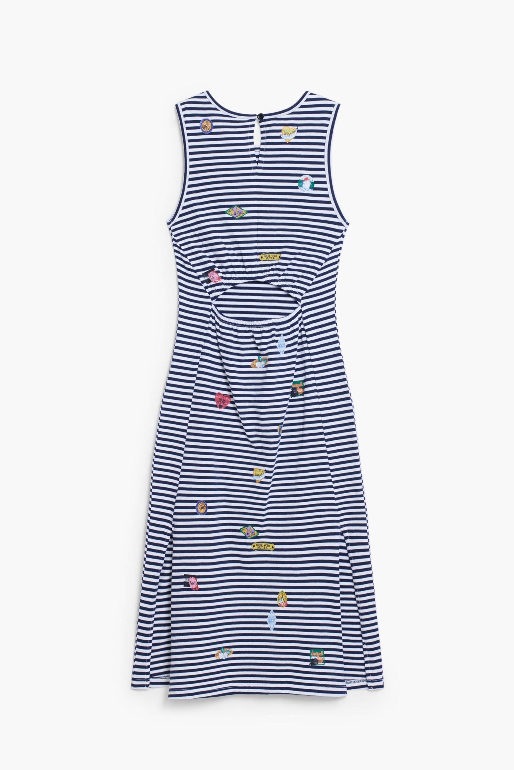 Sleeveless midi dress with cut-out back, horizontal stripe print, and embroidered details.