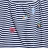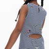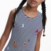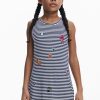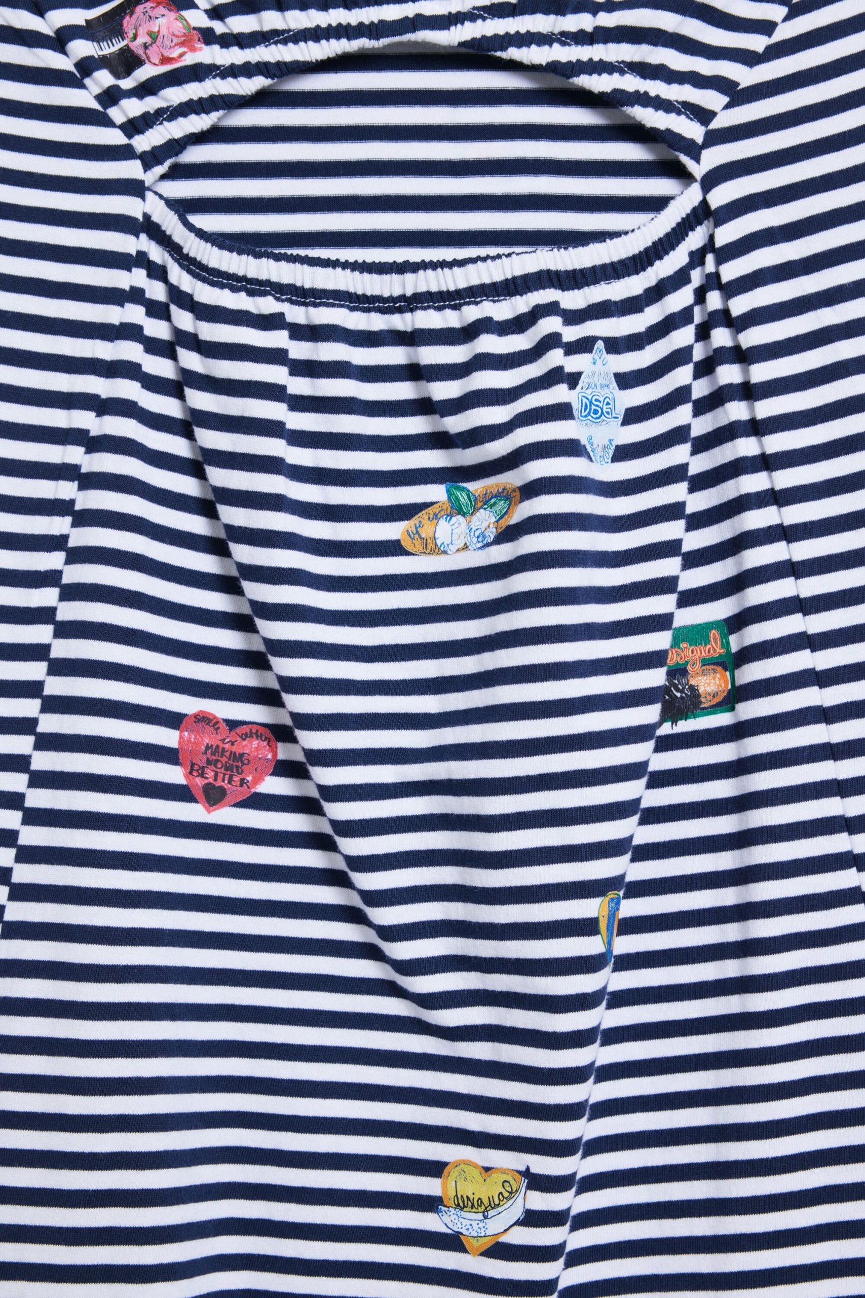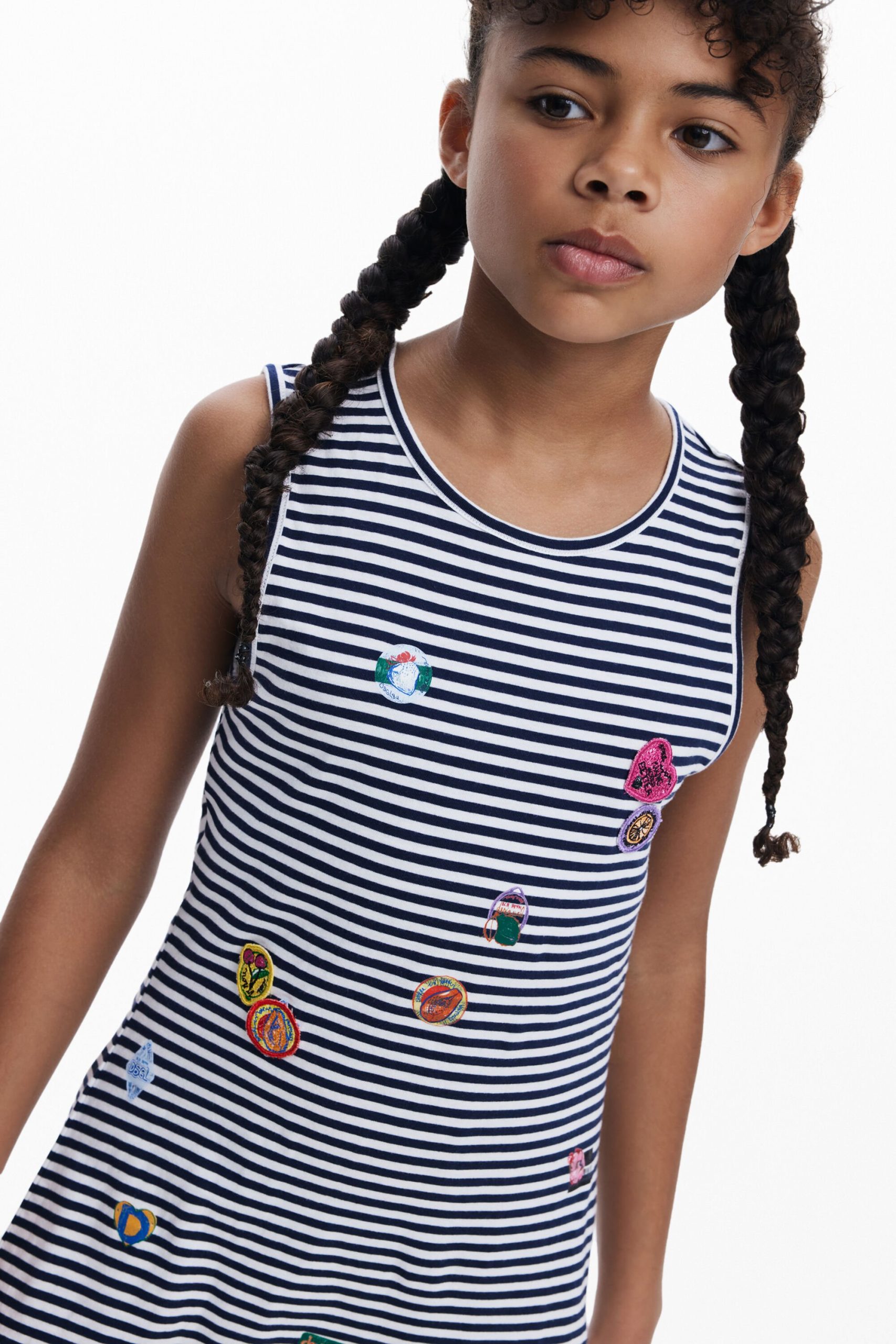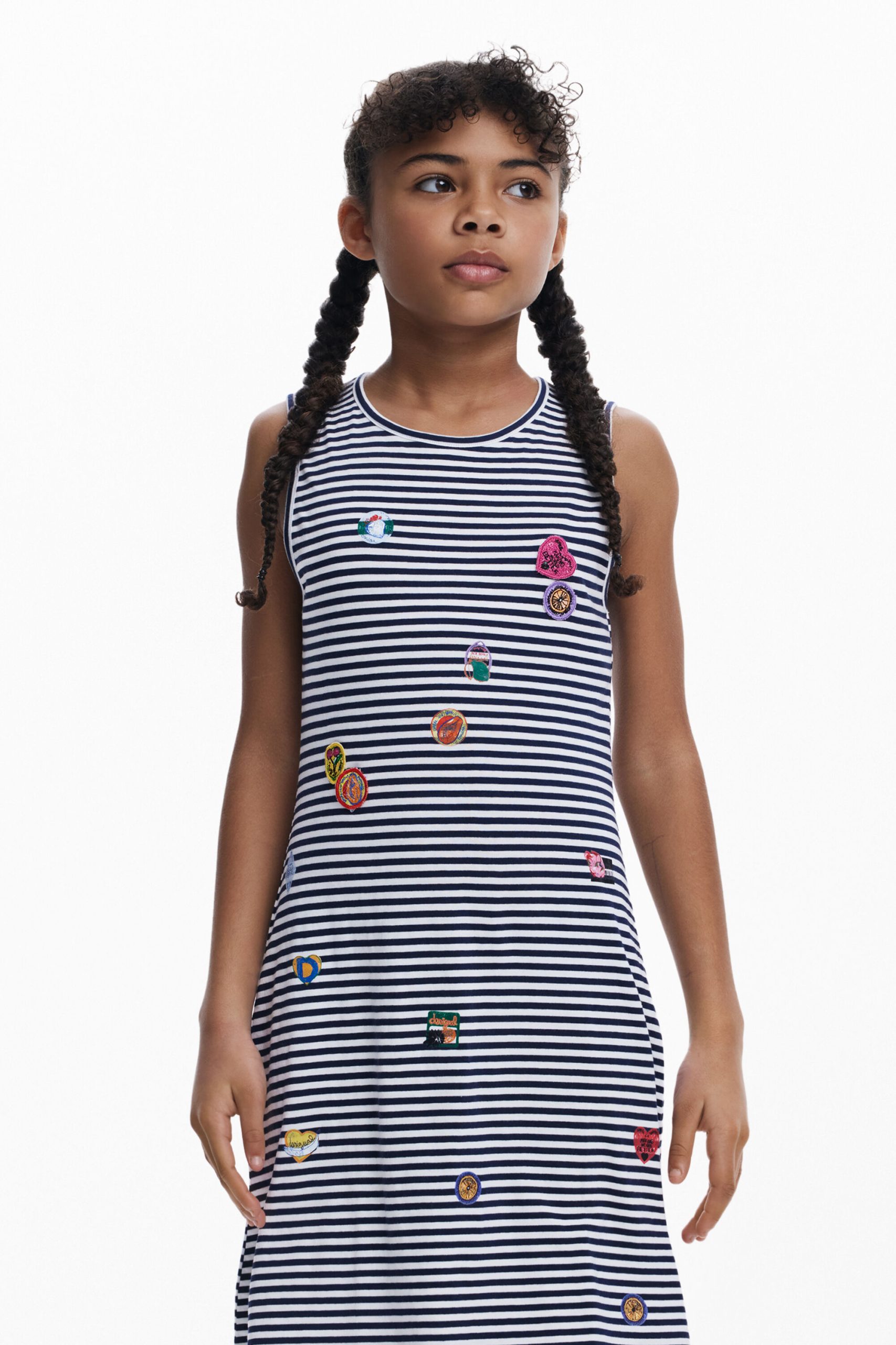 Sleeveless midi dress with cut-out back, horizontal stripe print, and embroidered details.