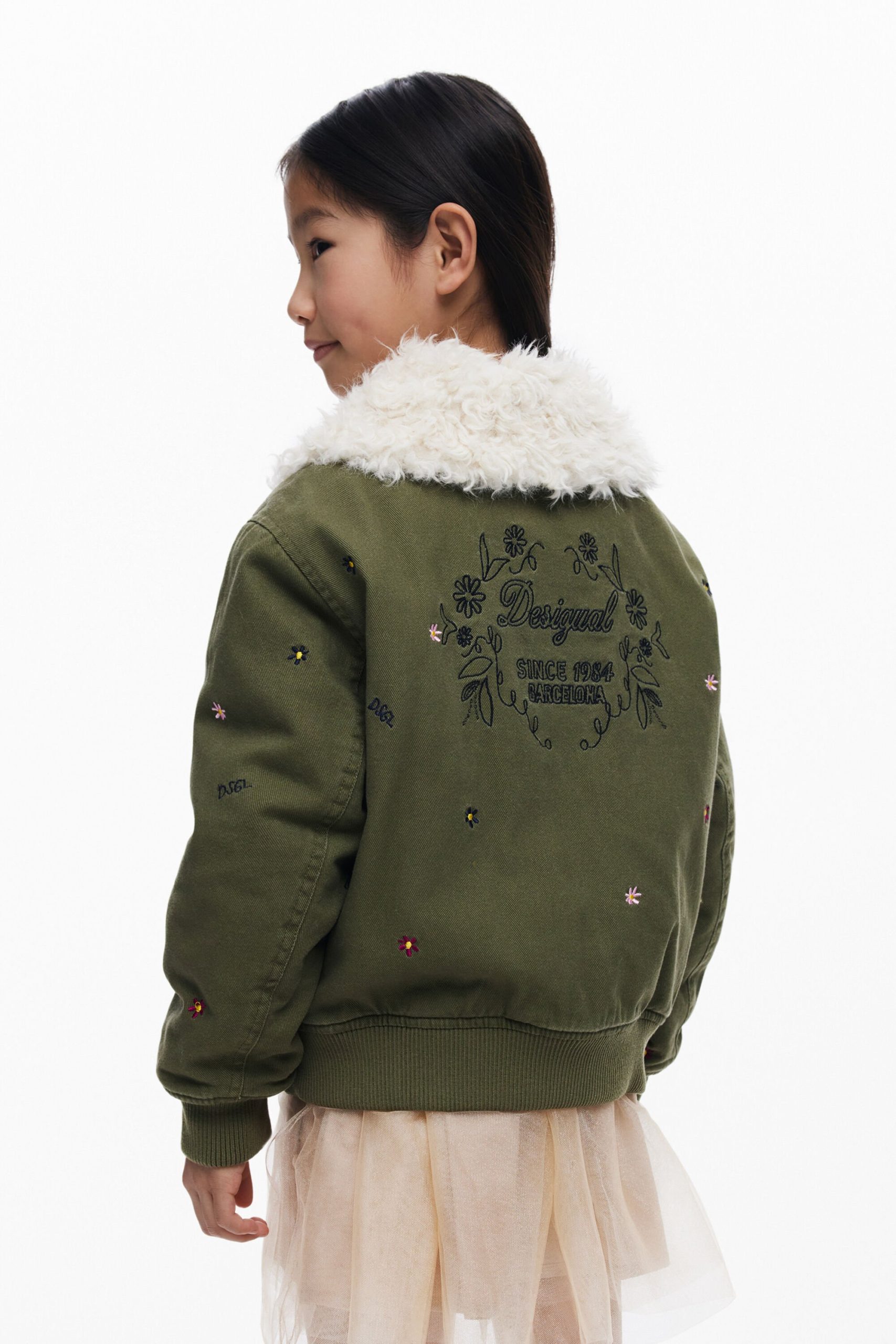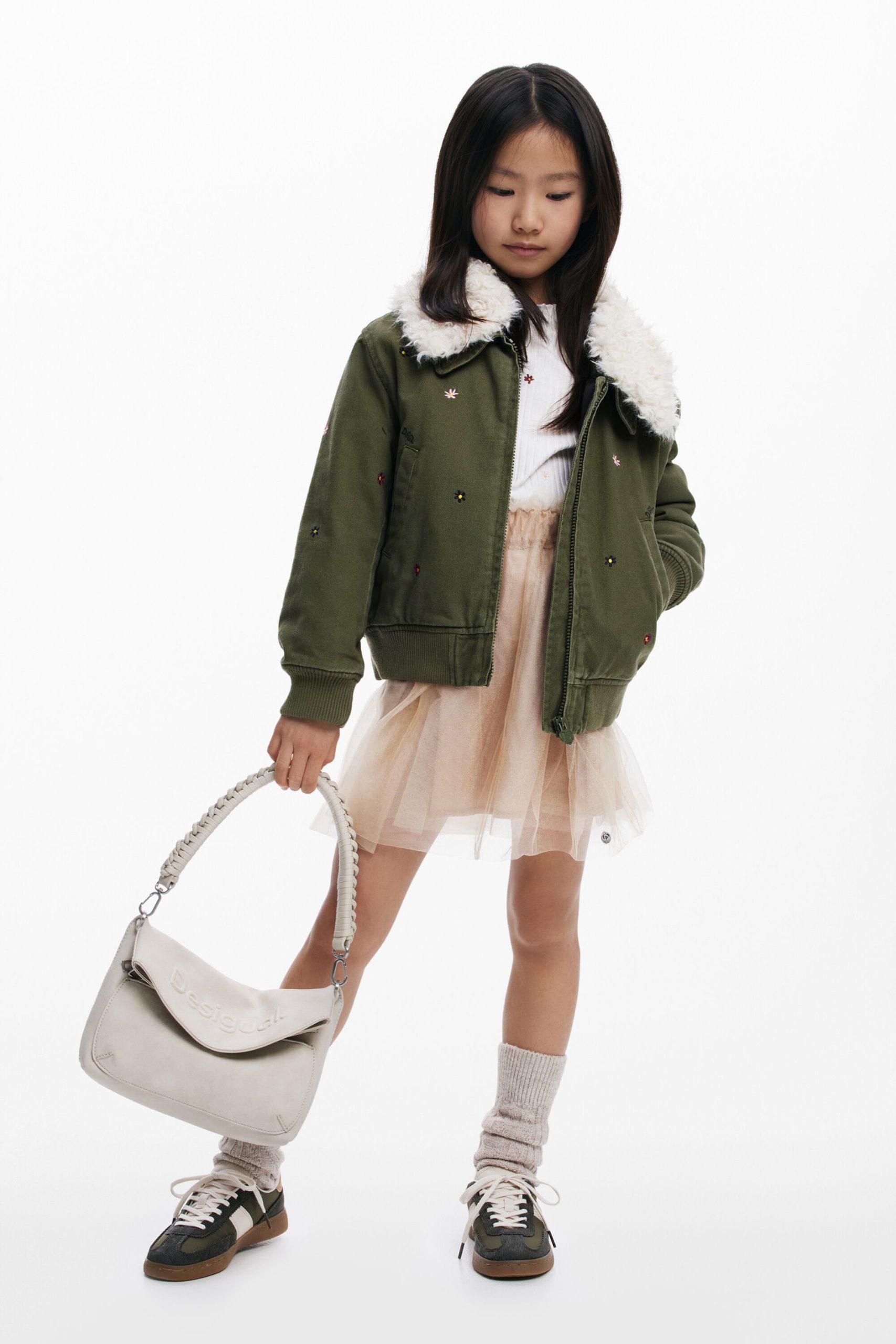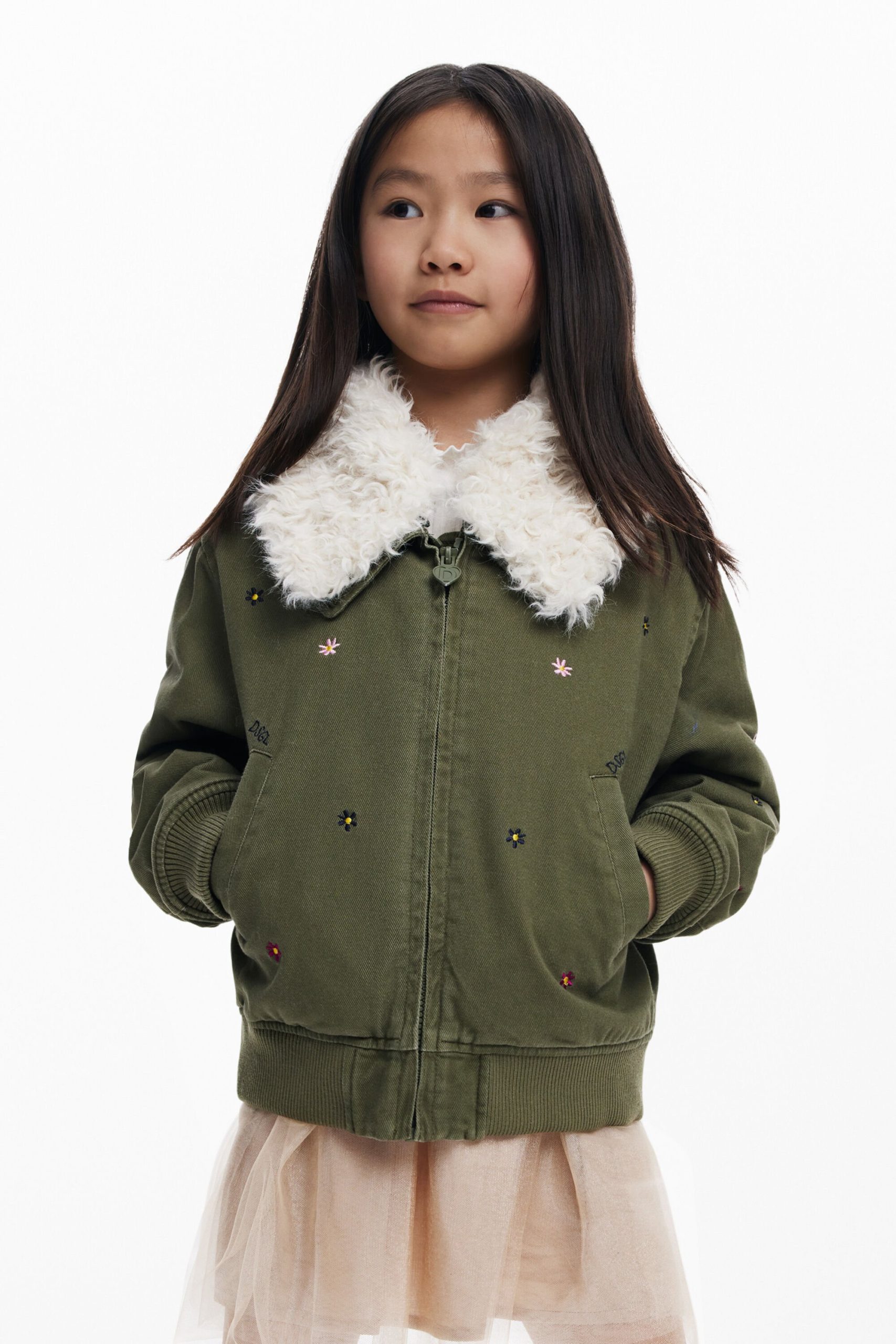 Short aviator-style jacket with side pockets, zipper closure, embroidered details, and removable faux fur collar.