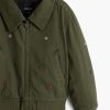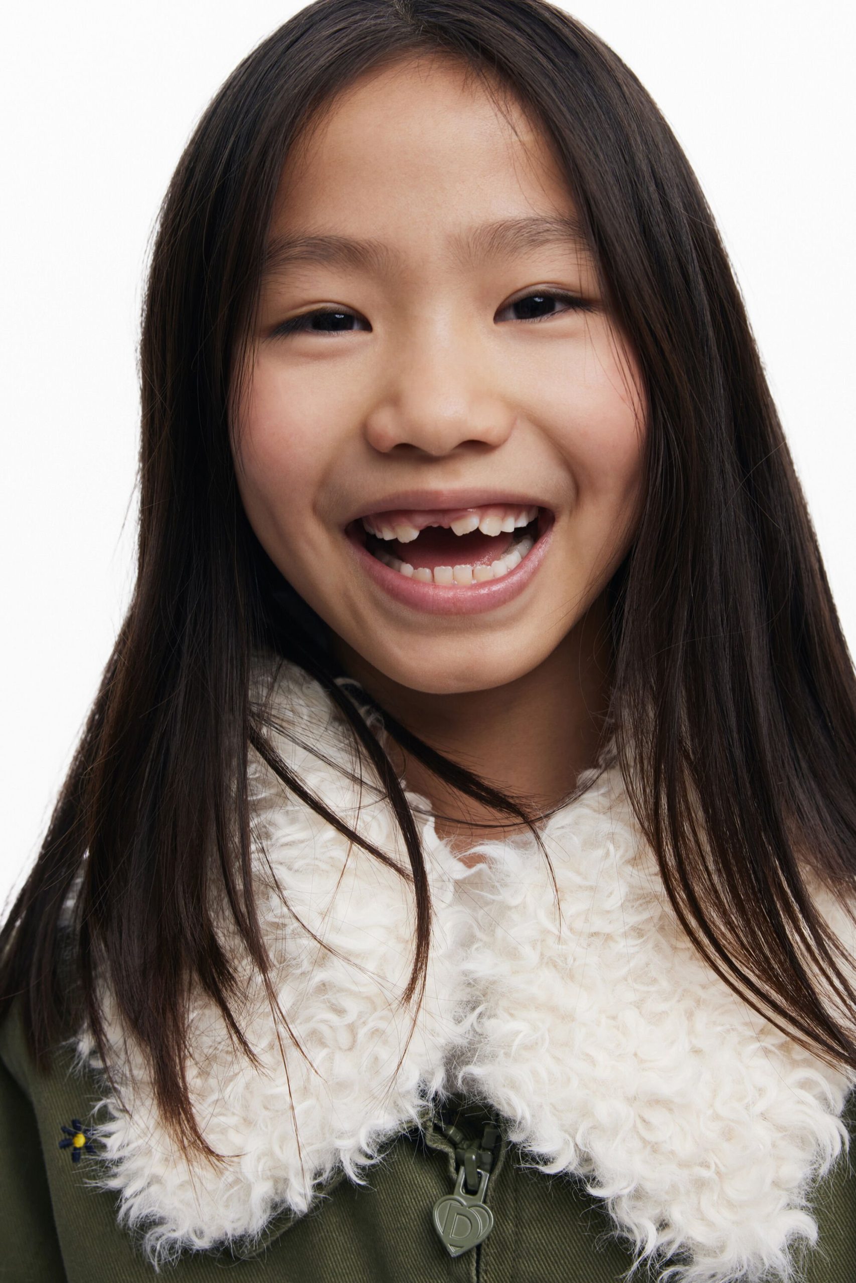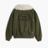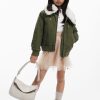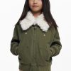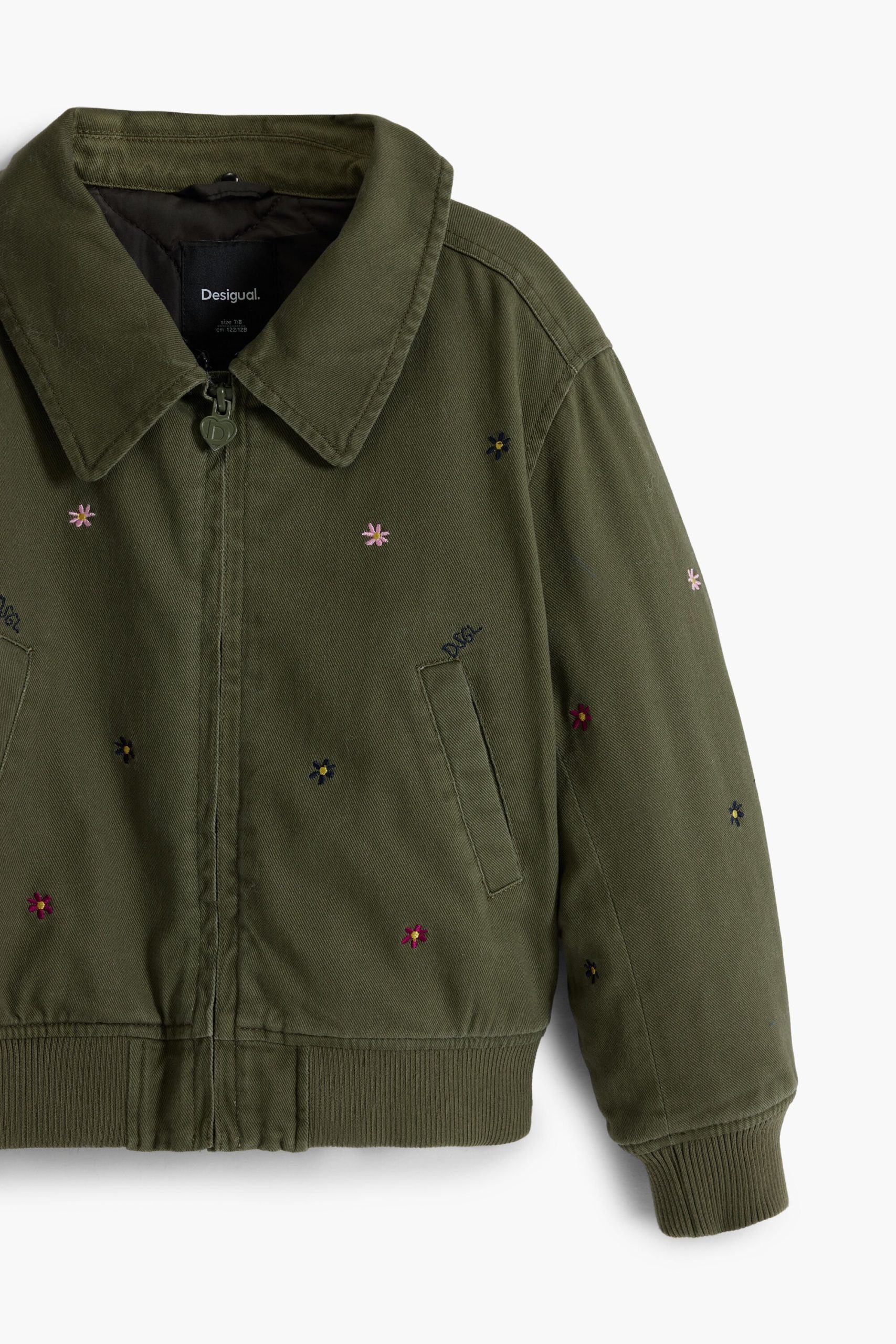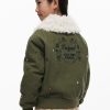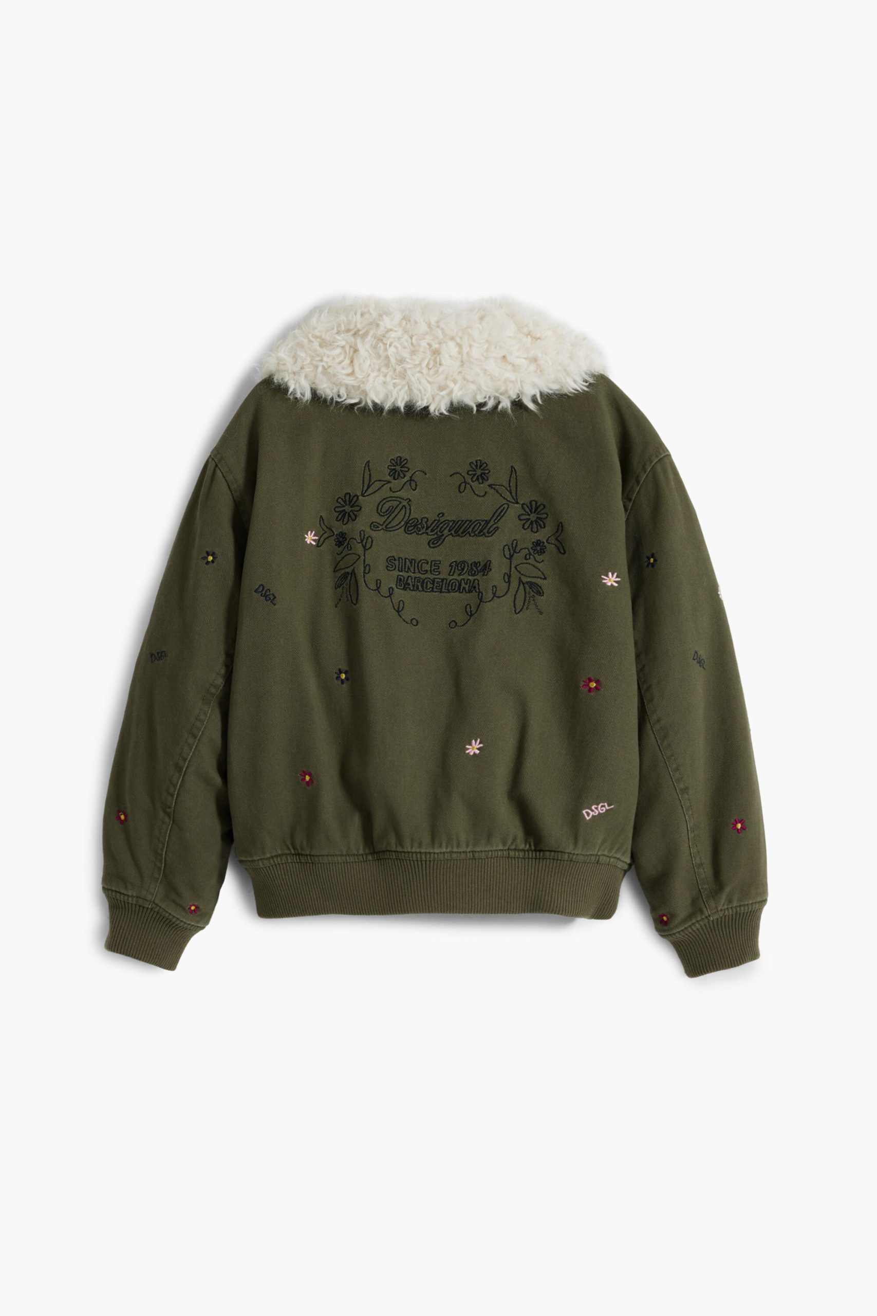 Short aviator-style jacket with side pockets, zipper closure, embroidered details, and removable faux fur collar.