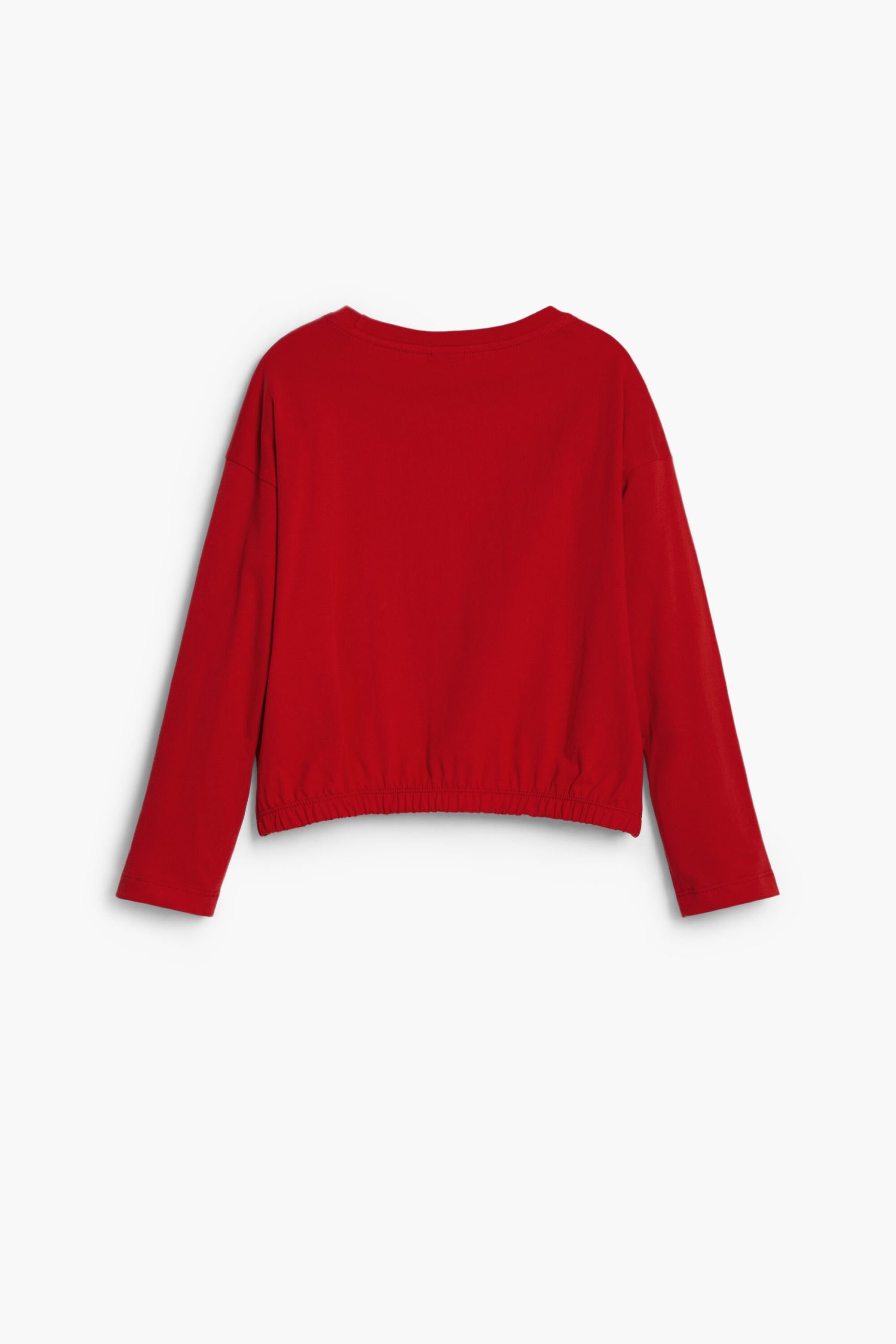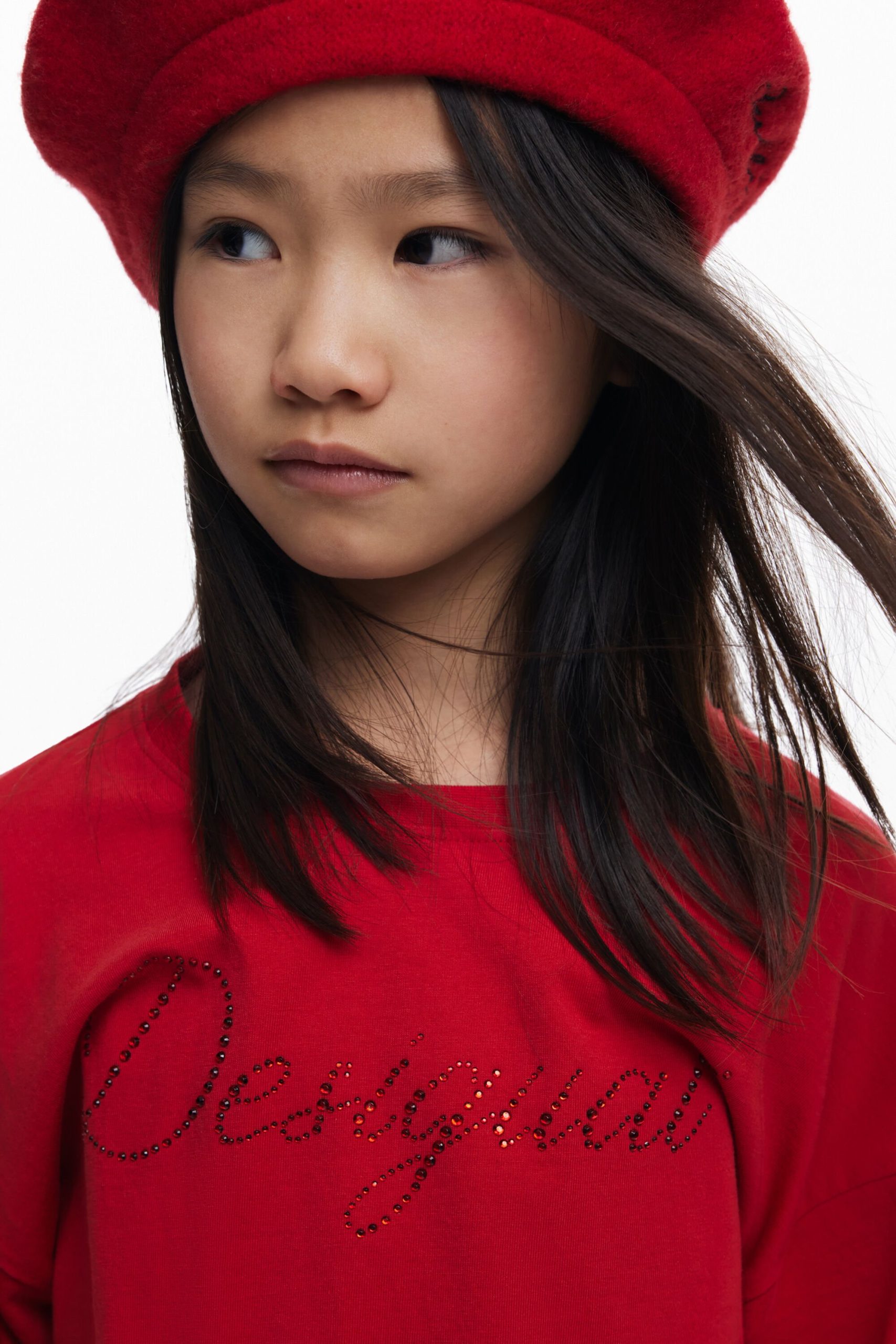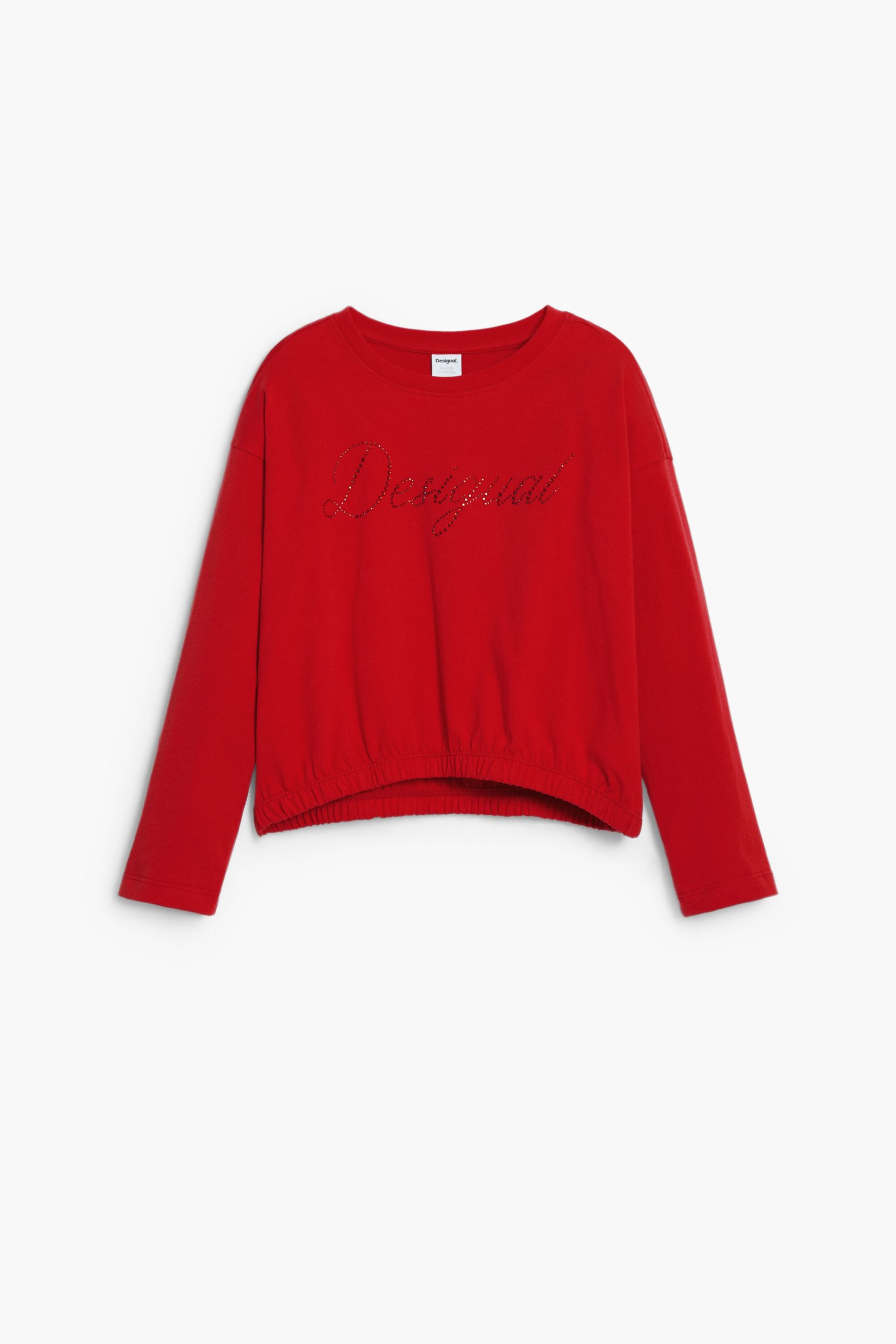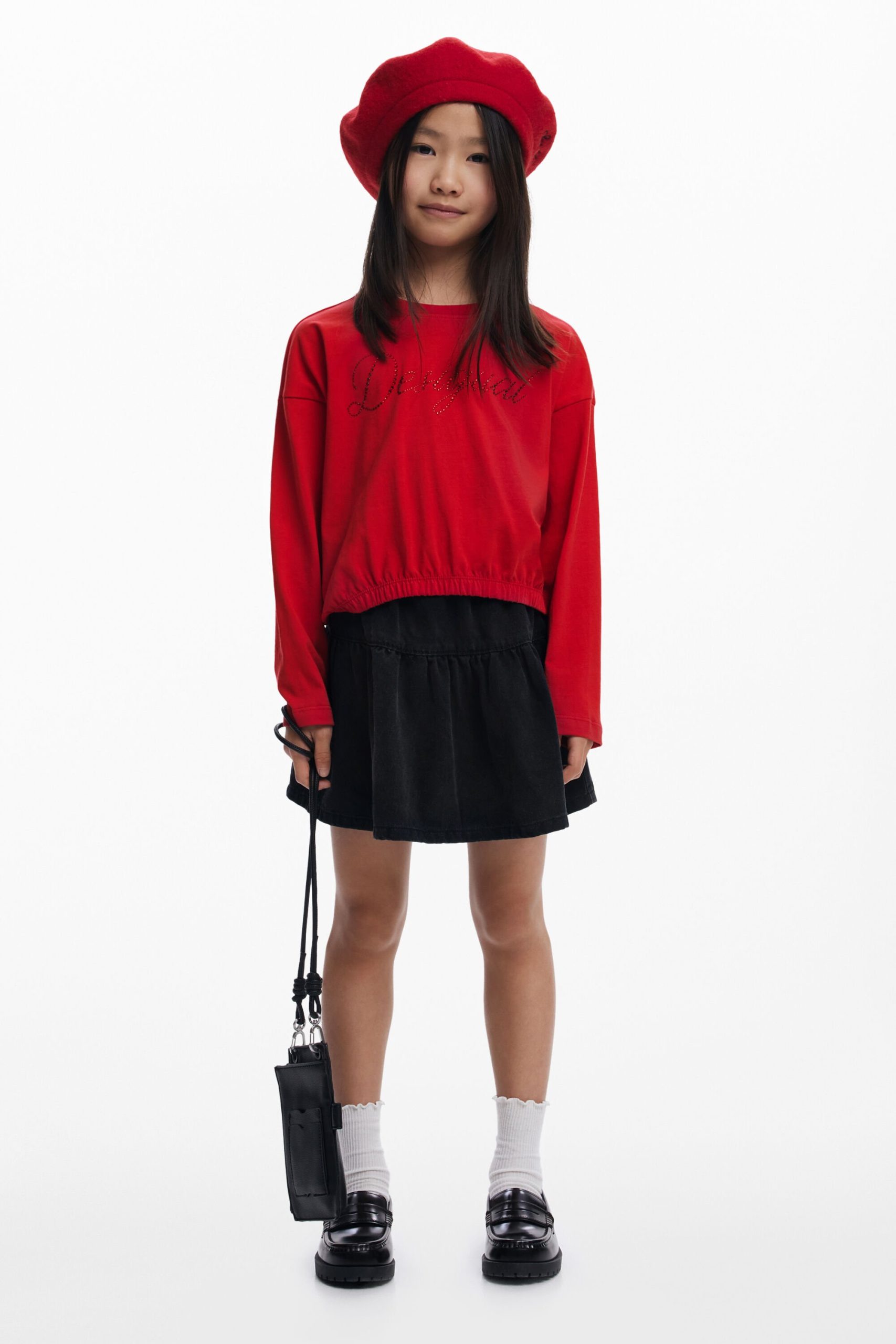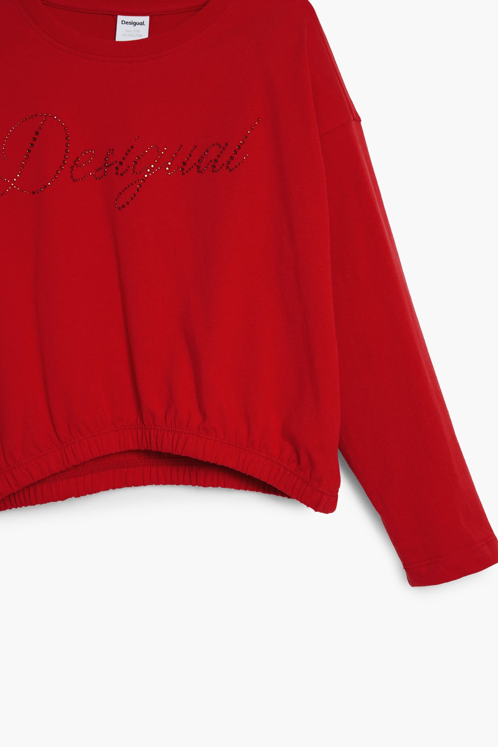 Long-sleeve T-shirt with a round neck, in cotton, in a solid color and with a logo detail in strass.