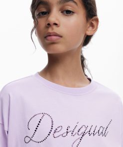 Long-sleeve T-shirt with a round neck, in cotton, in a solid color and with a logo detail in strass.