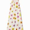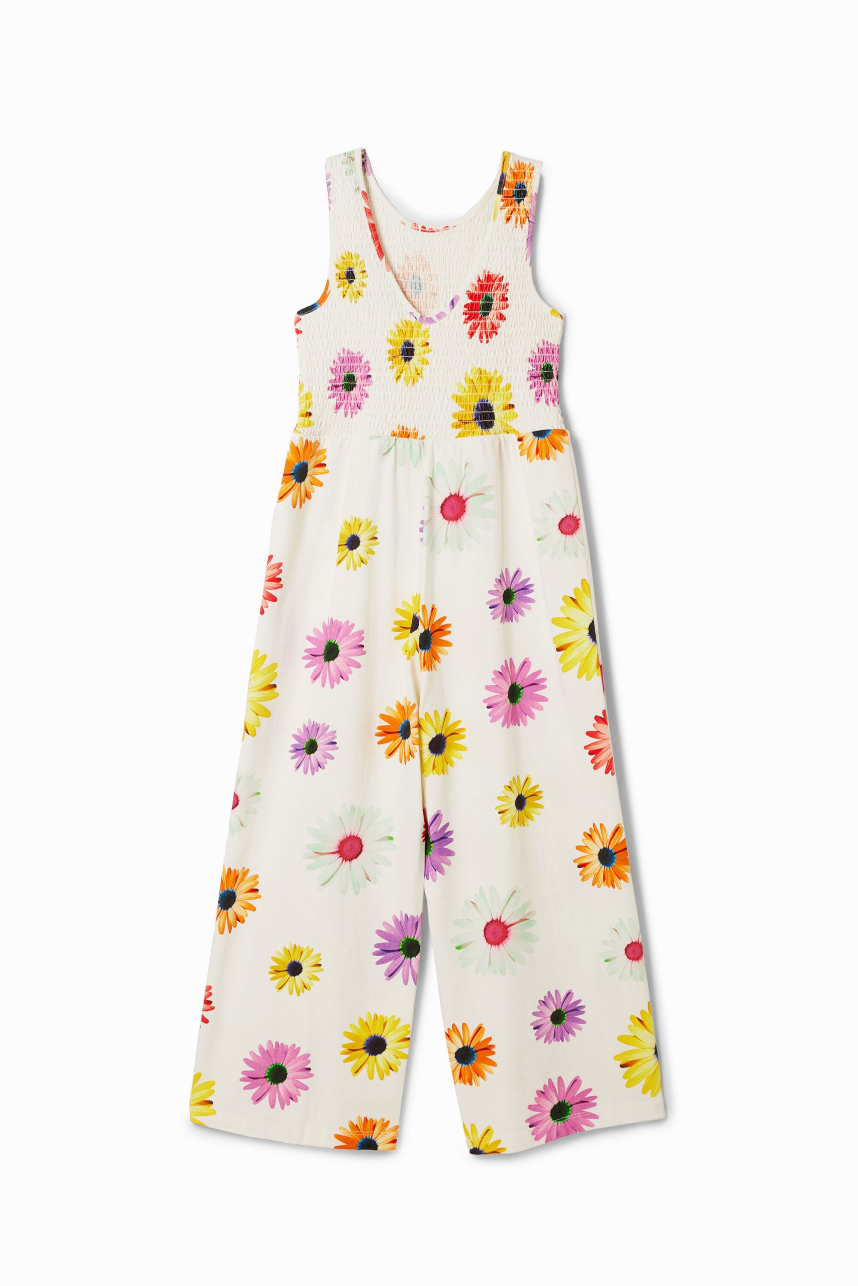 A strappy jumpsuit with a stretch smock-stitch body, wide legs and a daisy print.