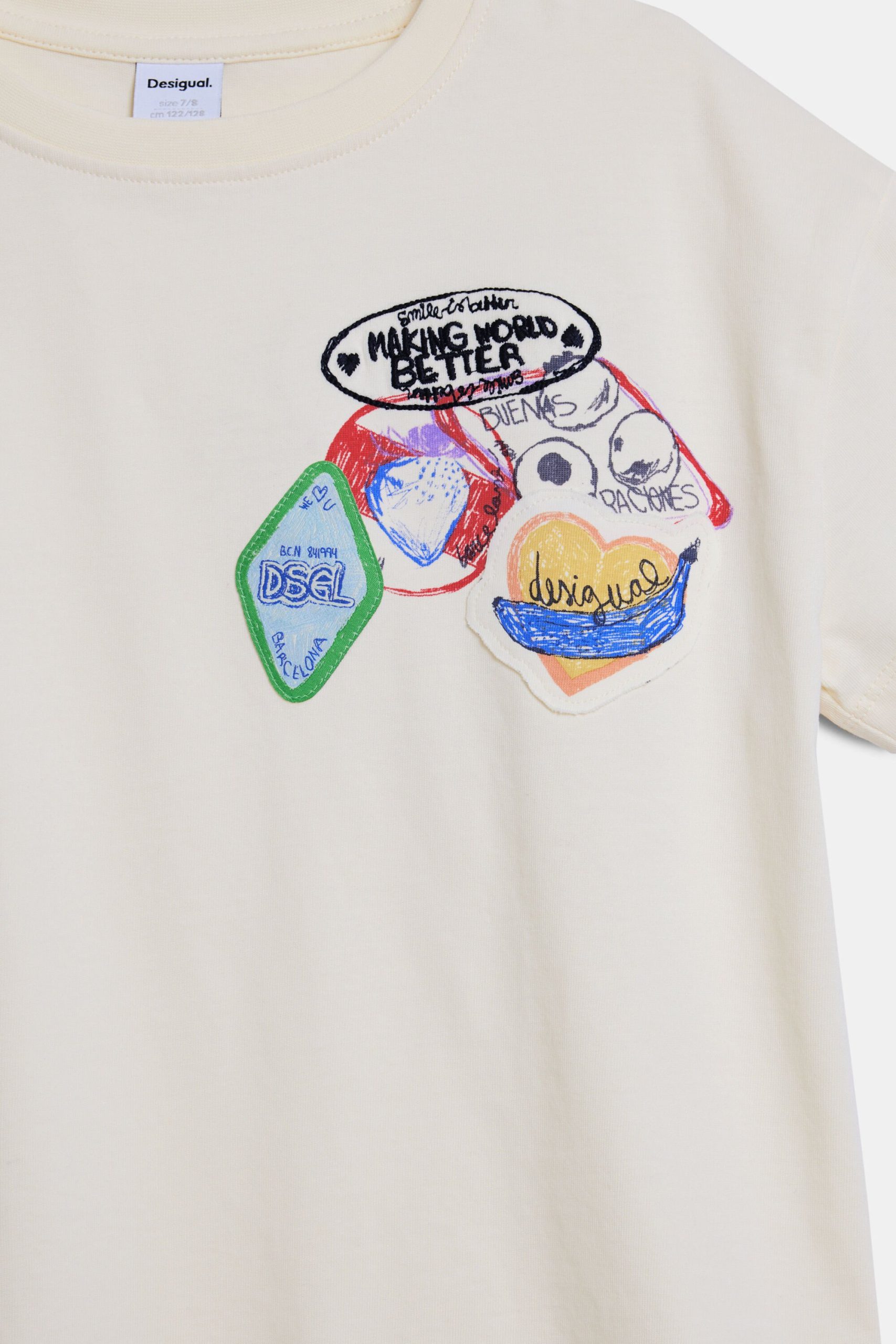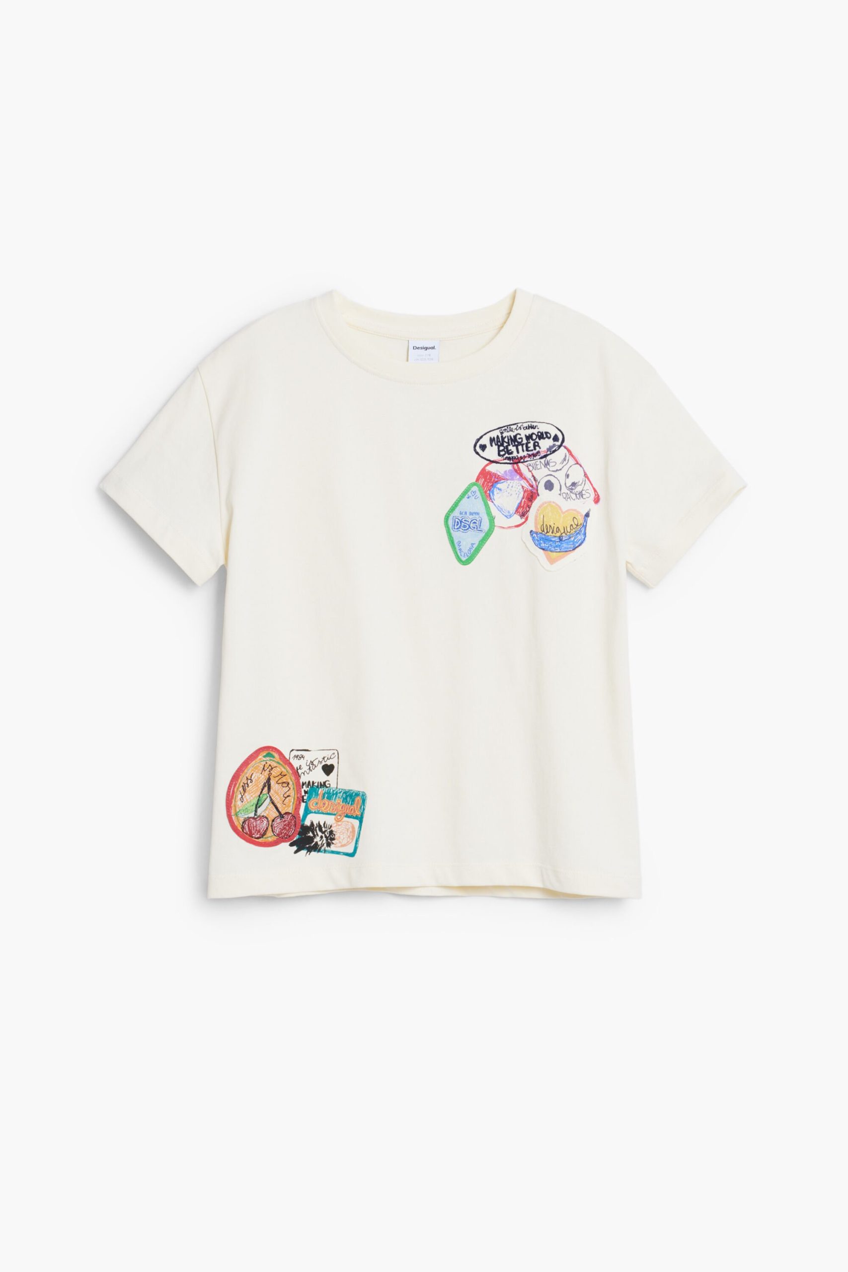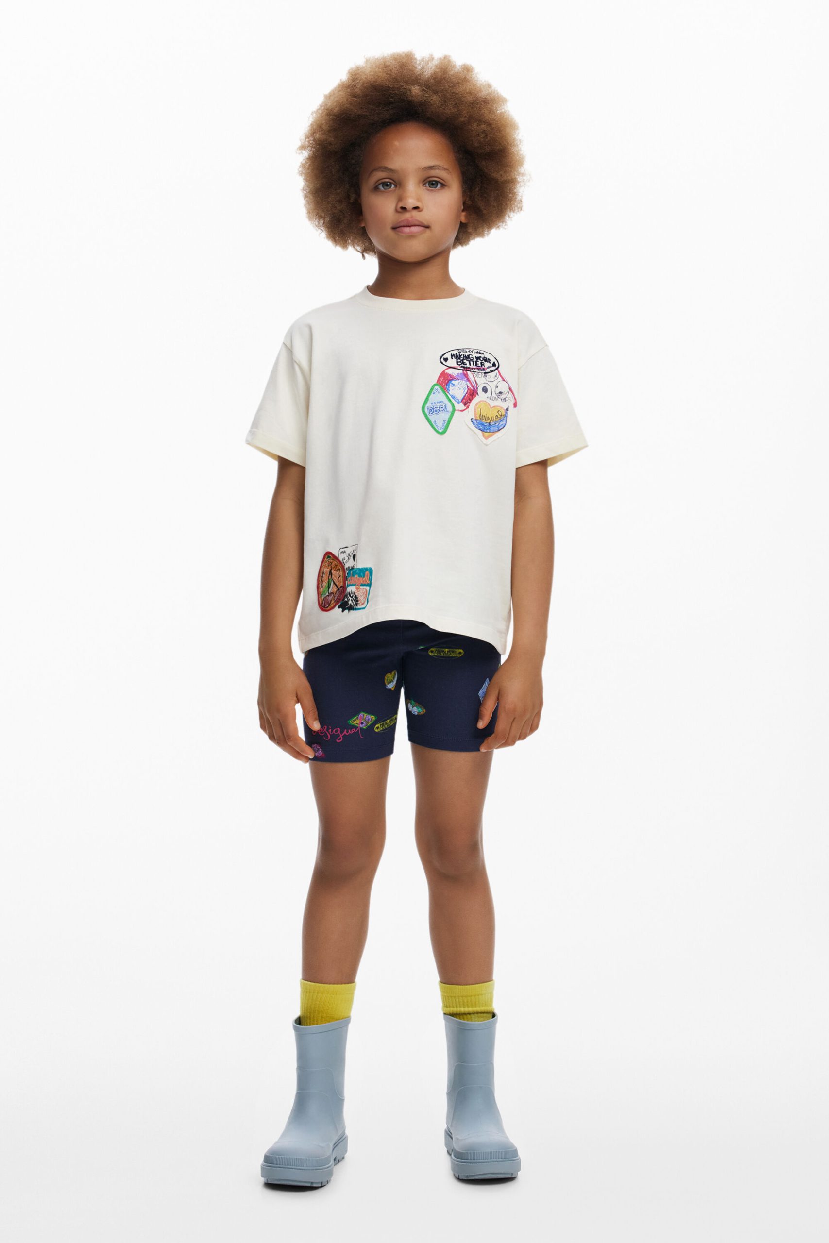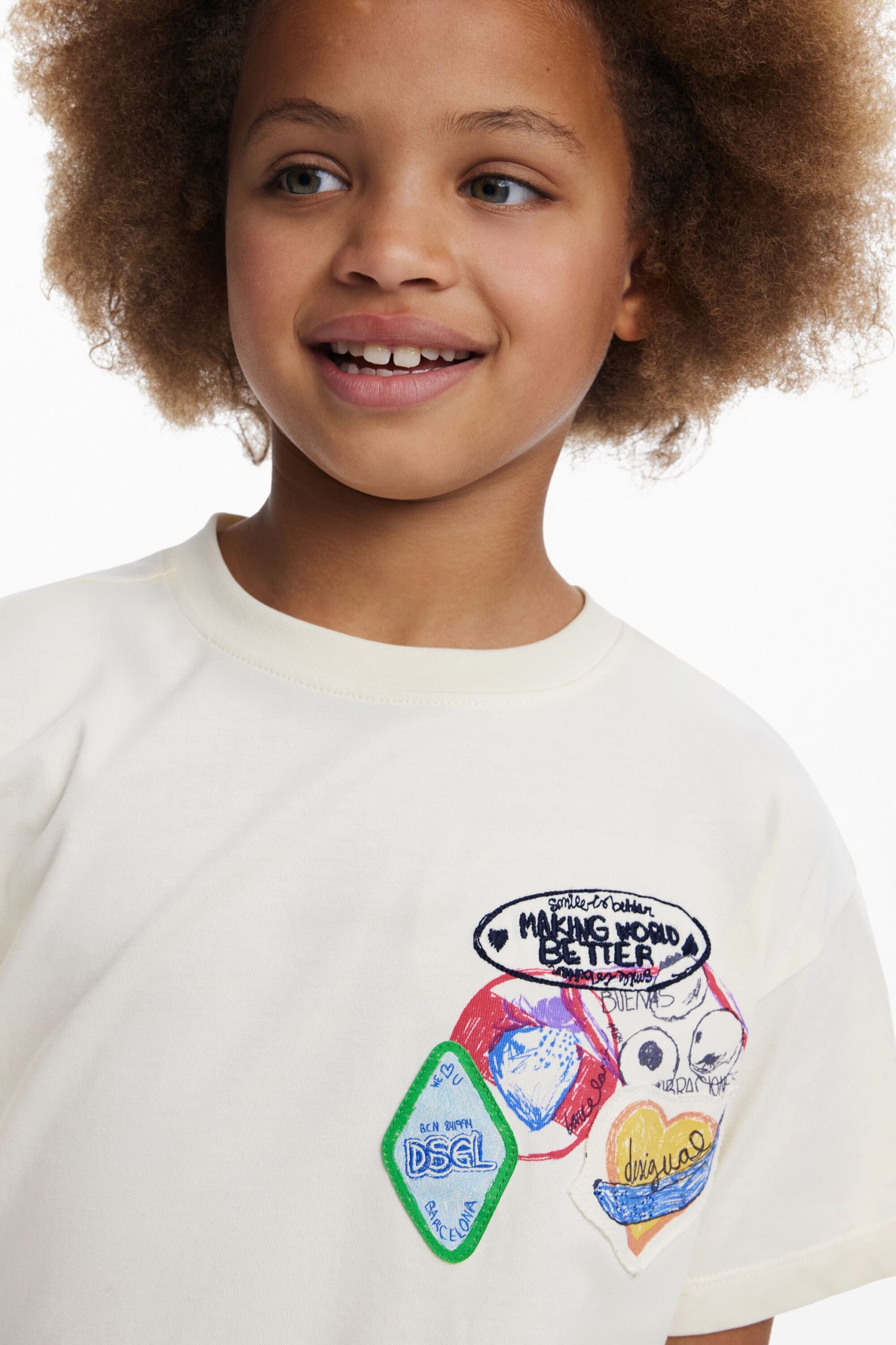 T-shirt in cotton, with short sleeves and a round neck, featuring sections and embroidery of drawings and positive messages.