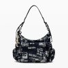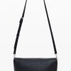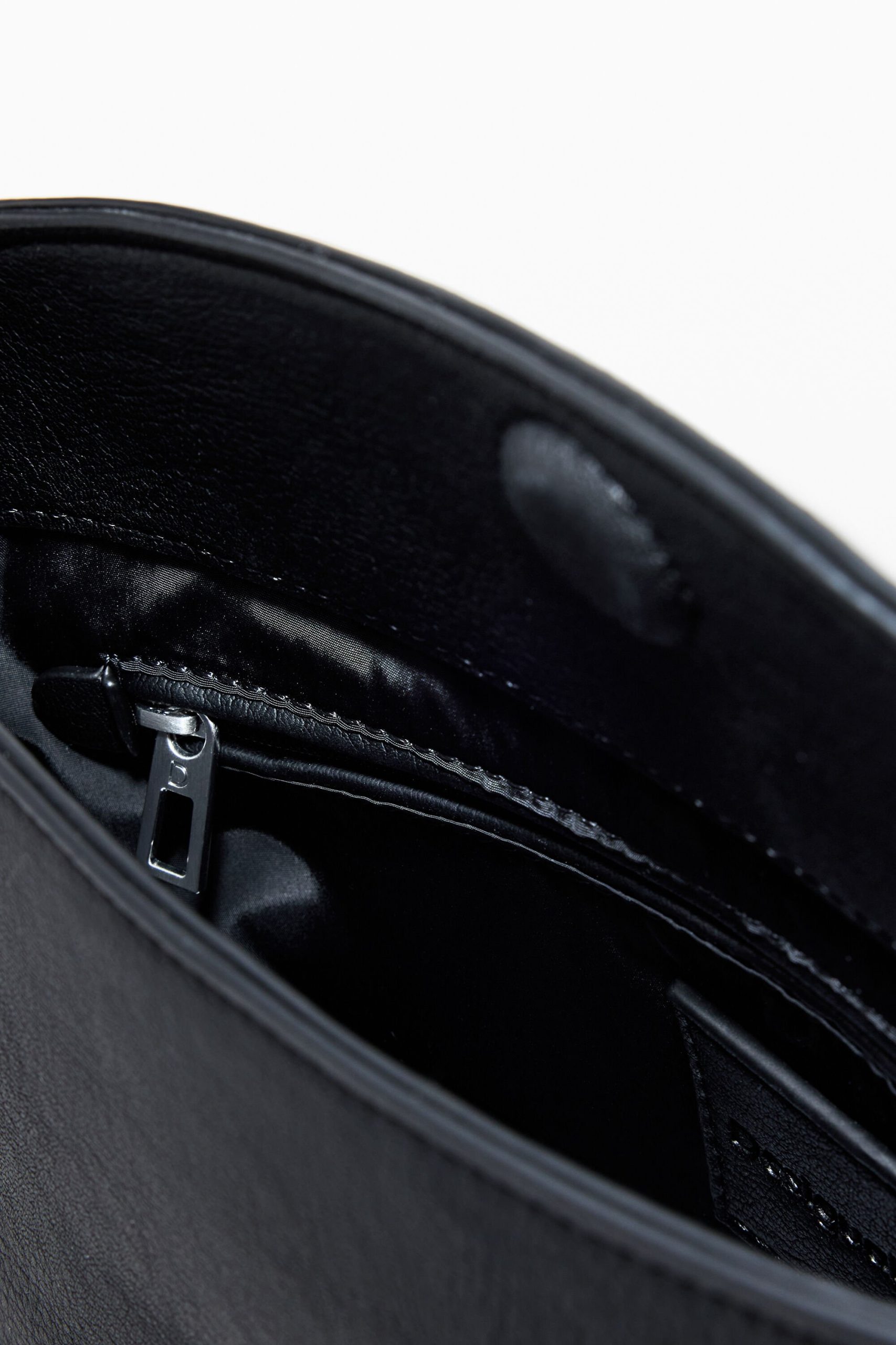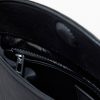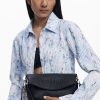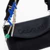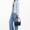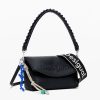 Crossbody style bag in faux leather fabric, with 3D effect logo, zipper closure, extendable flap, interchangeable handles, and detachable keychain in solid color.