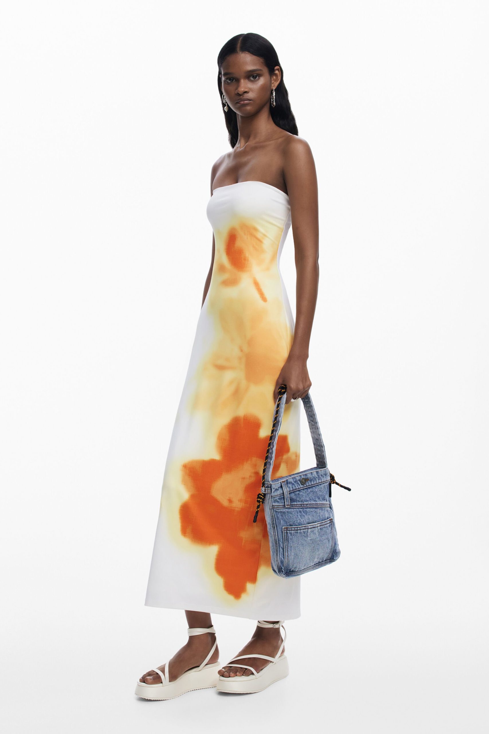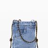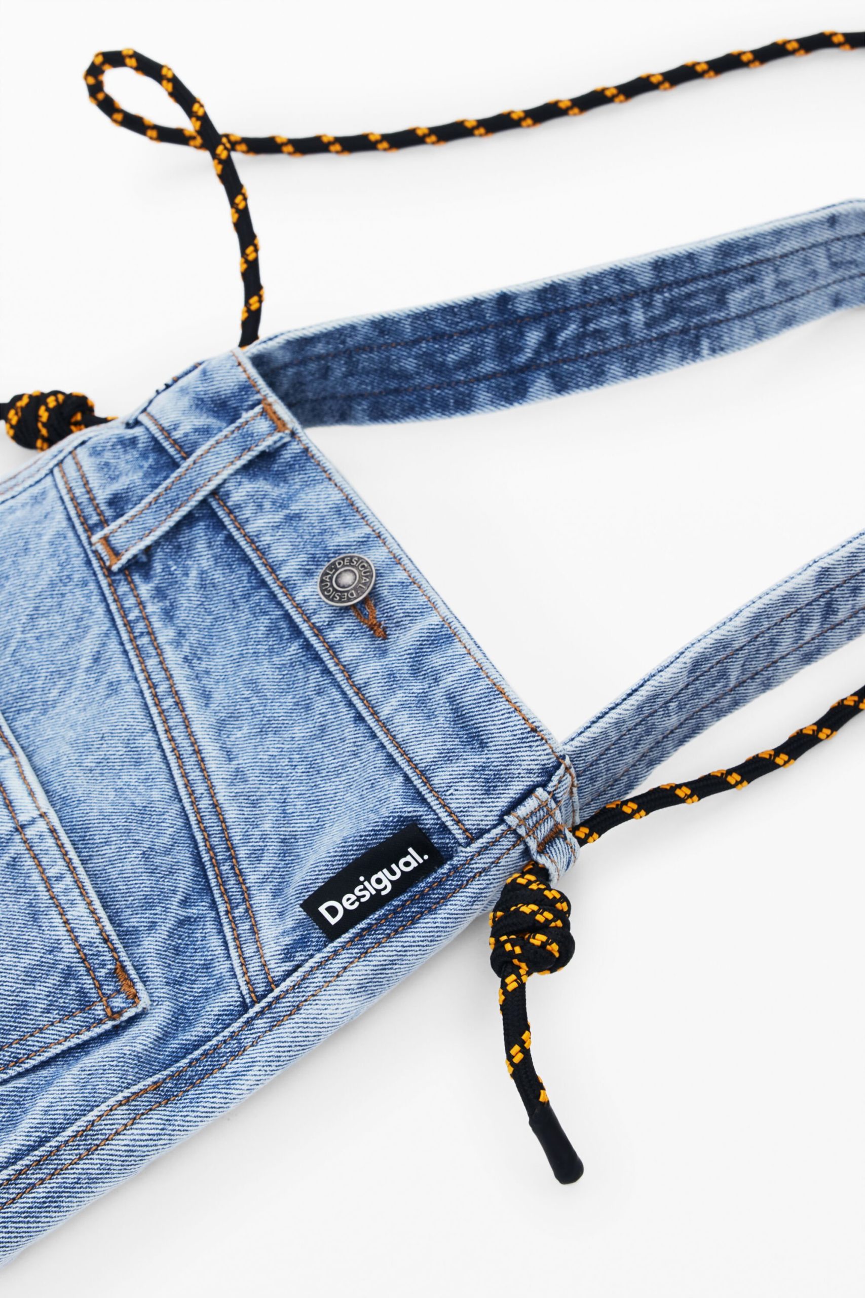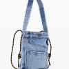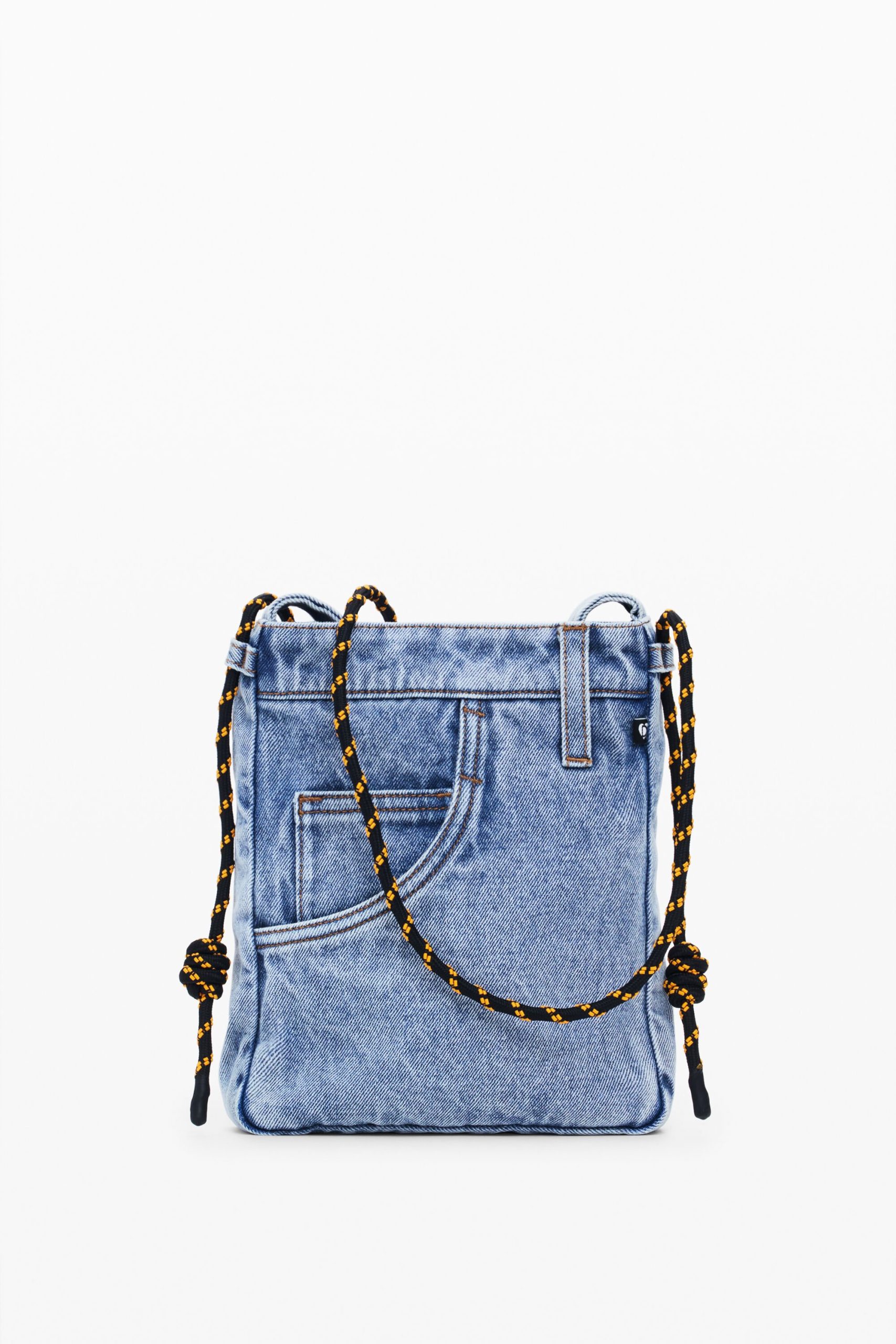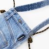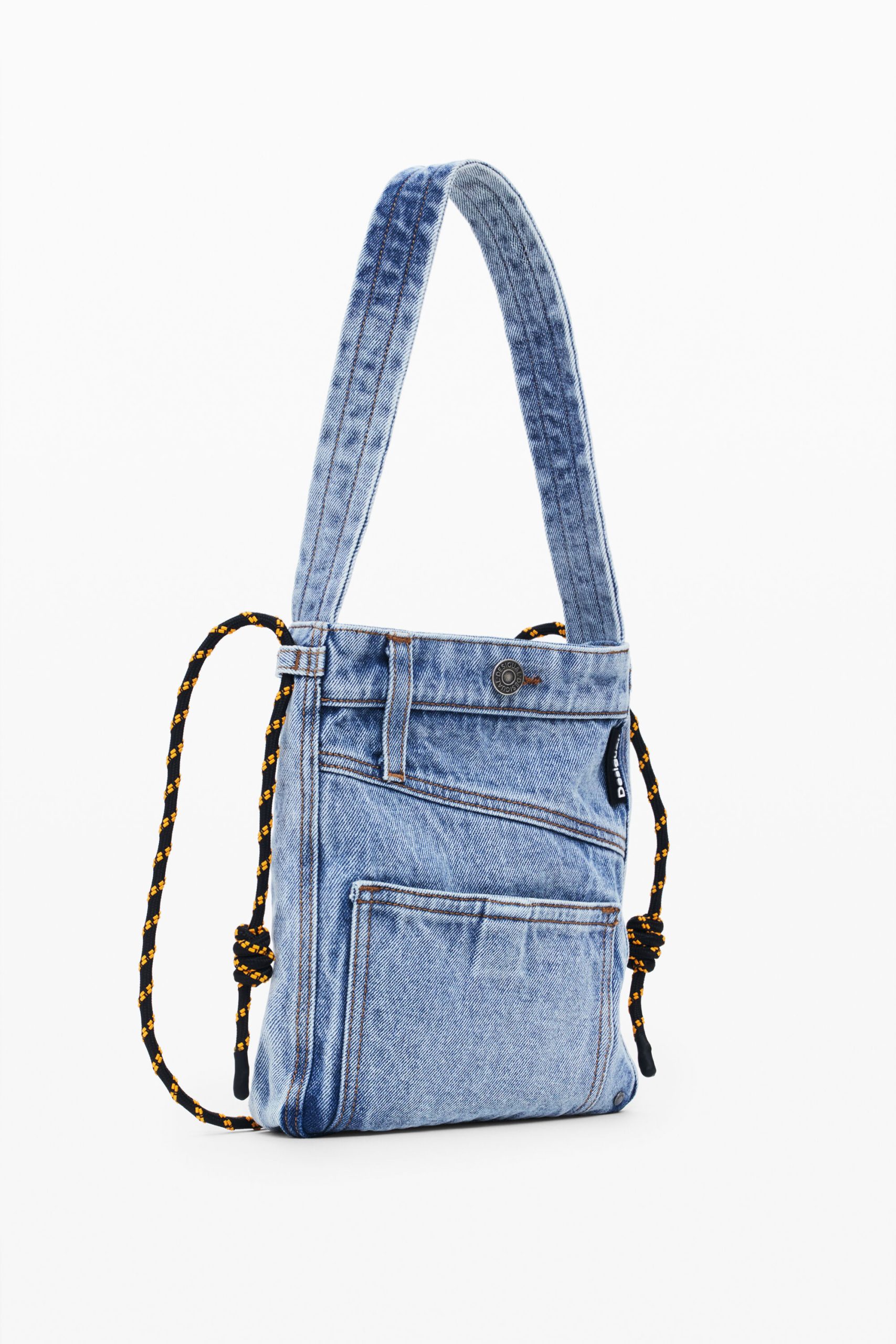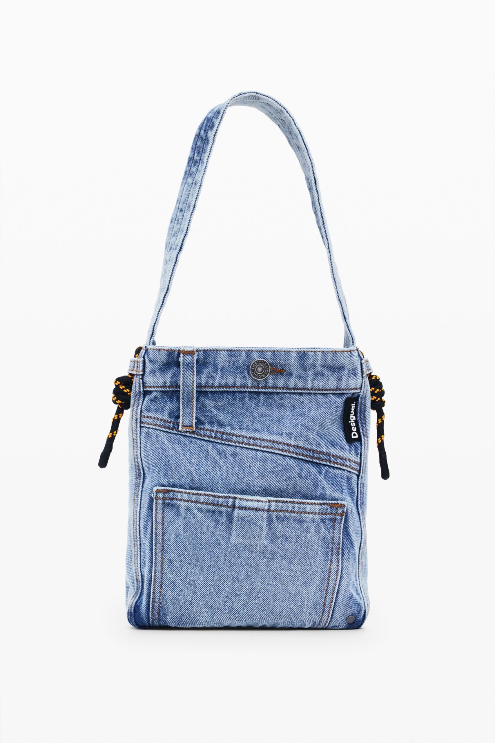 Medium-sized tote bag style in denim fabric, with exterior pockets and button closure.