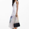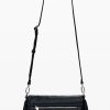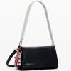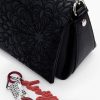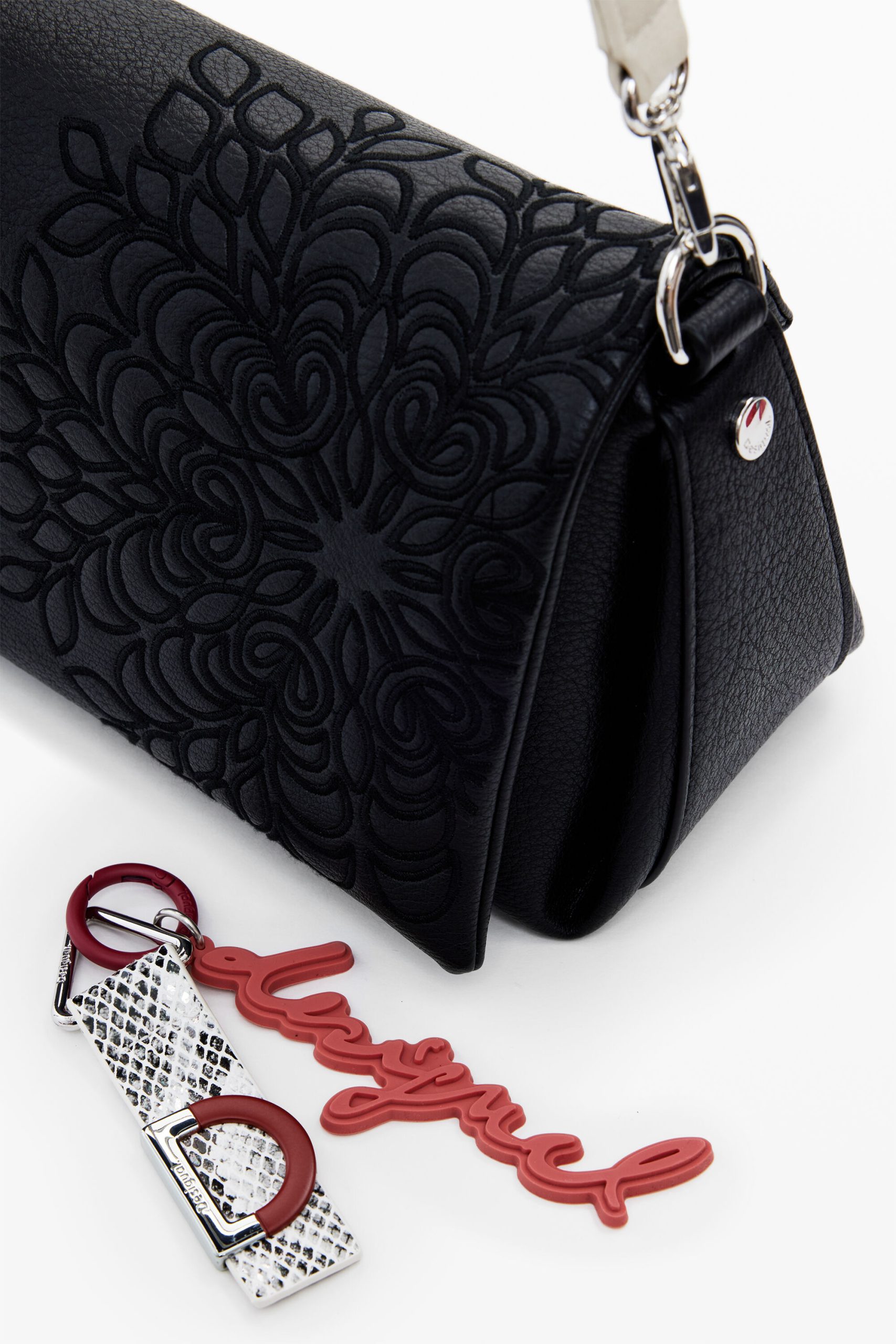 Medium-sized crossbody style bag, in faux leather fabric, with embroidery detail, interchangeable handles, metal stud details, and zipper and flap closure.