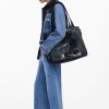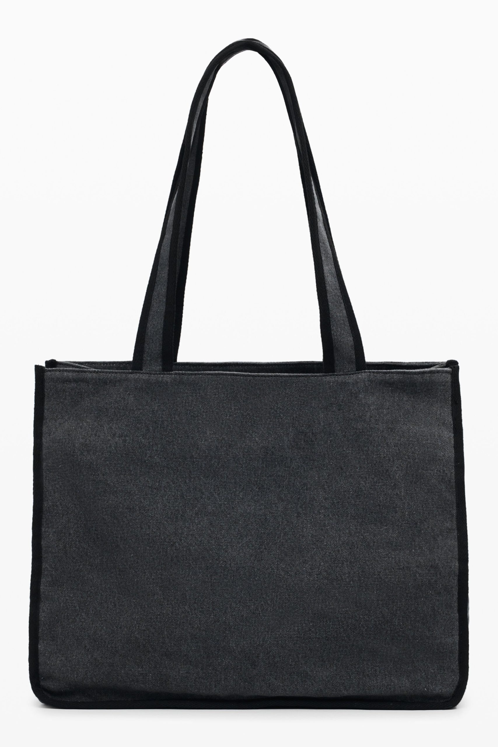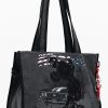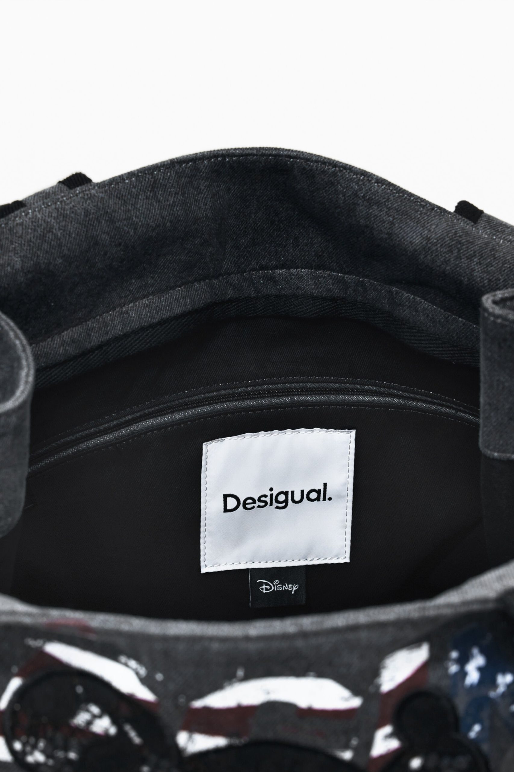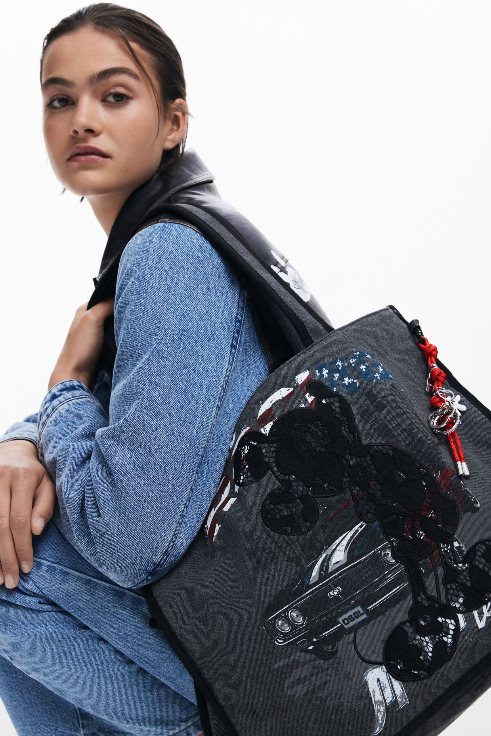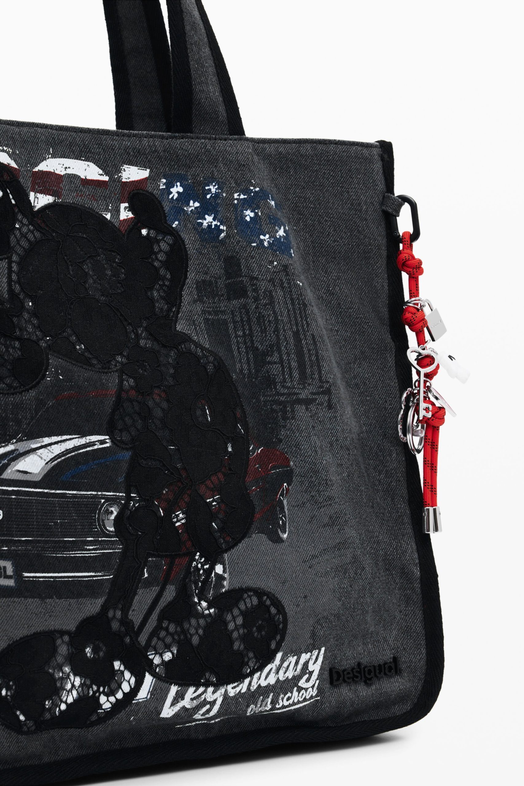 Oversized shopper-style bag, in denim fabric, fixed handles, detachable keychain detail, and Mickey Mouse™ print.
