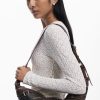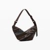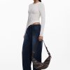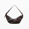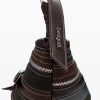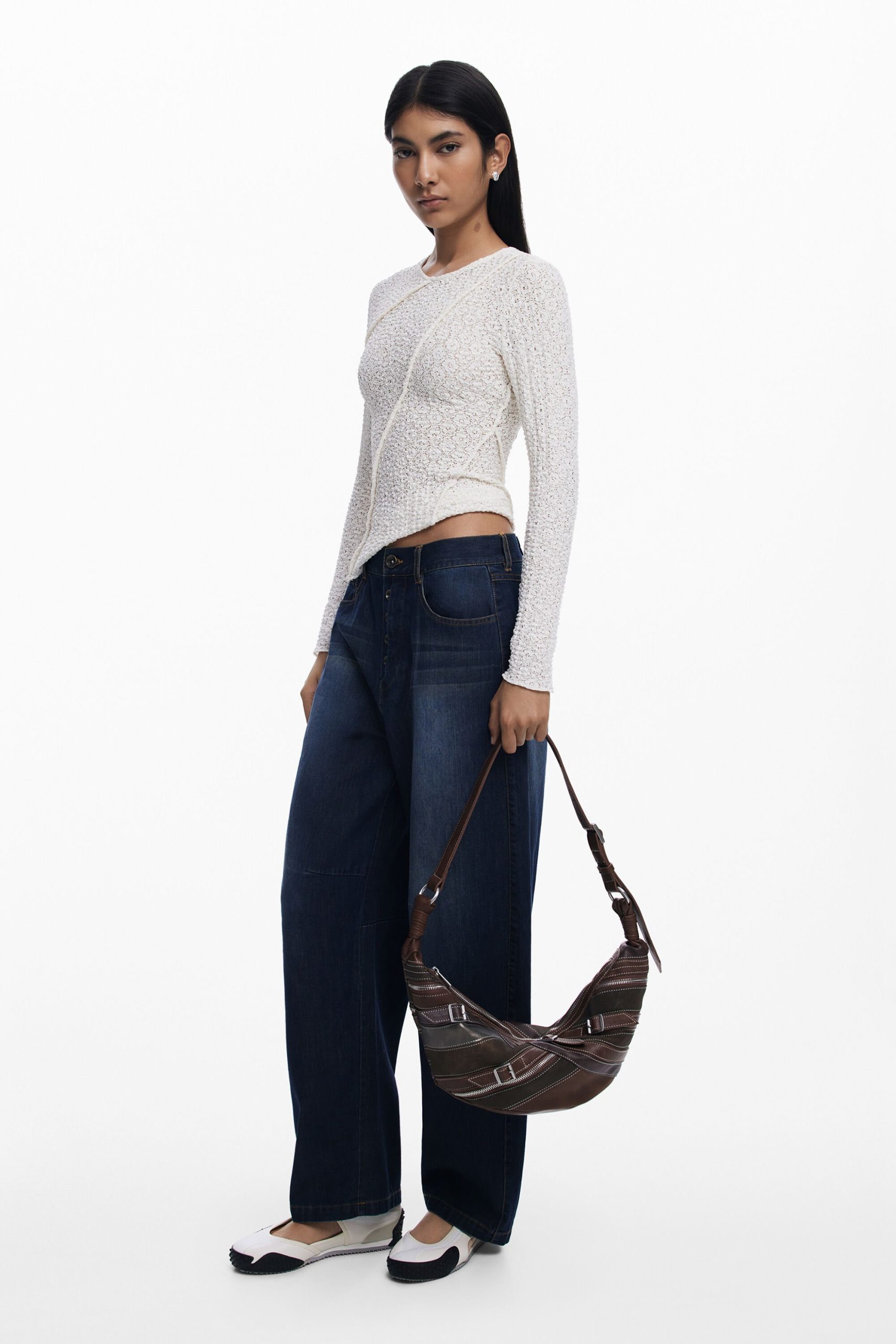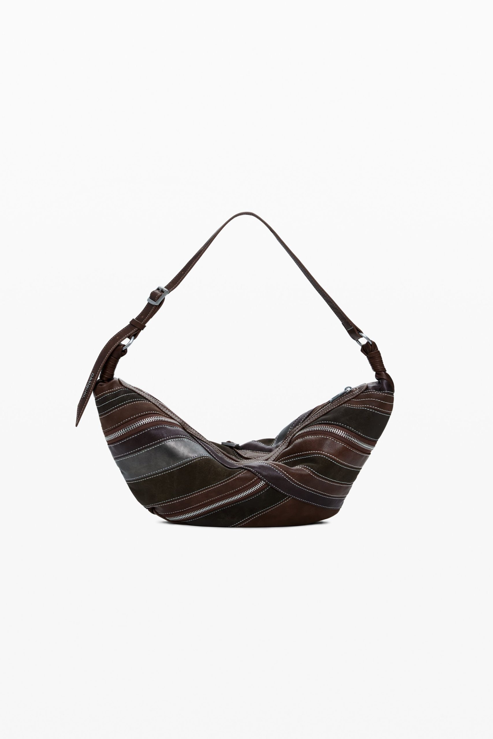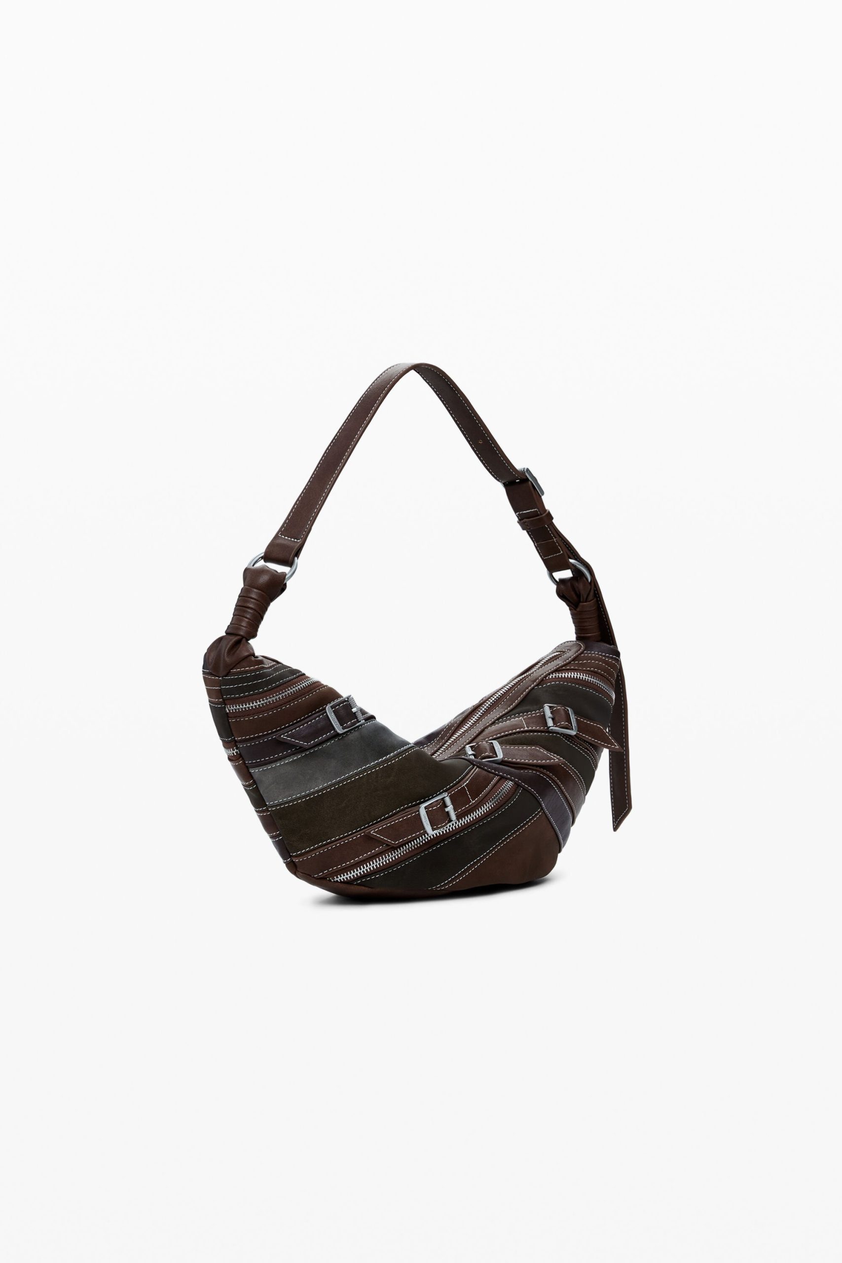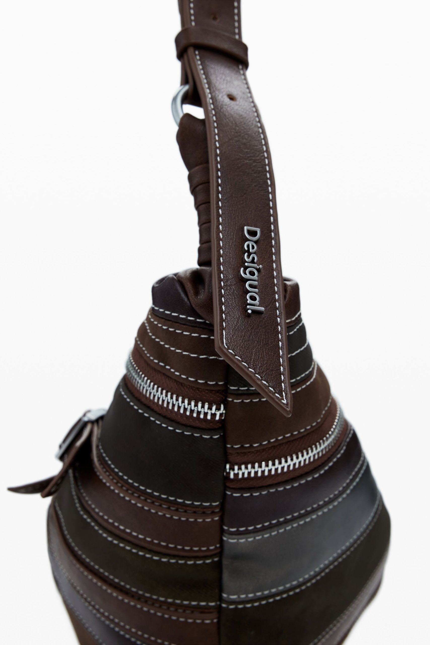 Medium-sized crossbody bag with different leather-effect patchwork fabrics, interchangeable handles, and zipper closure.