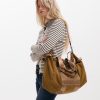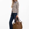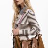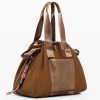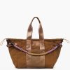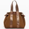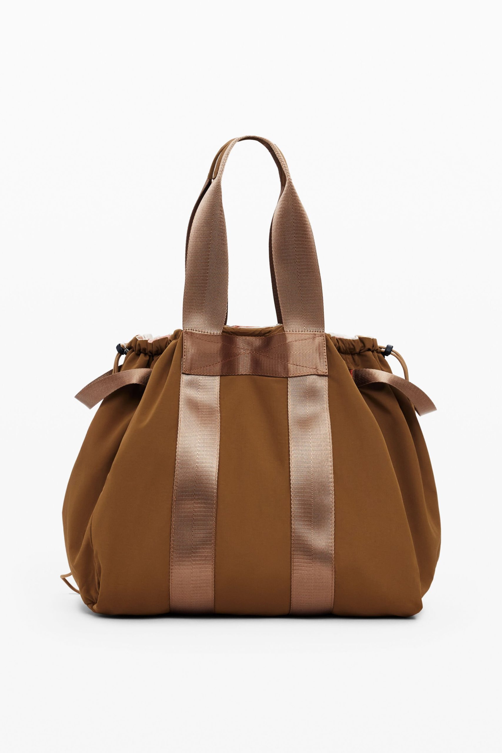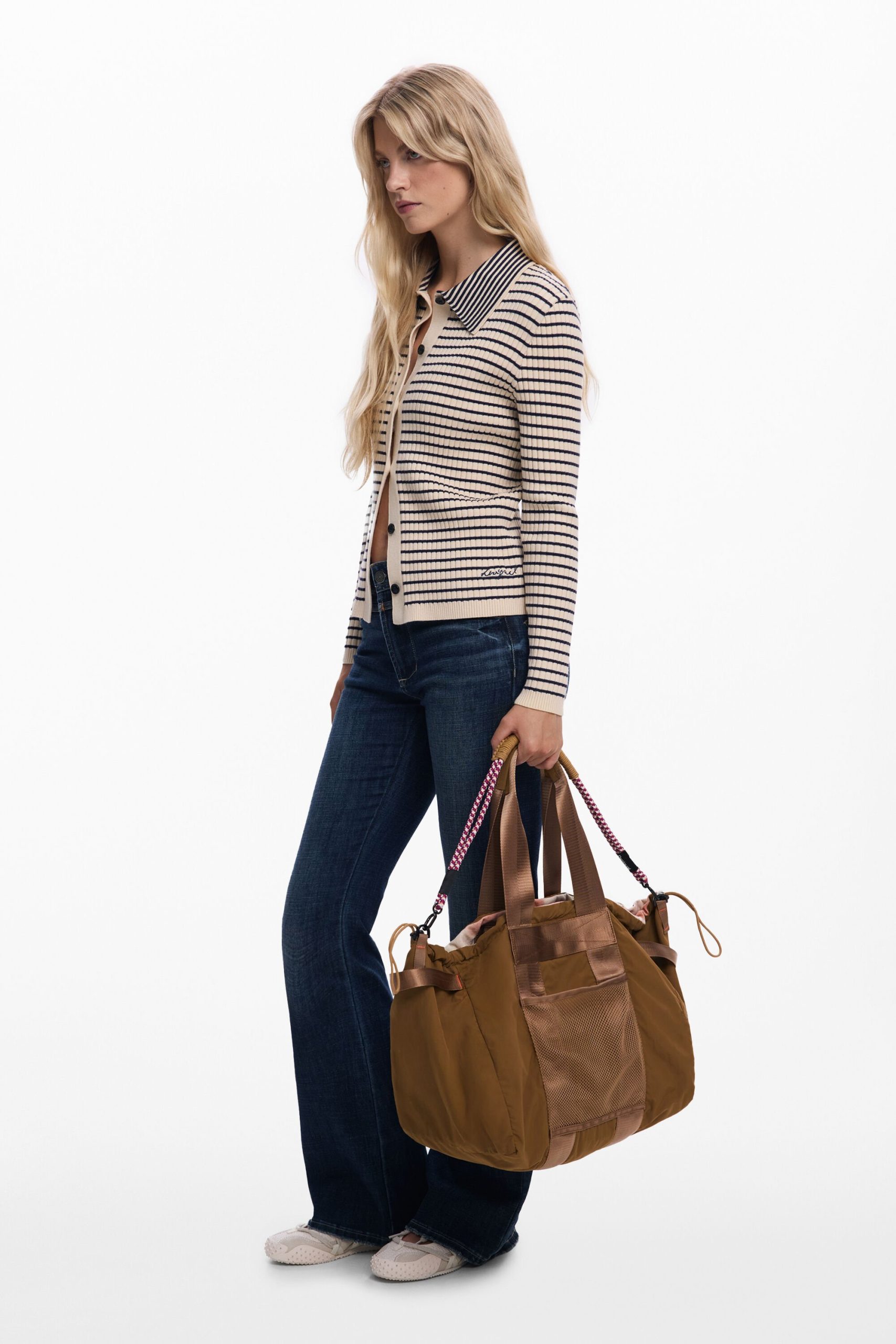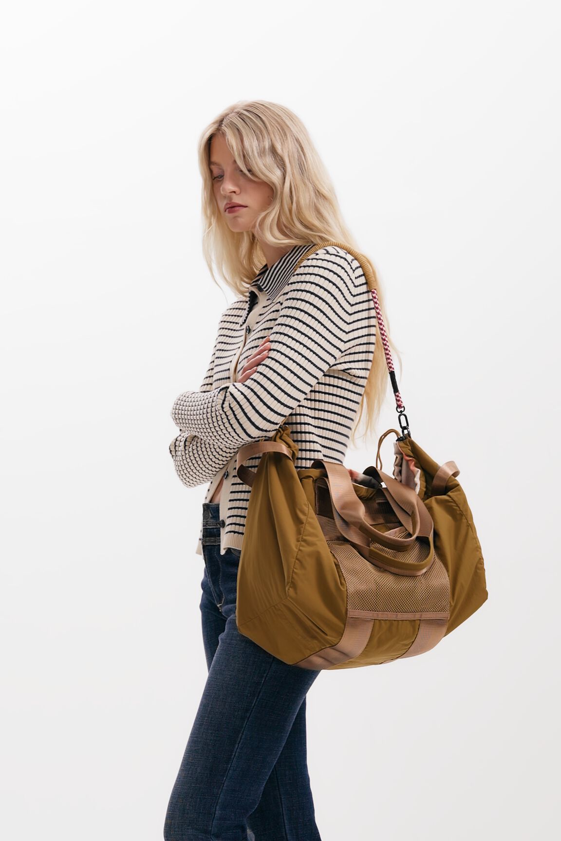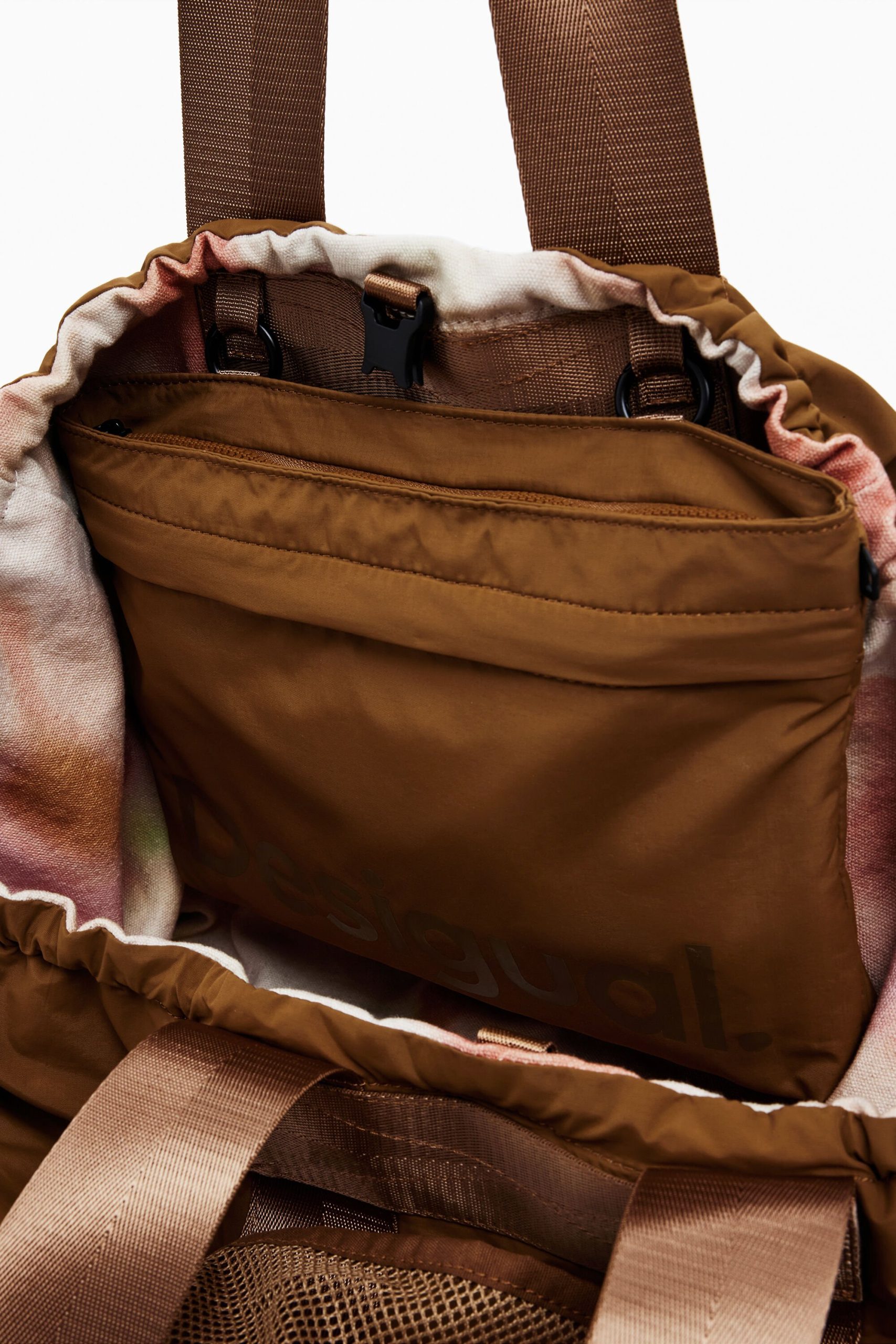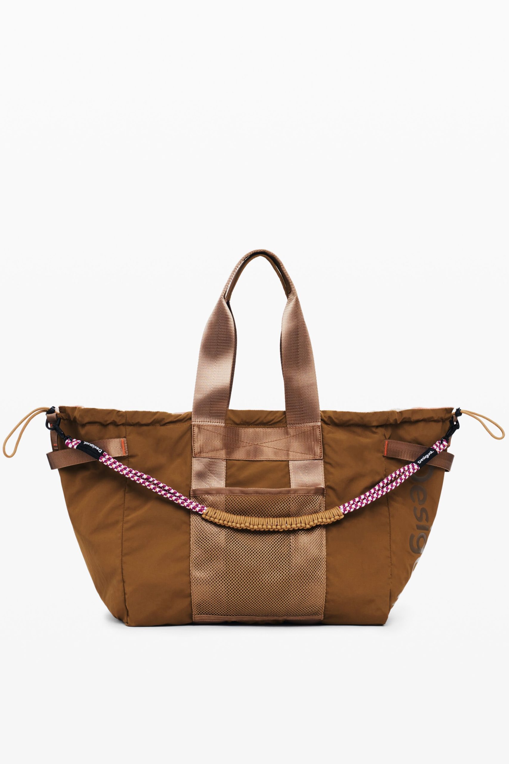 Reversible nylon handbag with pocket details, interchangeable trekking-style straps, and contrasting color printed logo.