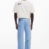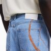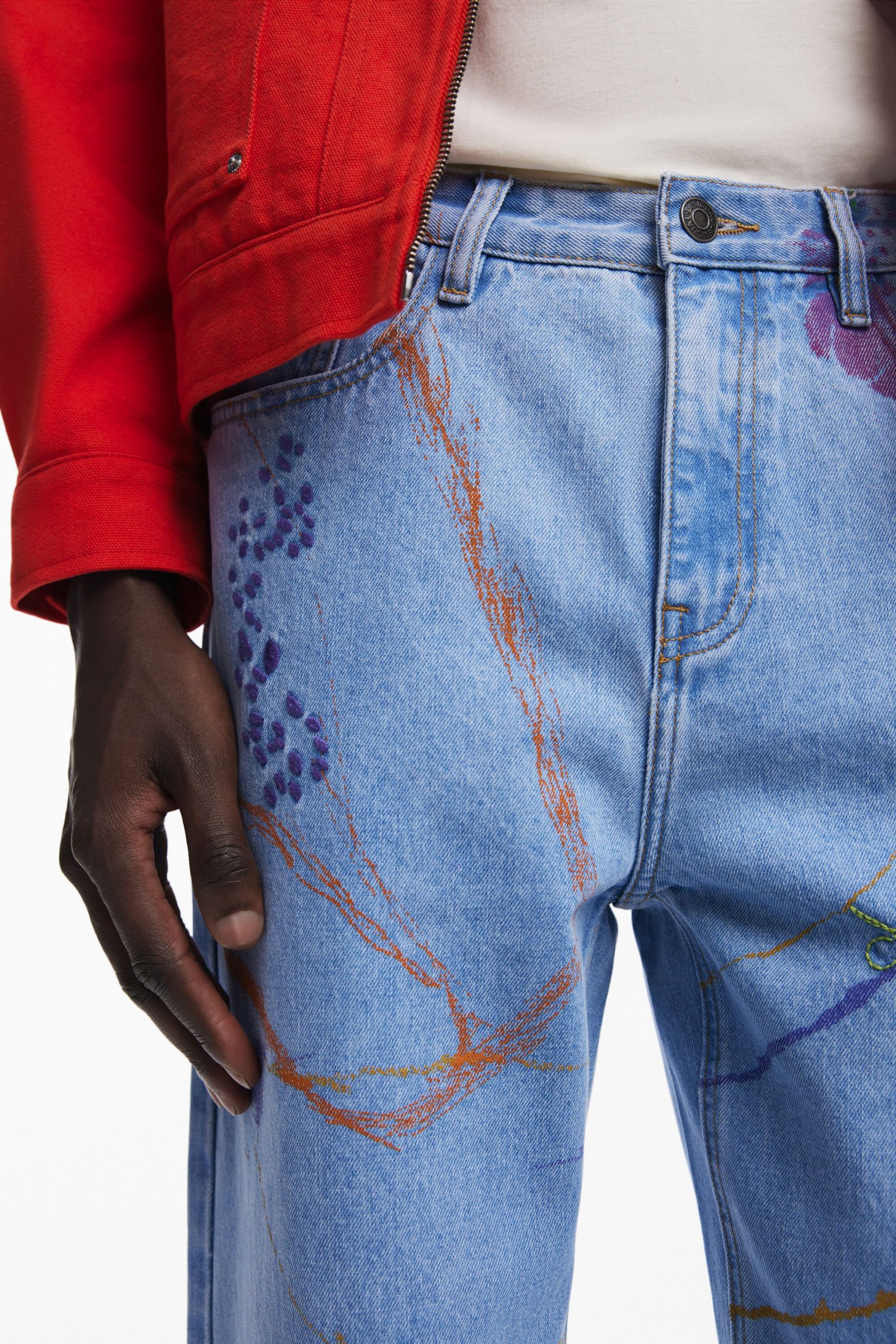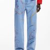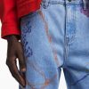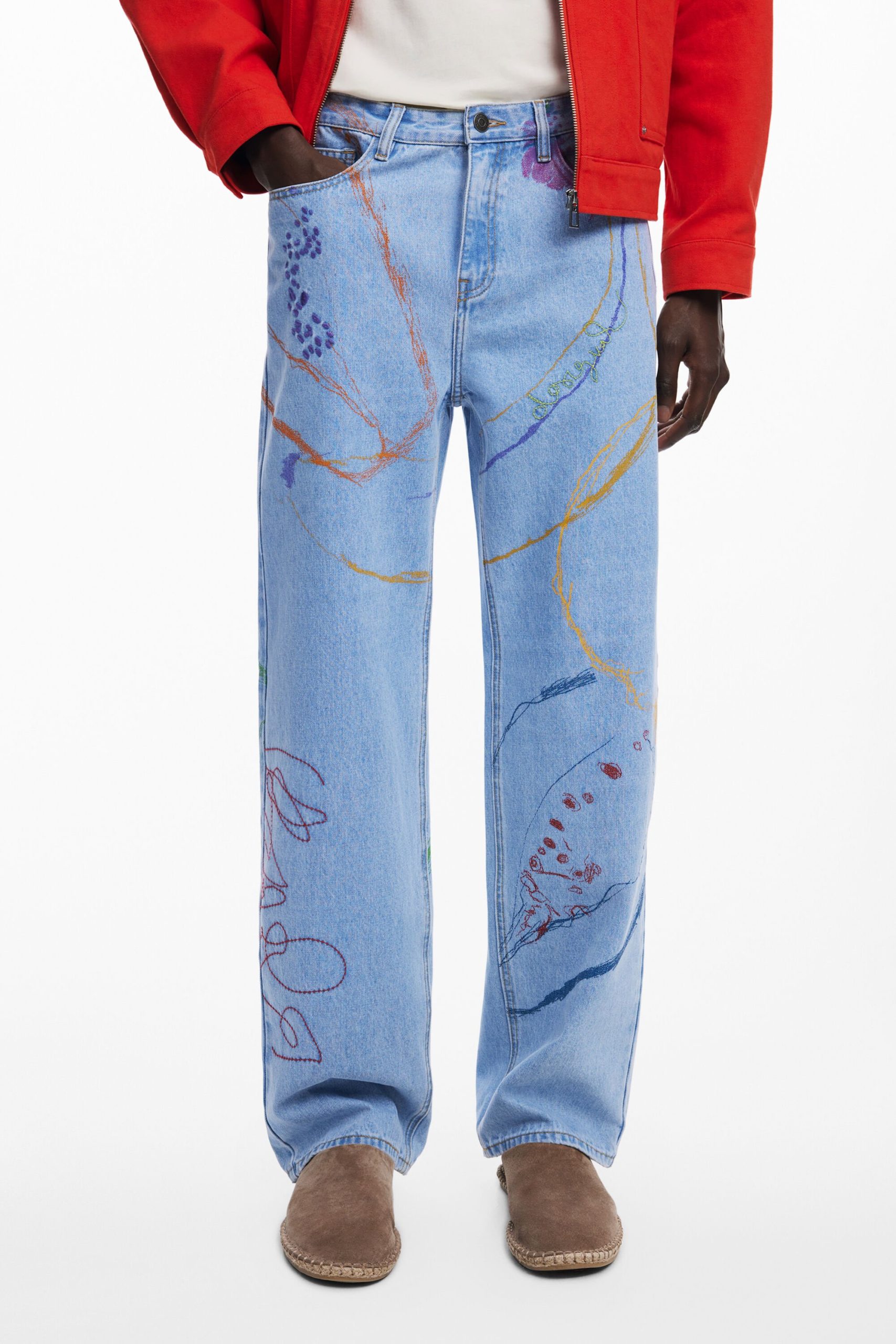Long relaxed-fit denim pants with artistic stroke drawings in Arty style in various shades.