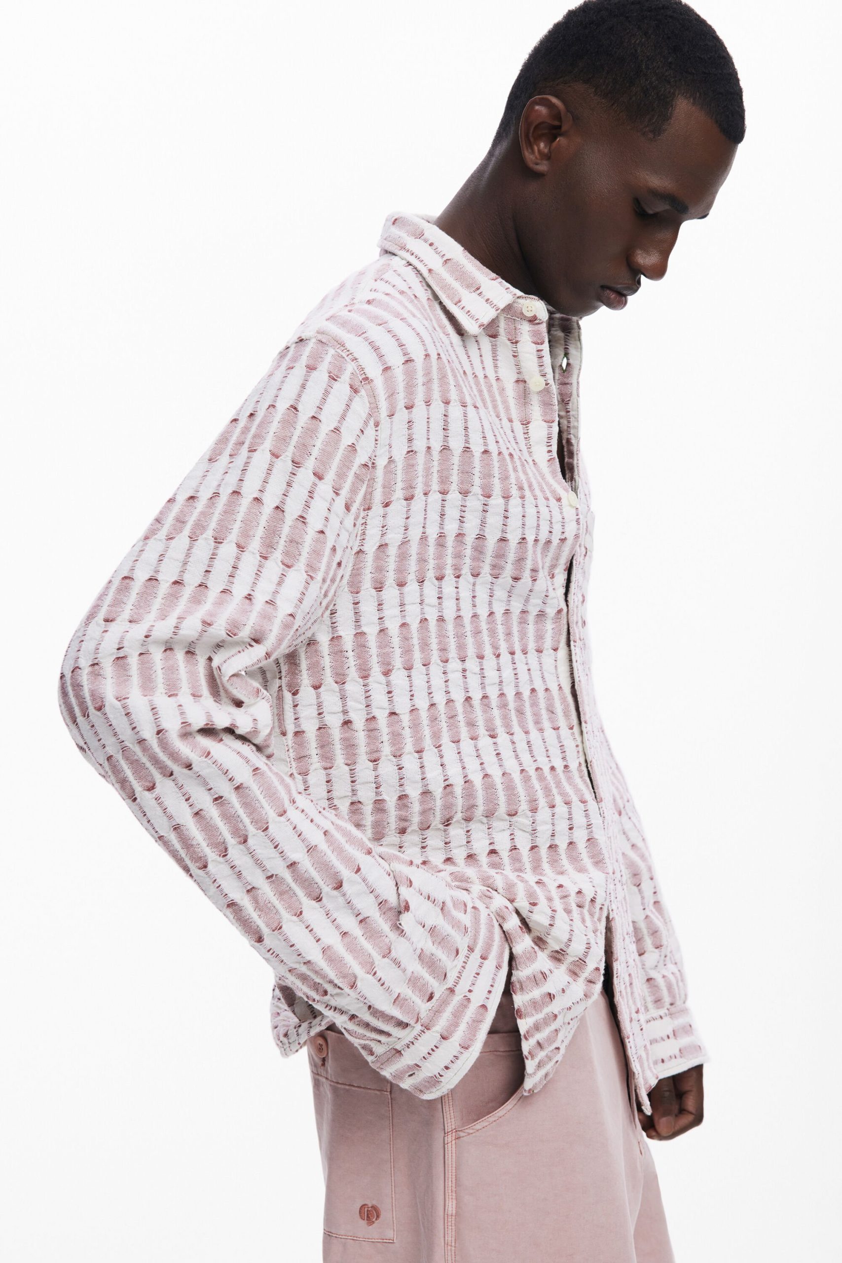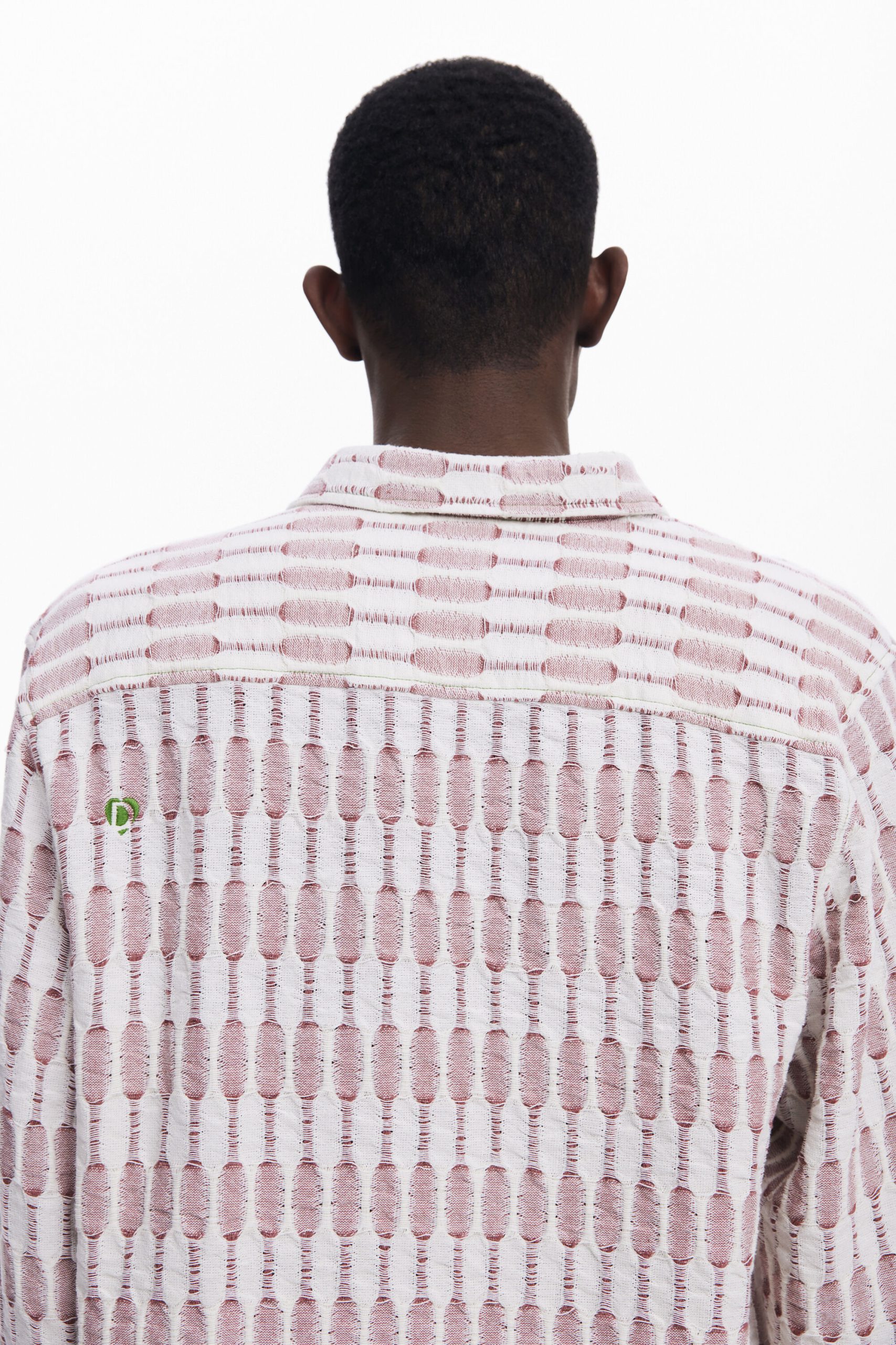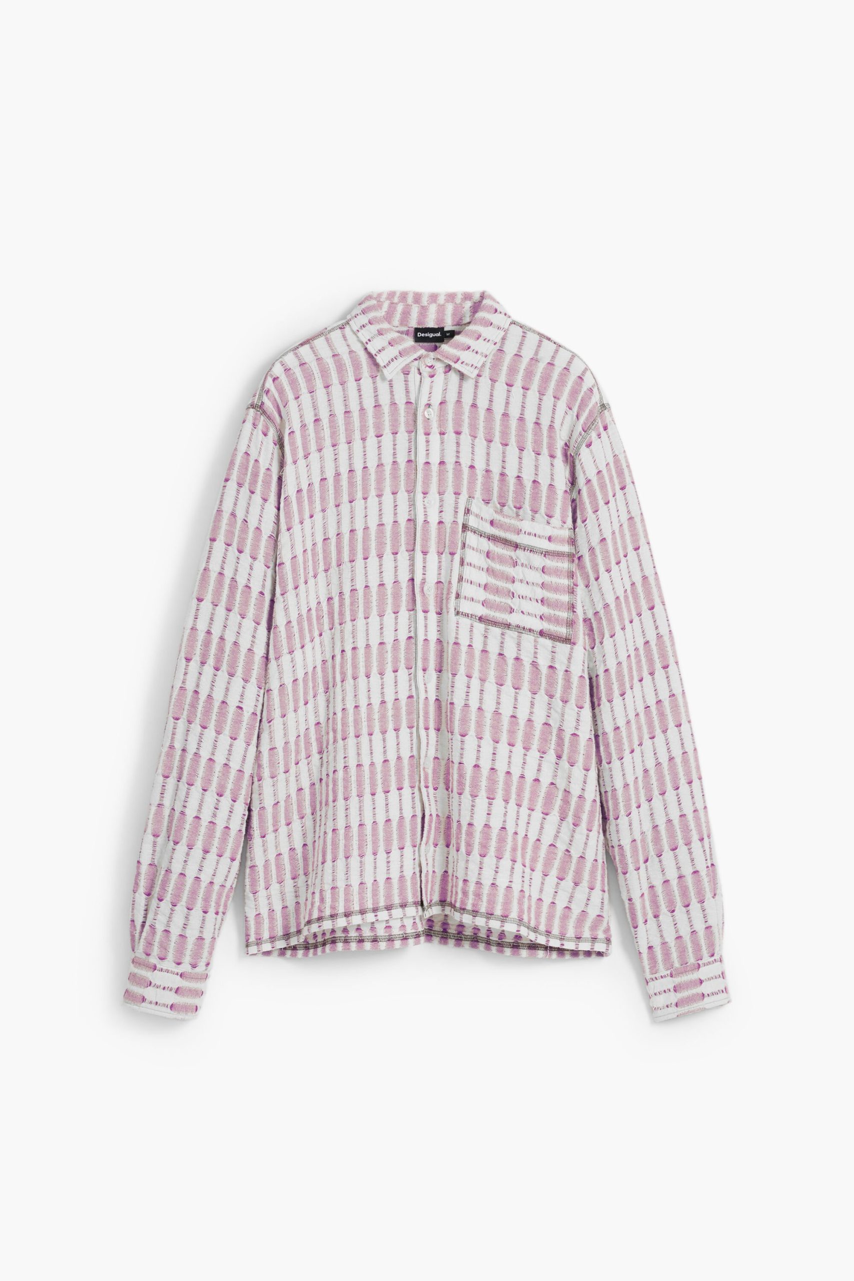 Long-sleeve striped shirt with a cut-out effect print, contrasting colors, and a front pocket.