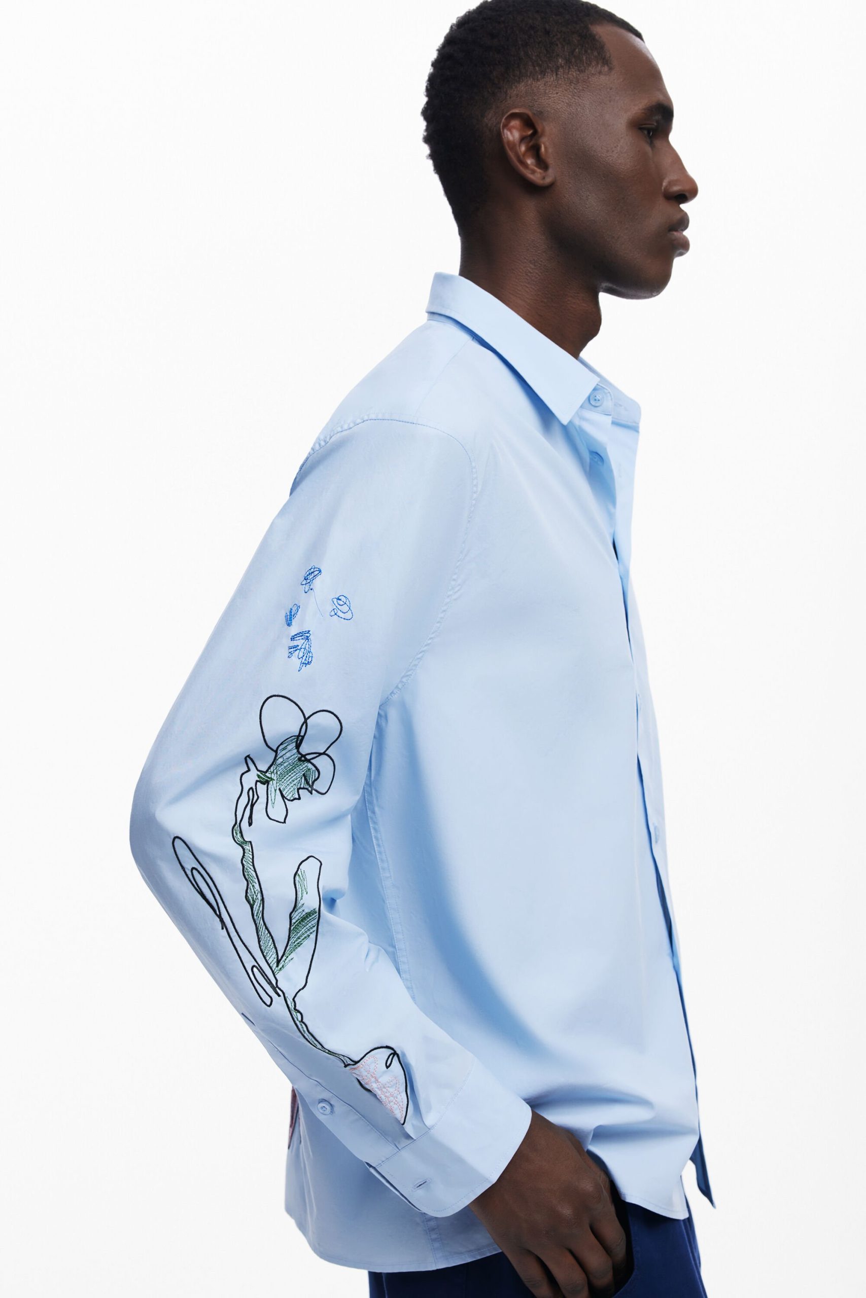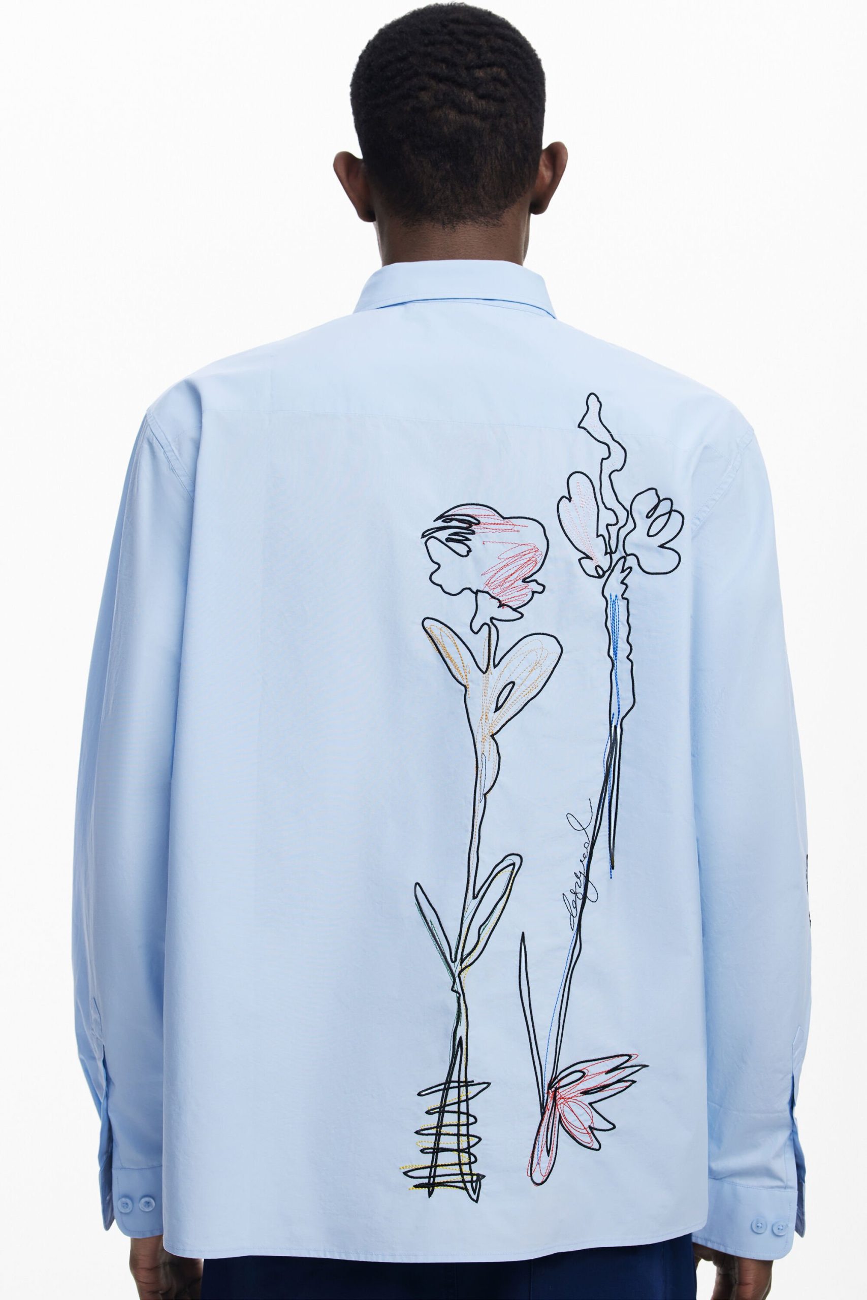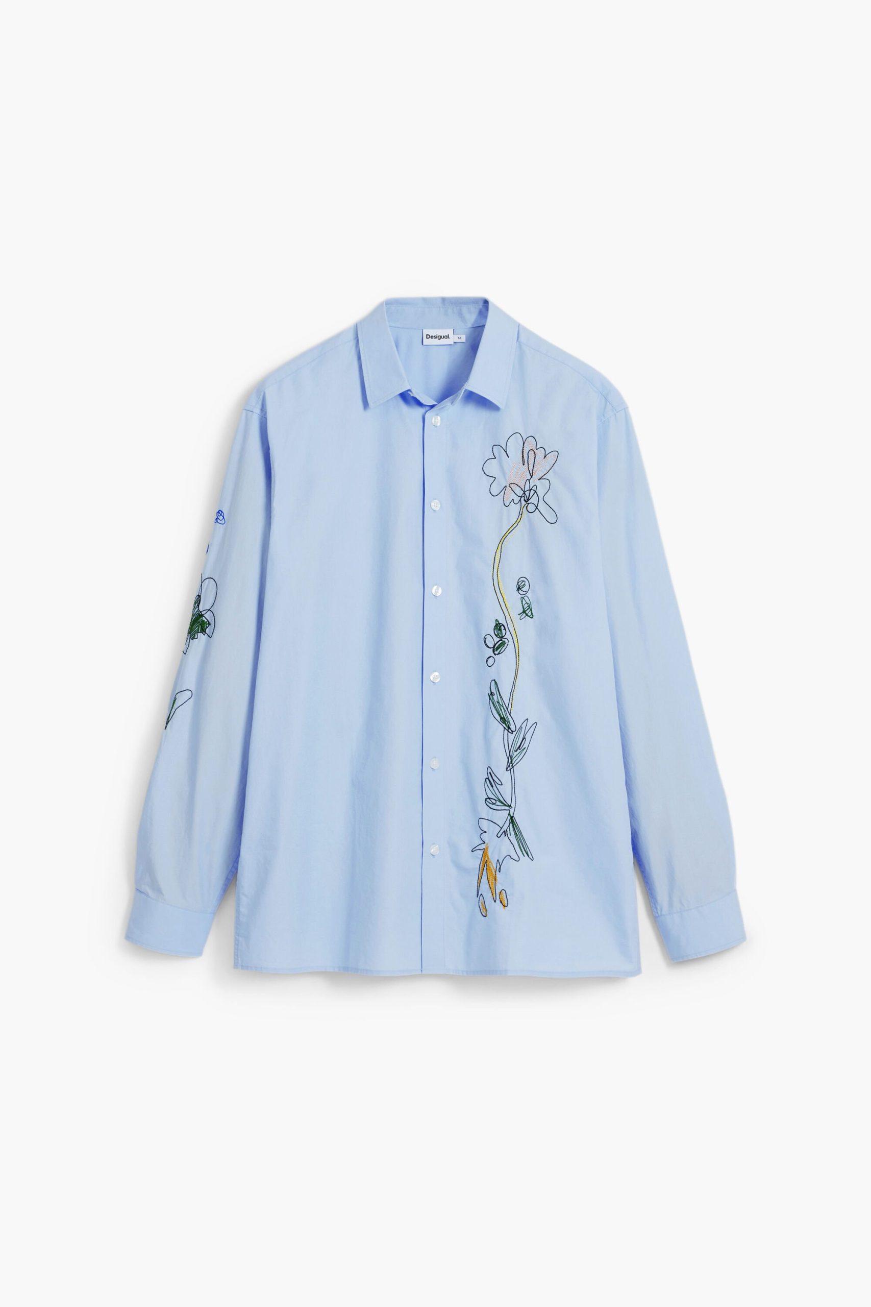 Long-sleeve shirt with flower embroidery and stitching on the front and one of the sleeves.