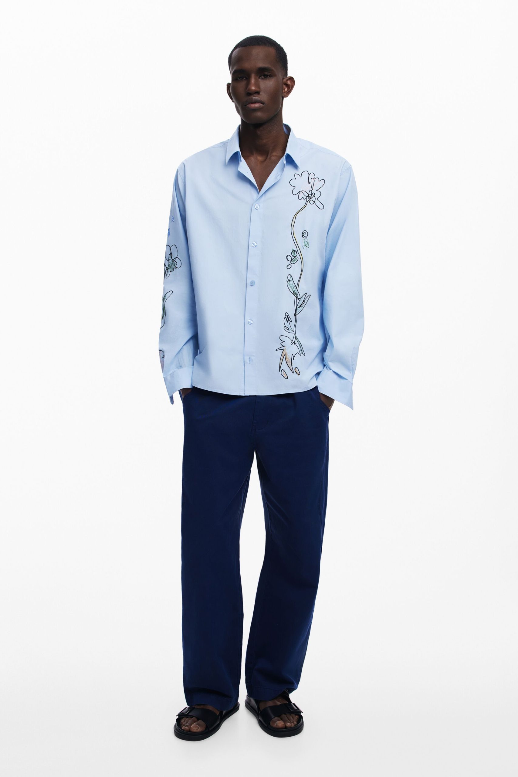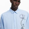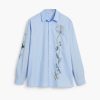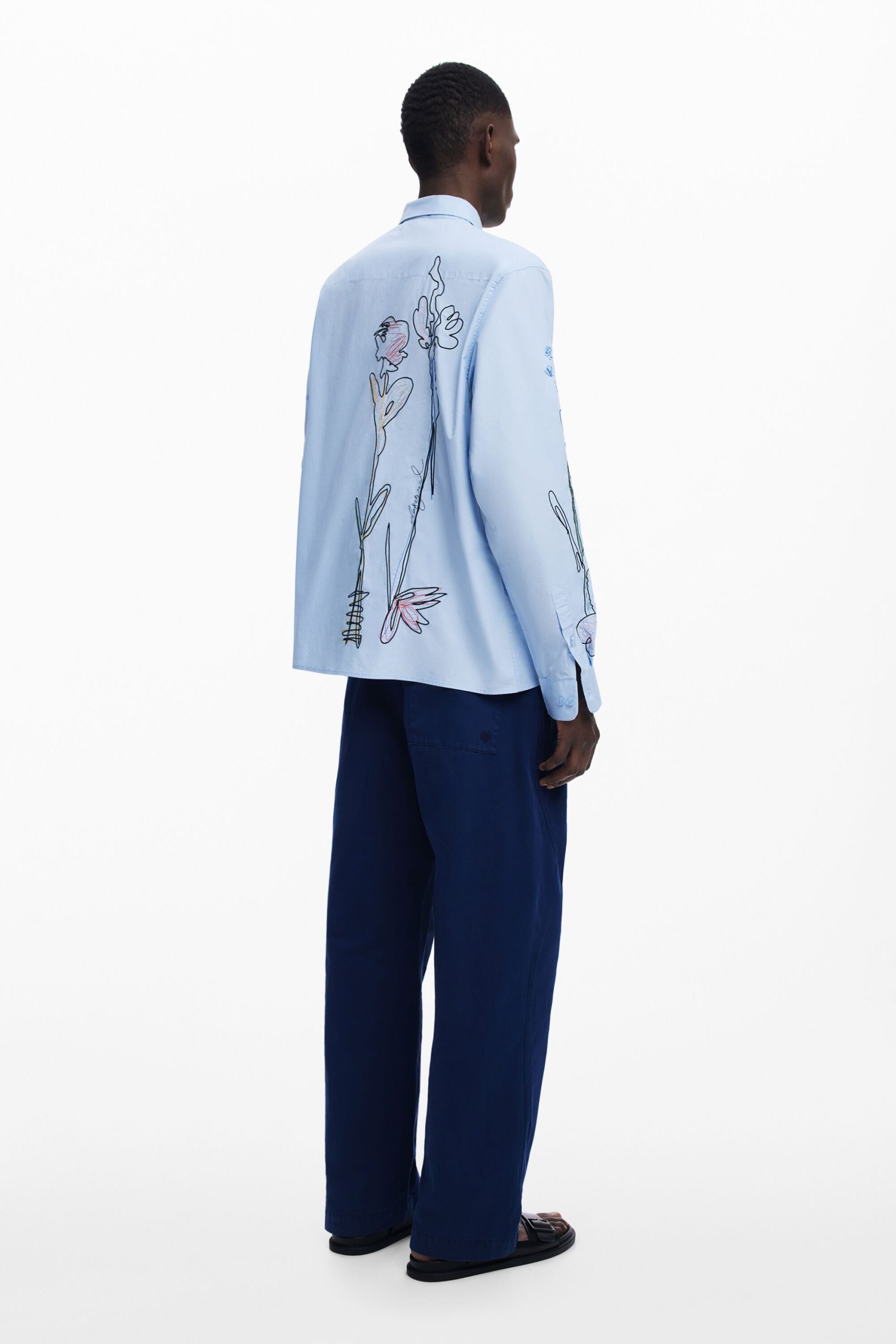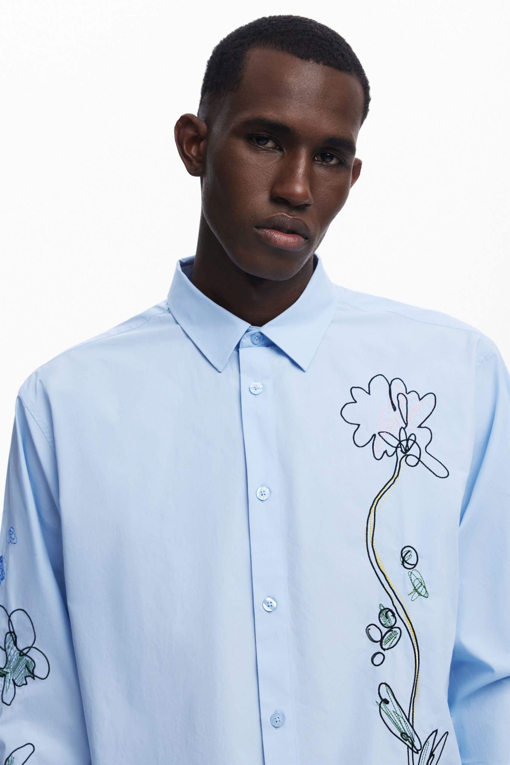 Long-sleeve shirt with flower embroidery and stitching on the front and one of the sleeves.