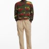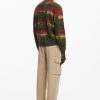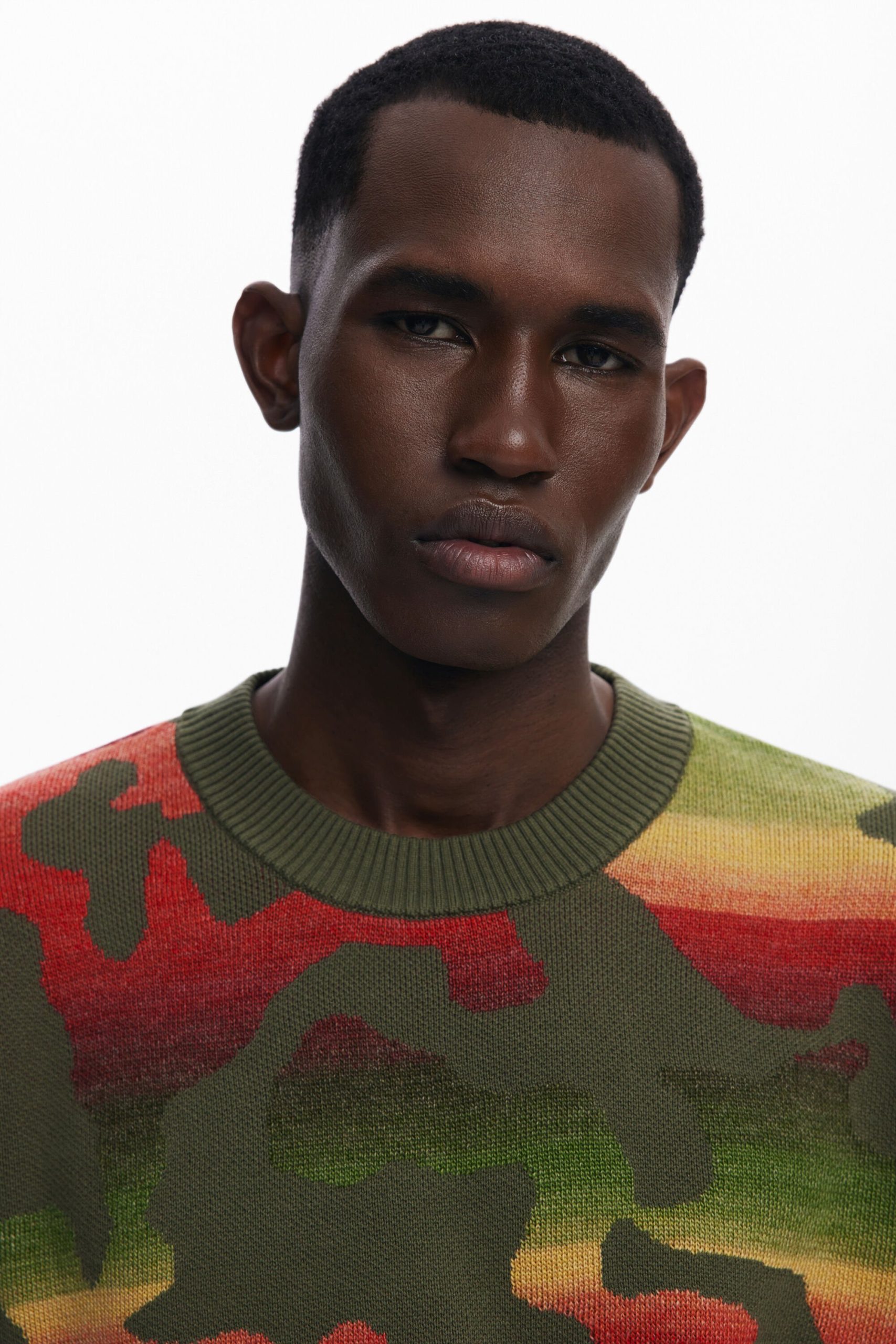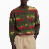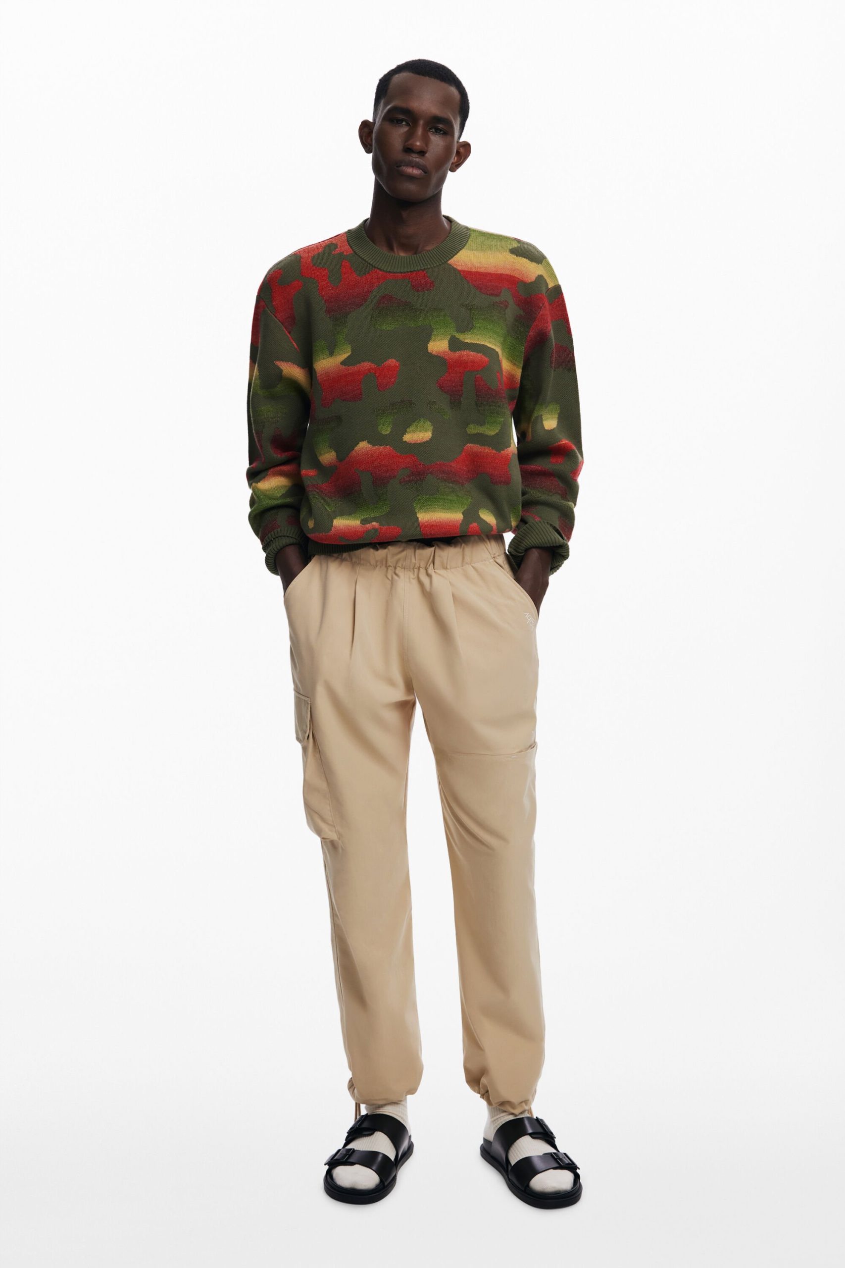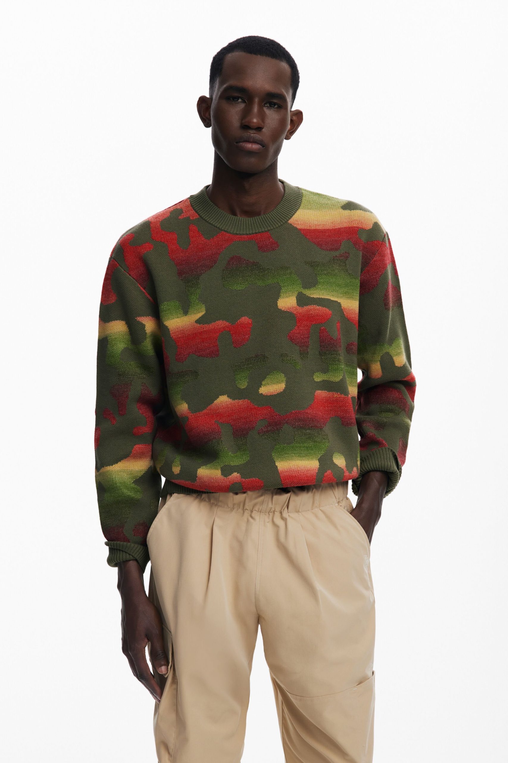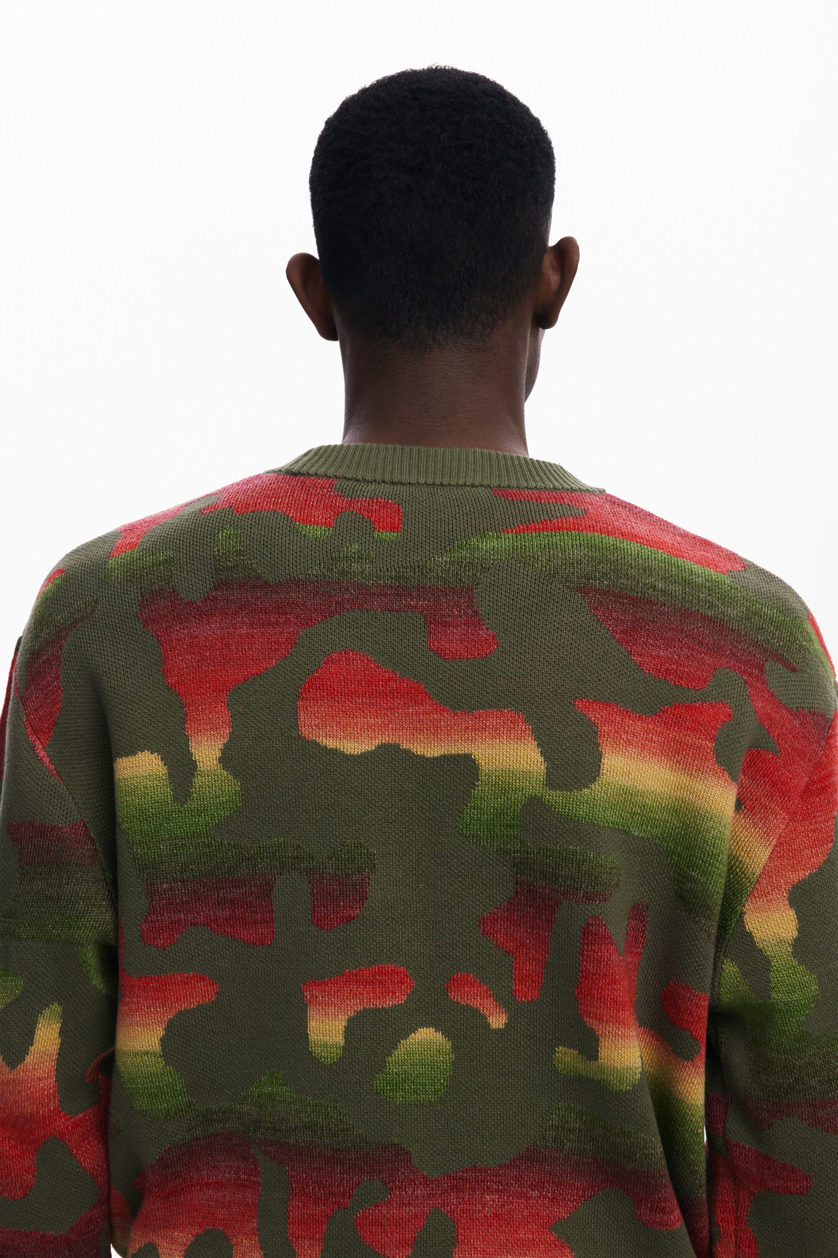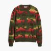 Thick long-sleeve sweater with an animal print design over a gradient of stripes in different colors.