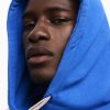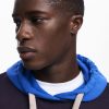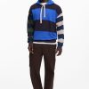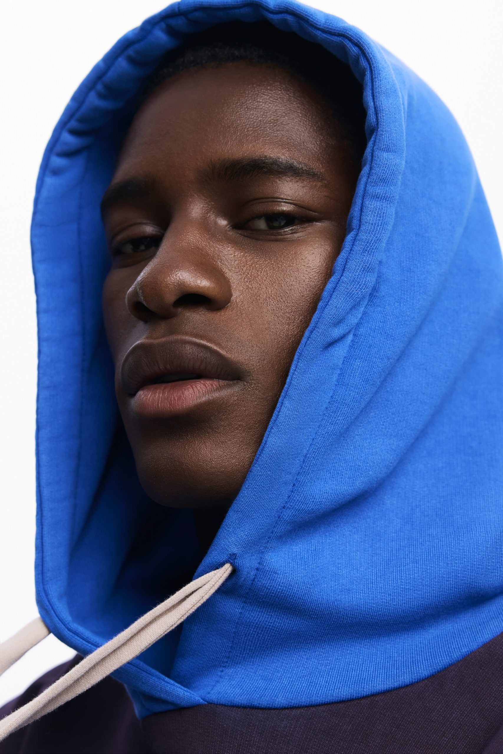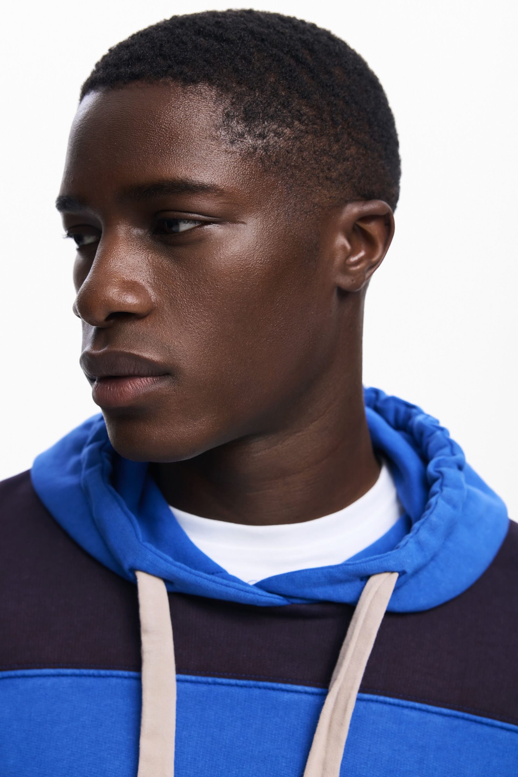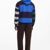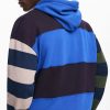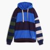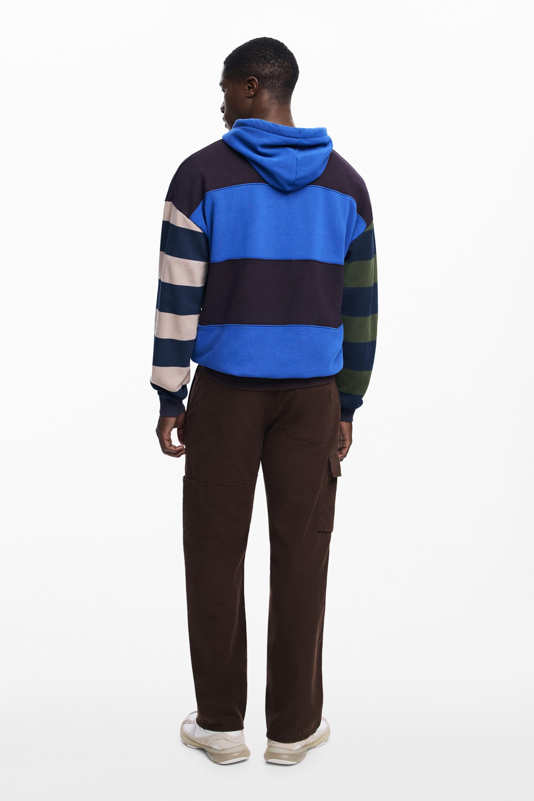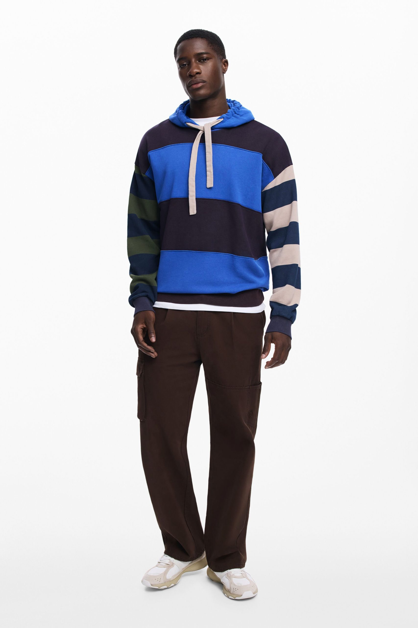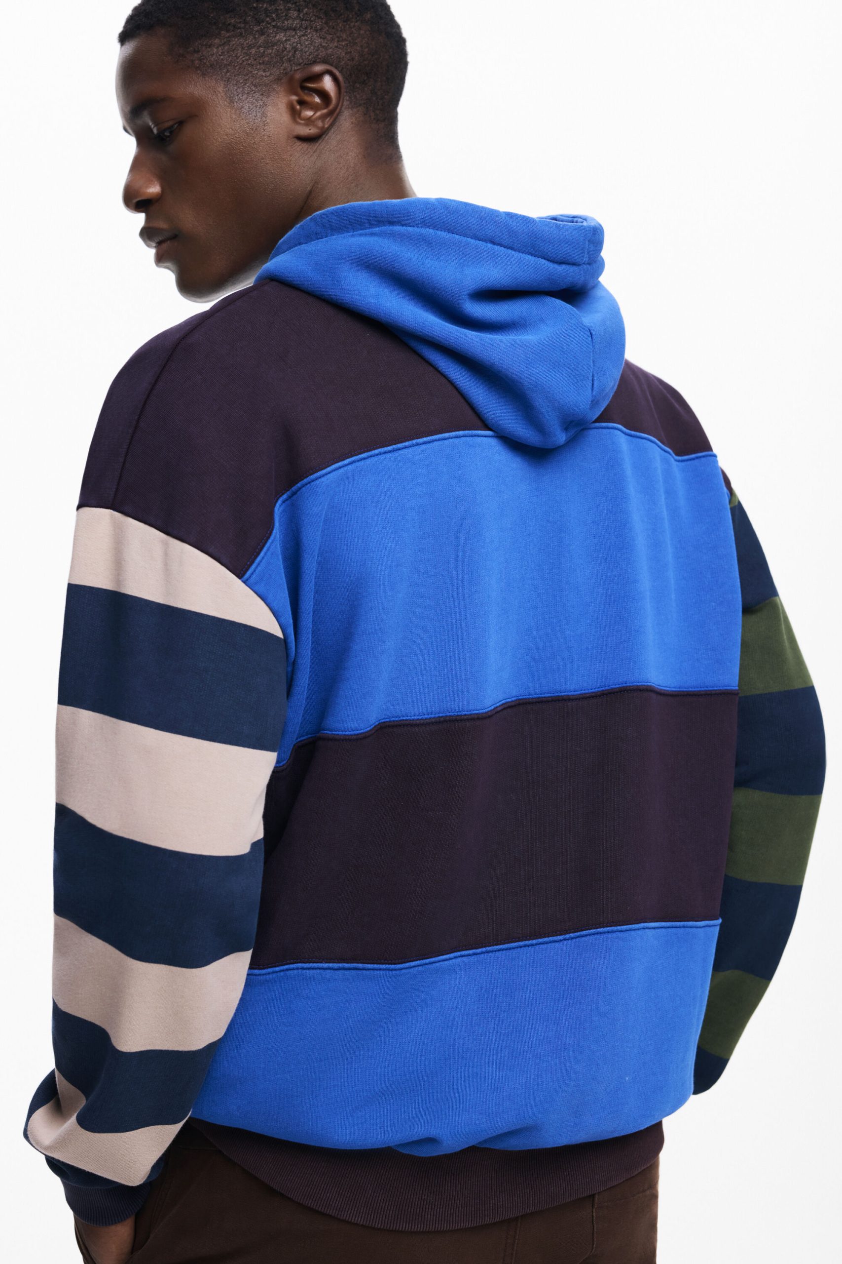 Wide hoodie with adjustable drawstring, striped print, and embroidered logo on the hem.