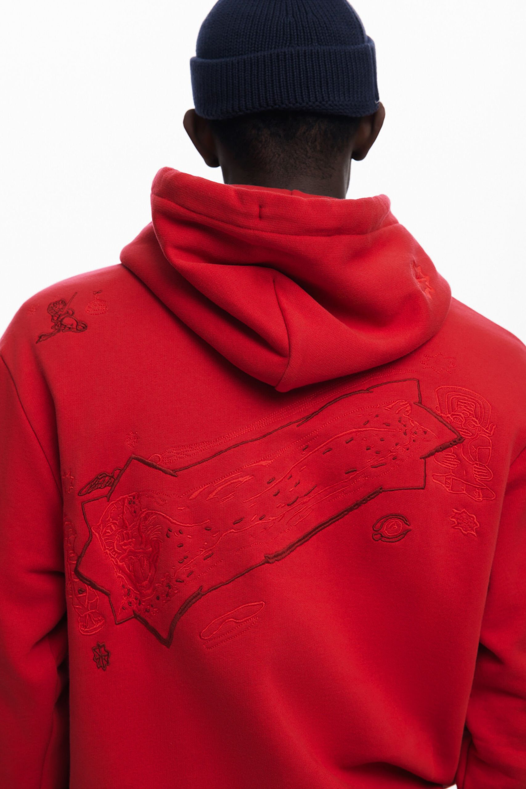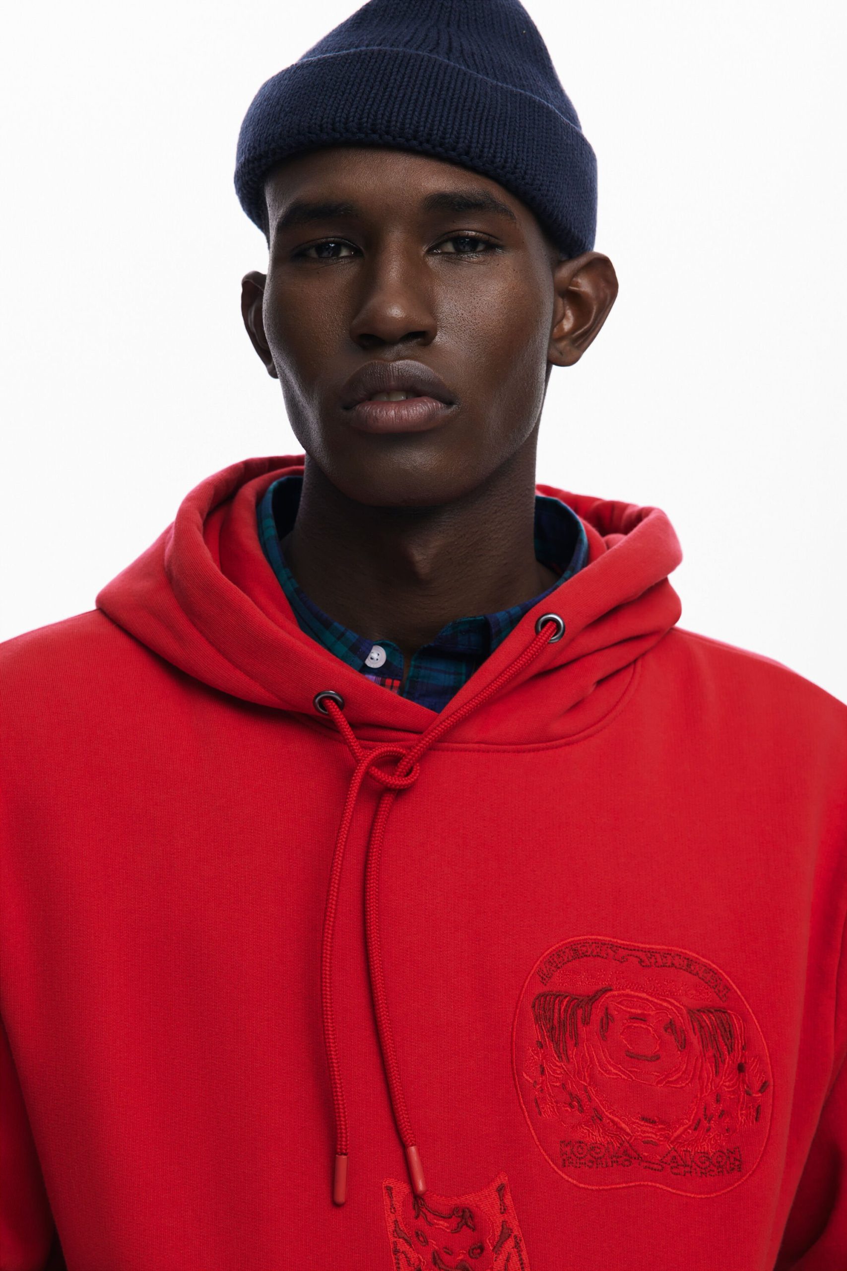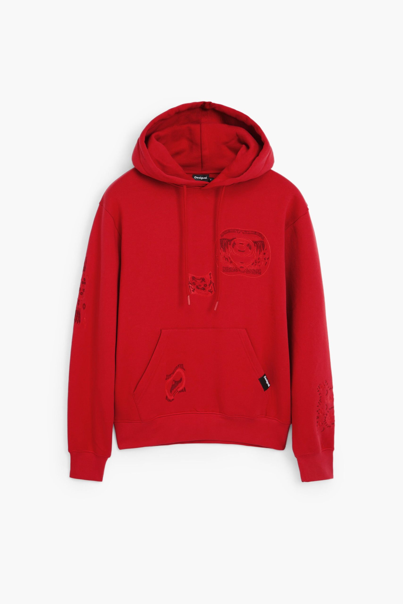 Solid color hoodie with adjustable hood, front pocket, and embroidered Asian-inspired details.