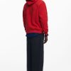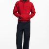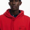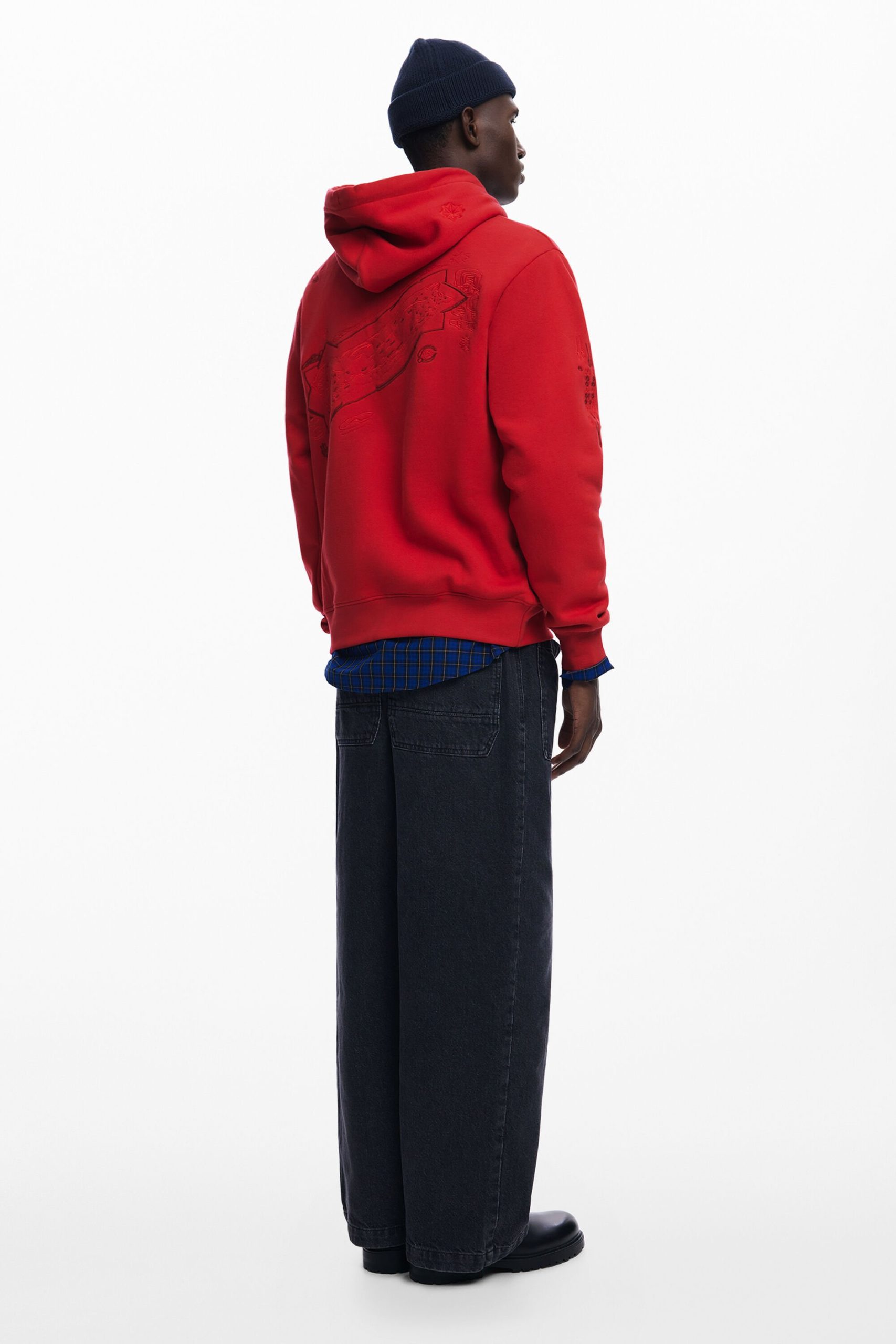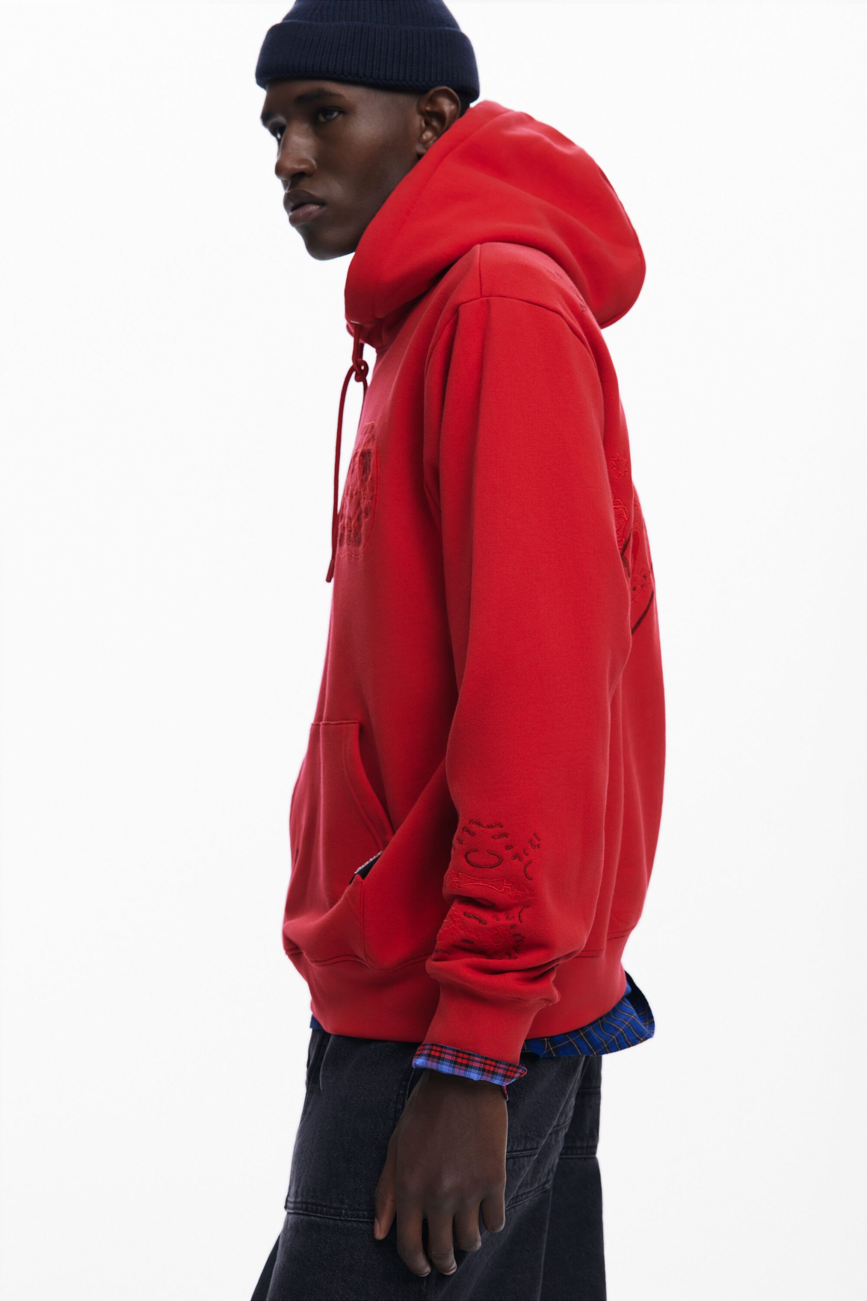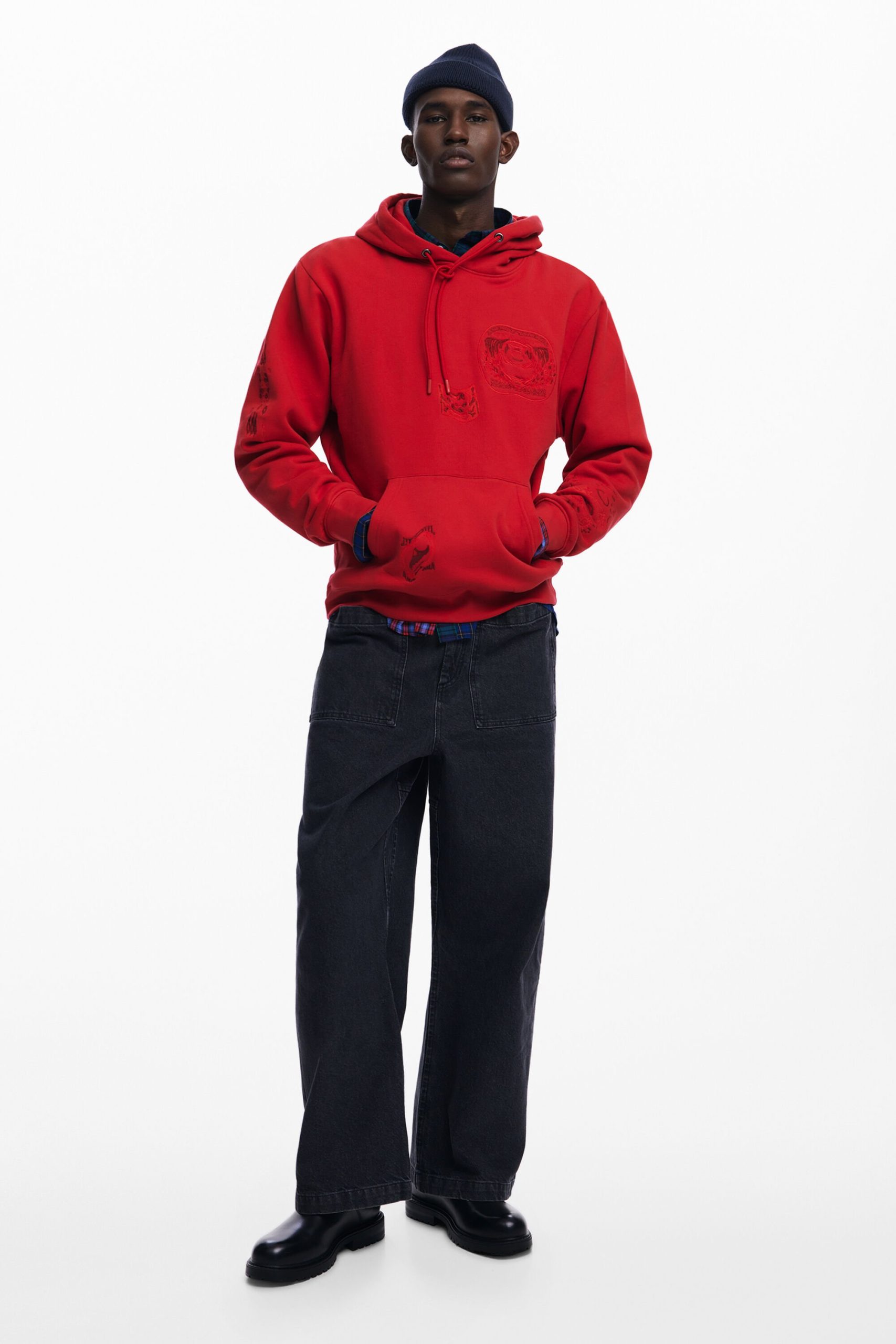 Solid color hoodie with adjustable hood, front pocket, and embroidered Asian-inspired details.
