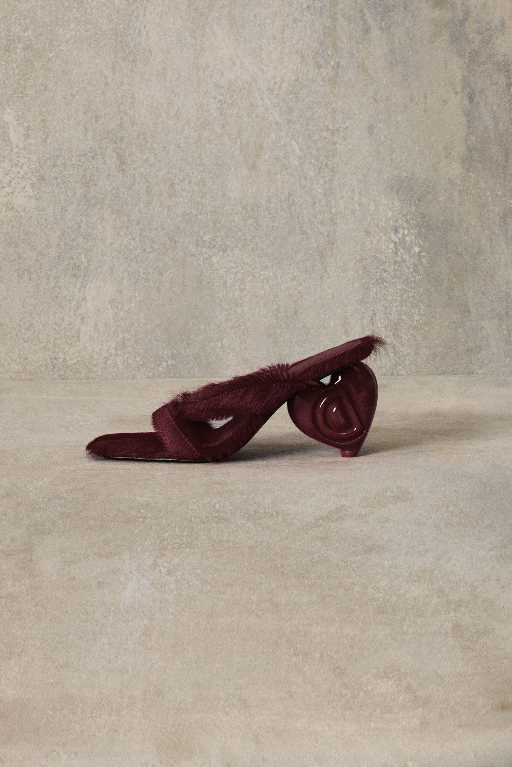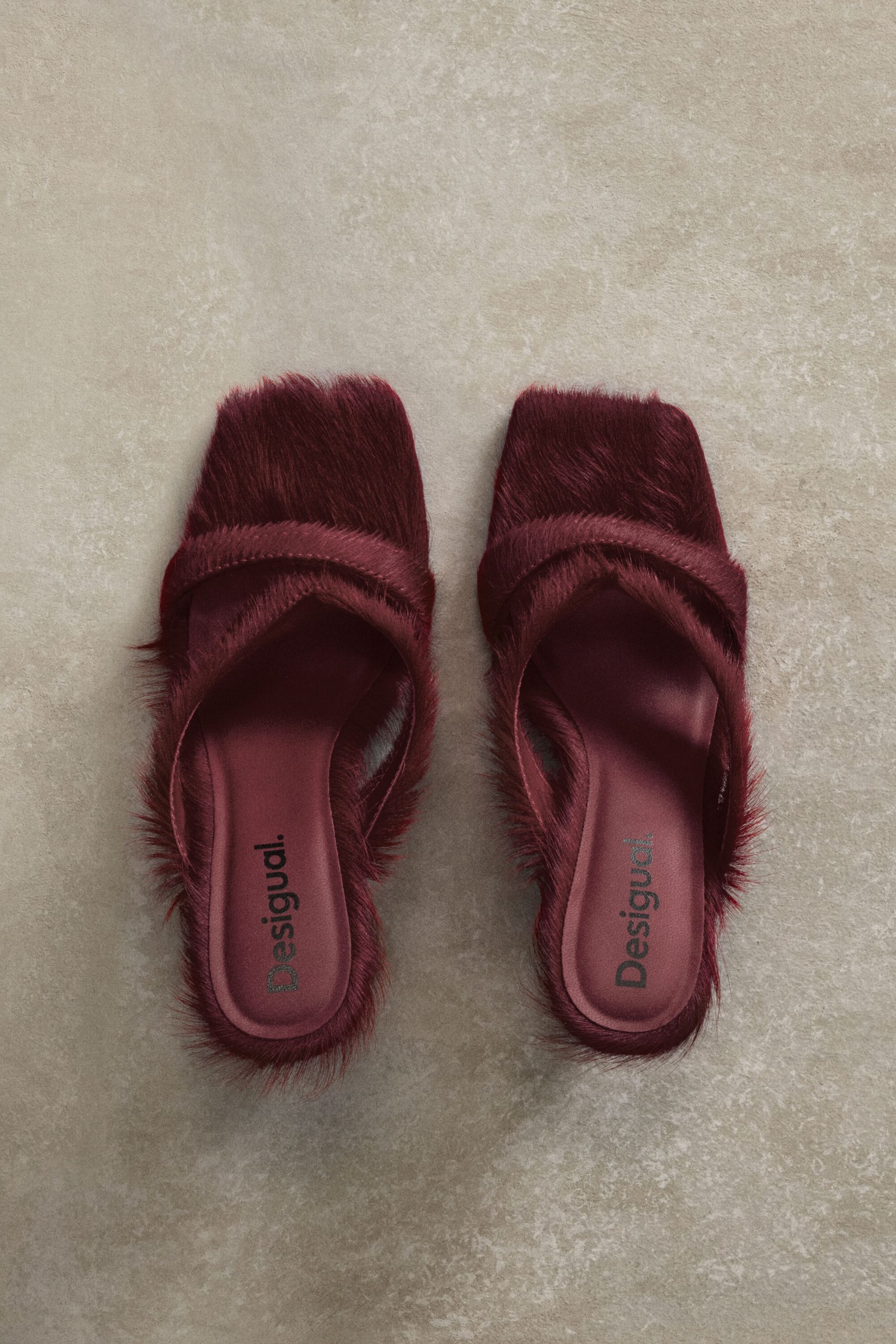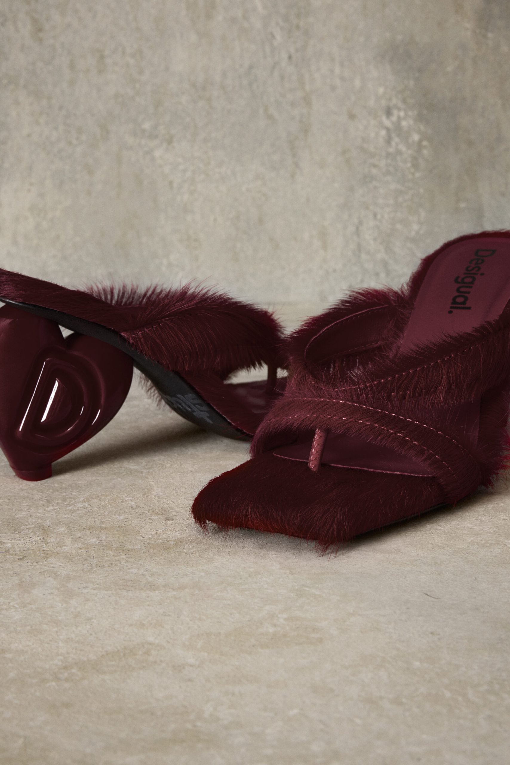 Open square-toe sandals, with heart-shaped heel and Desigual logo, made of leather with a fur finish.
