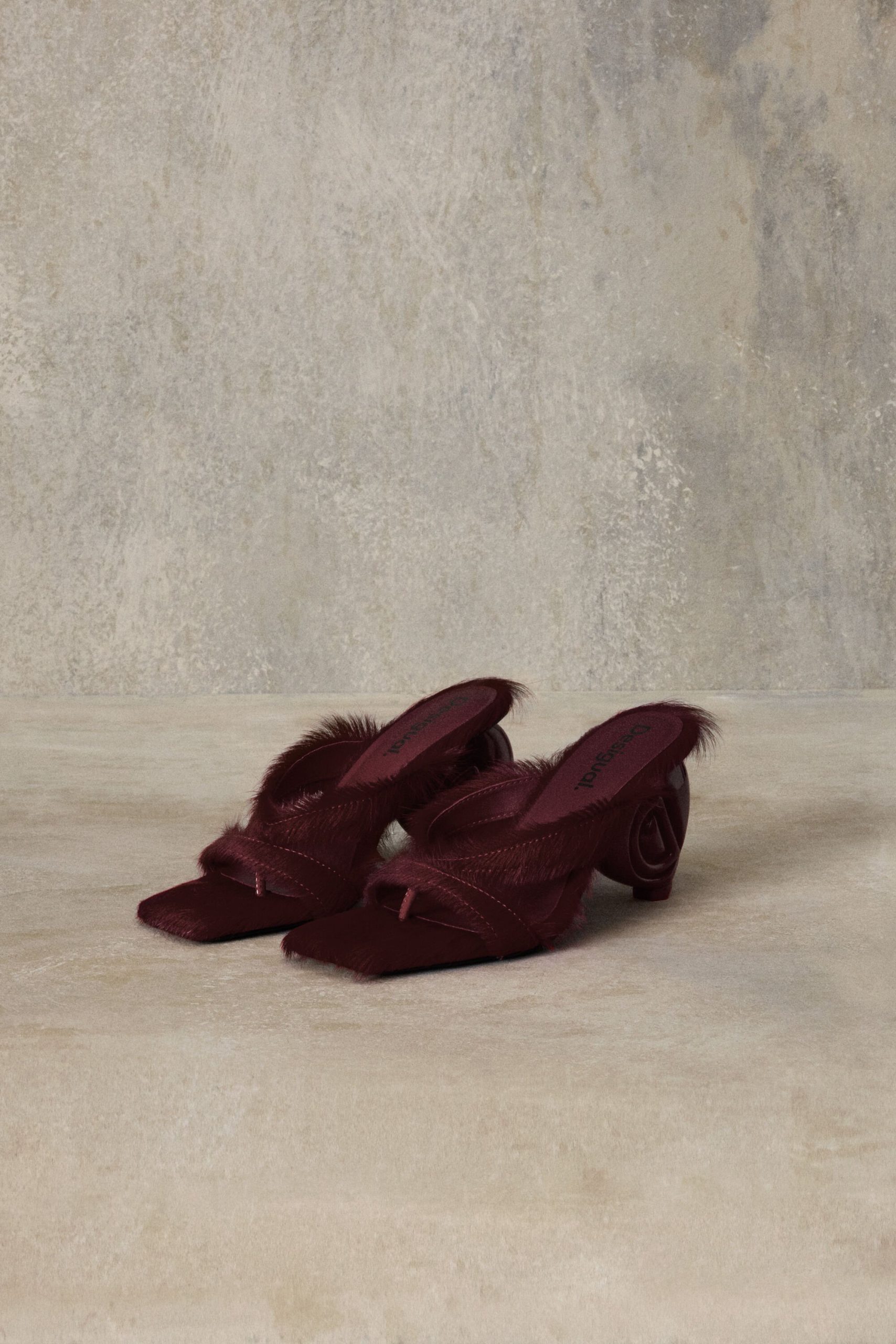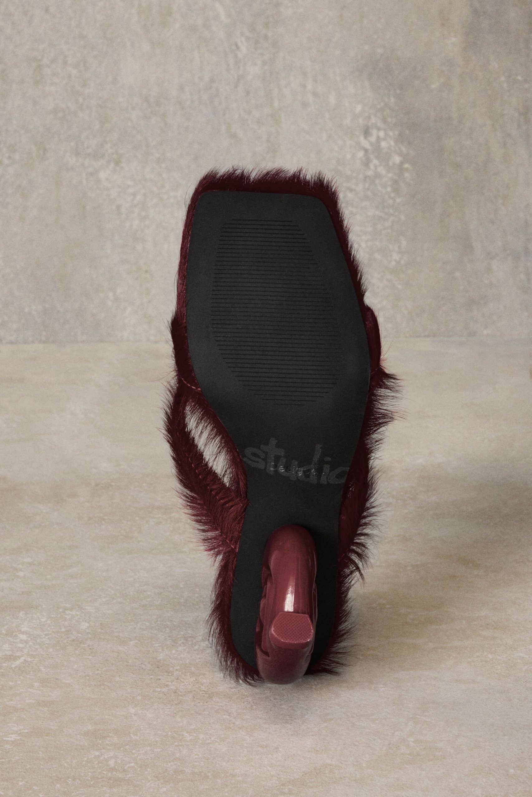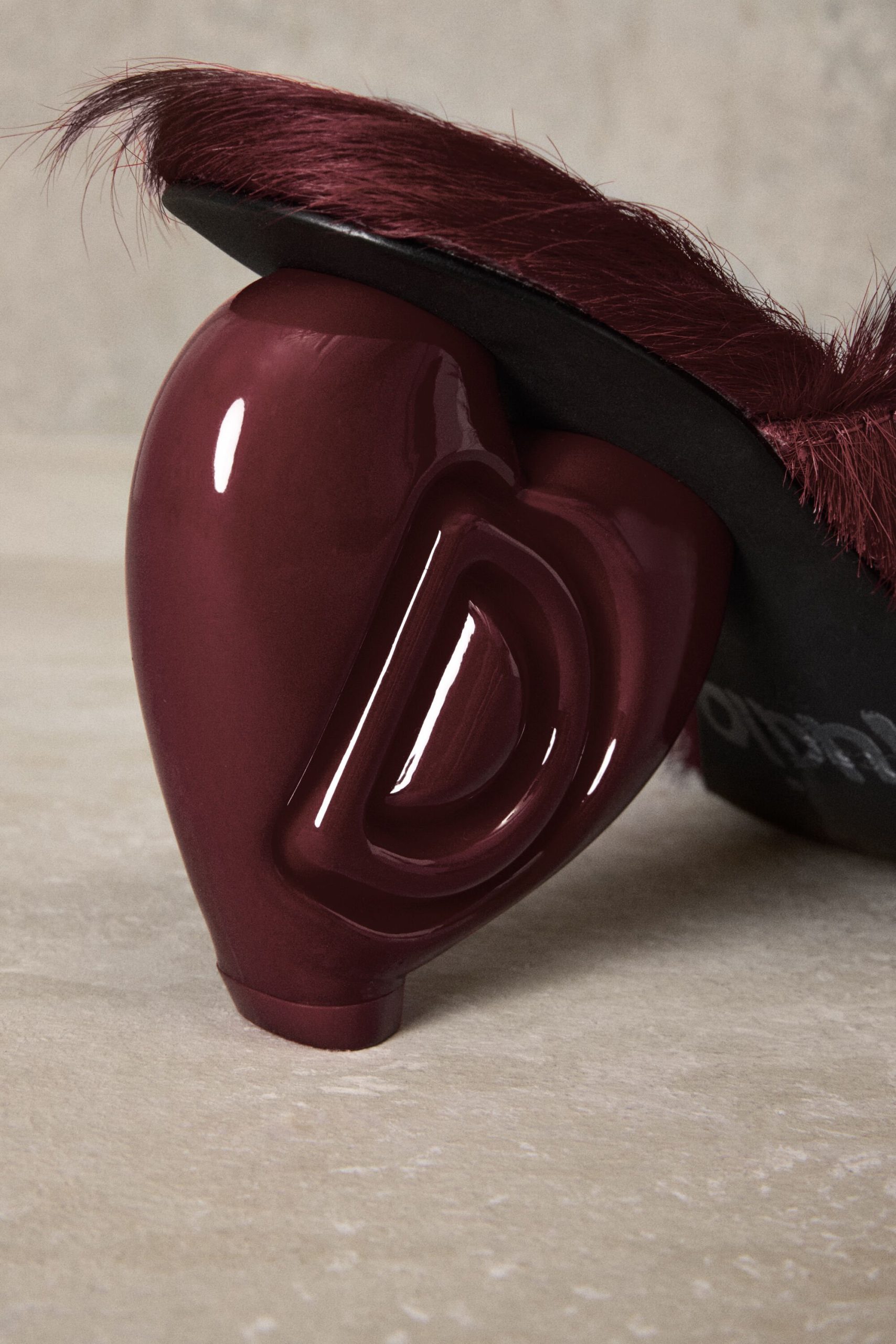Open square-toe sandals, with heart-shaped heel and Desigual logo, made of leather with a fur finish.