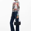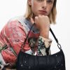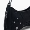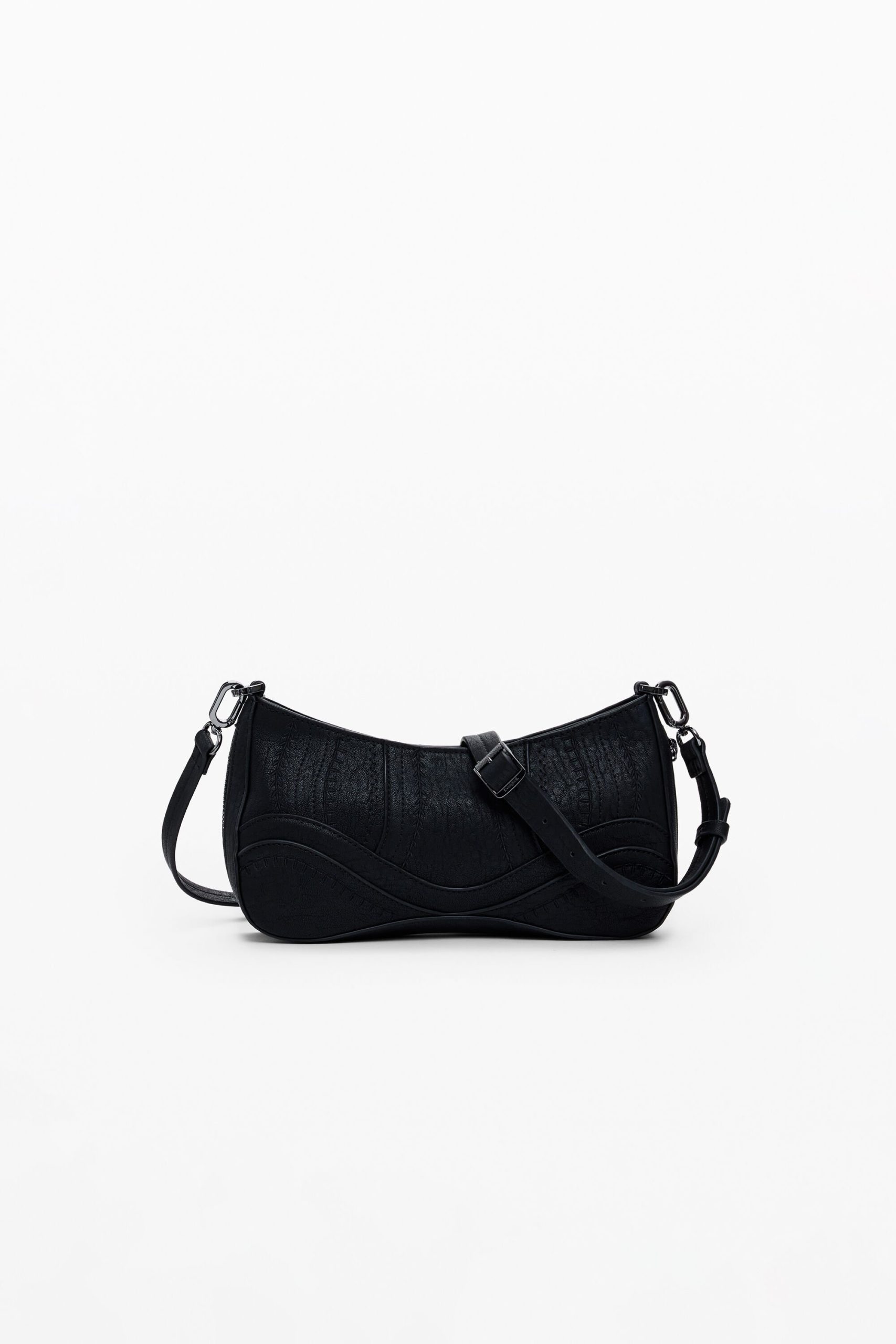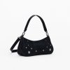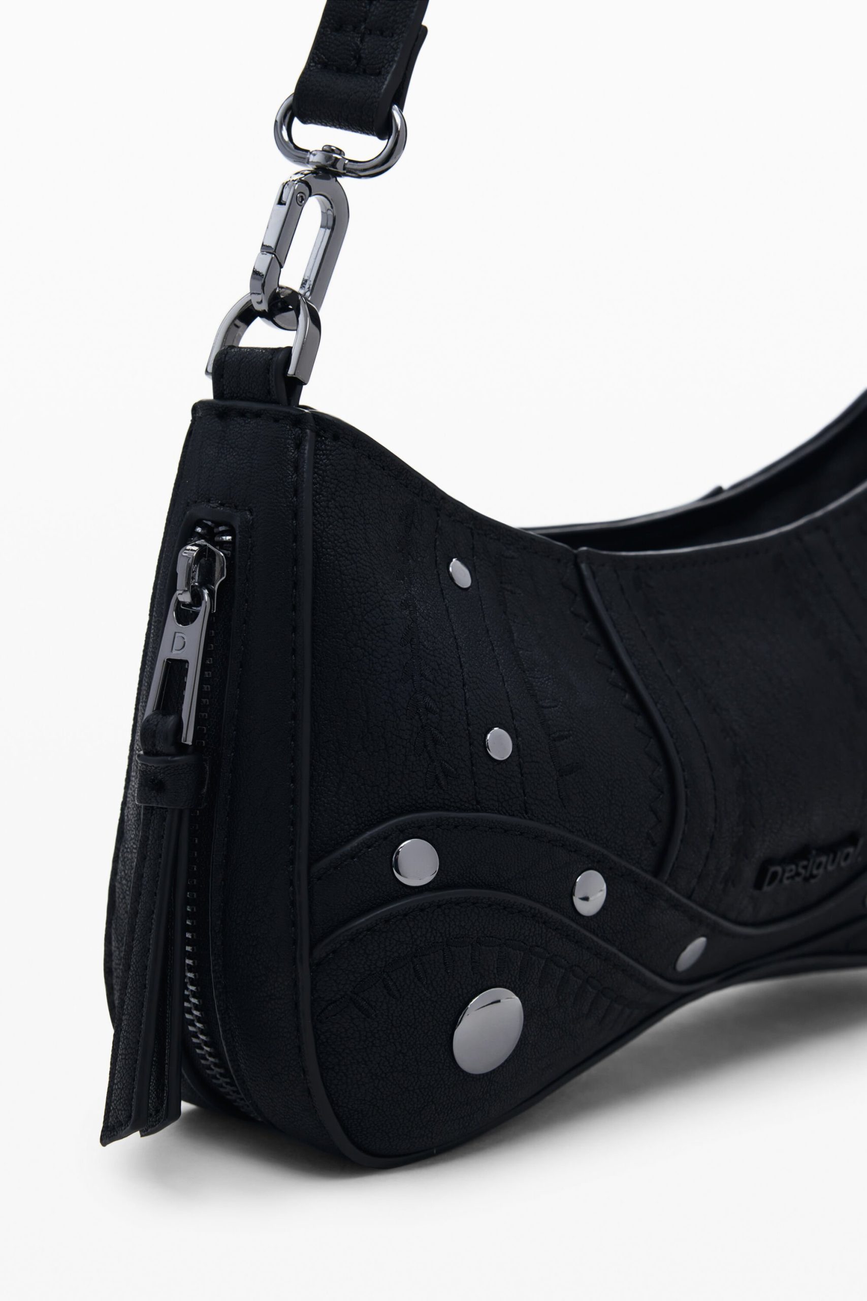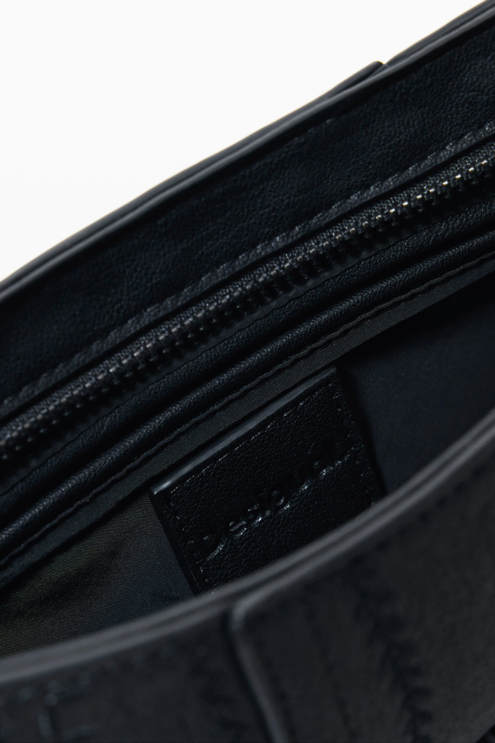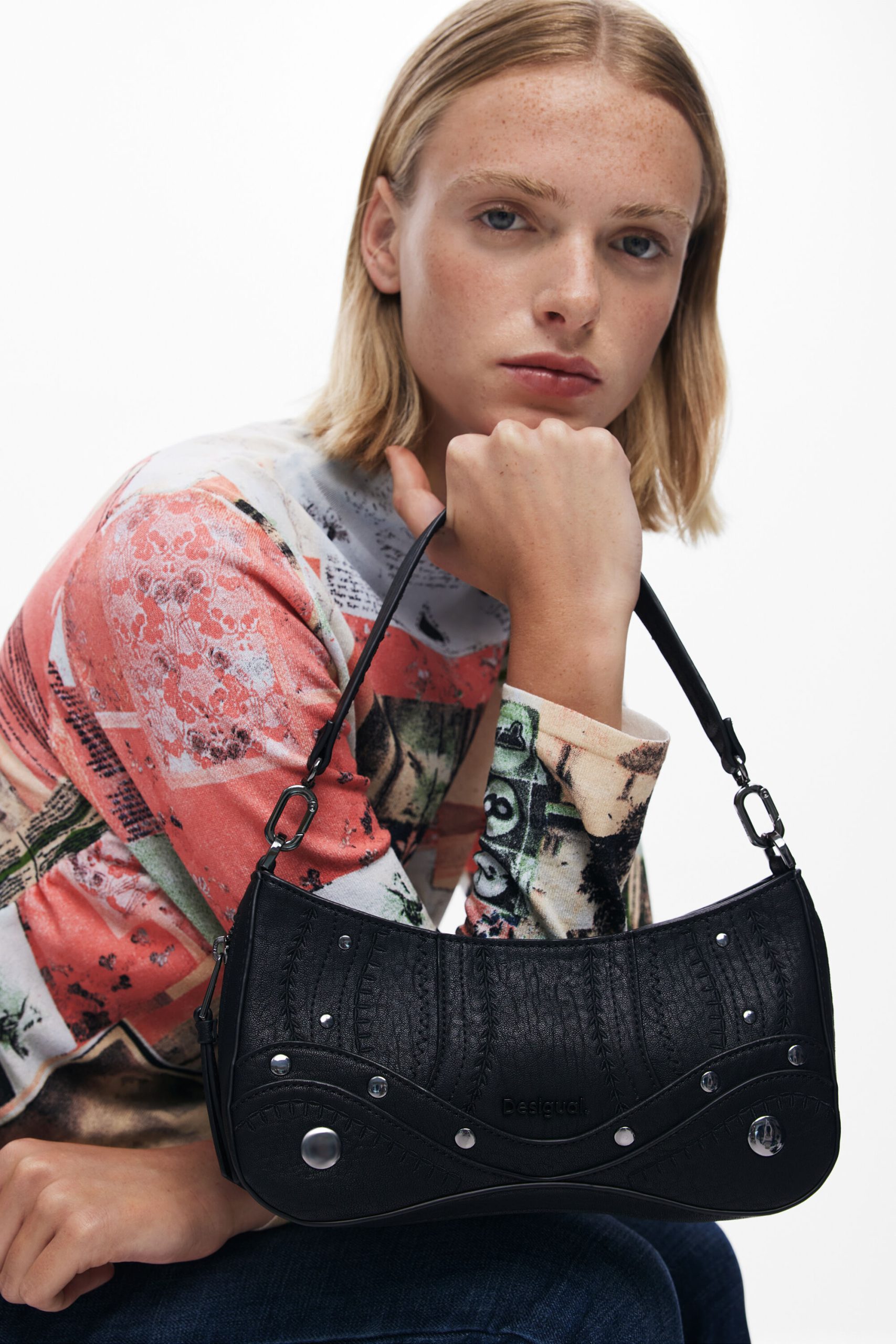 Small crossbody bag in solid color leather effect with patch effect, 3D embroidery, and metal stud detail.