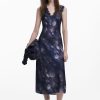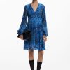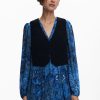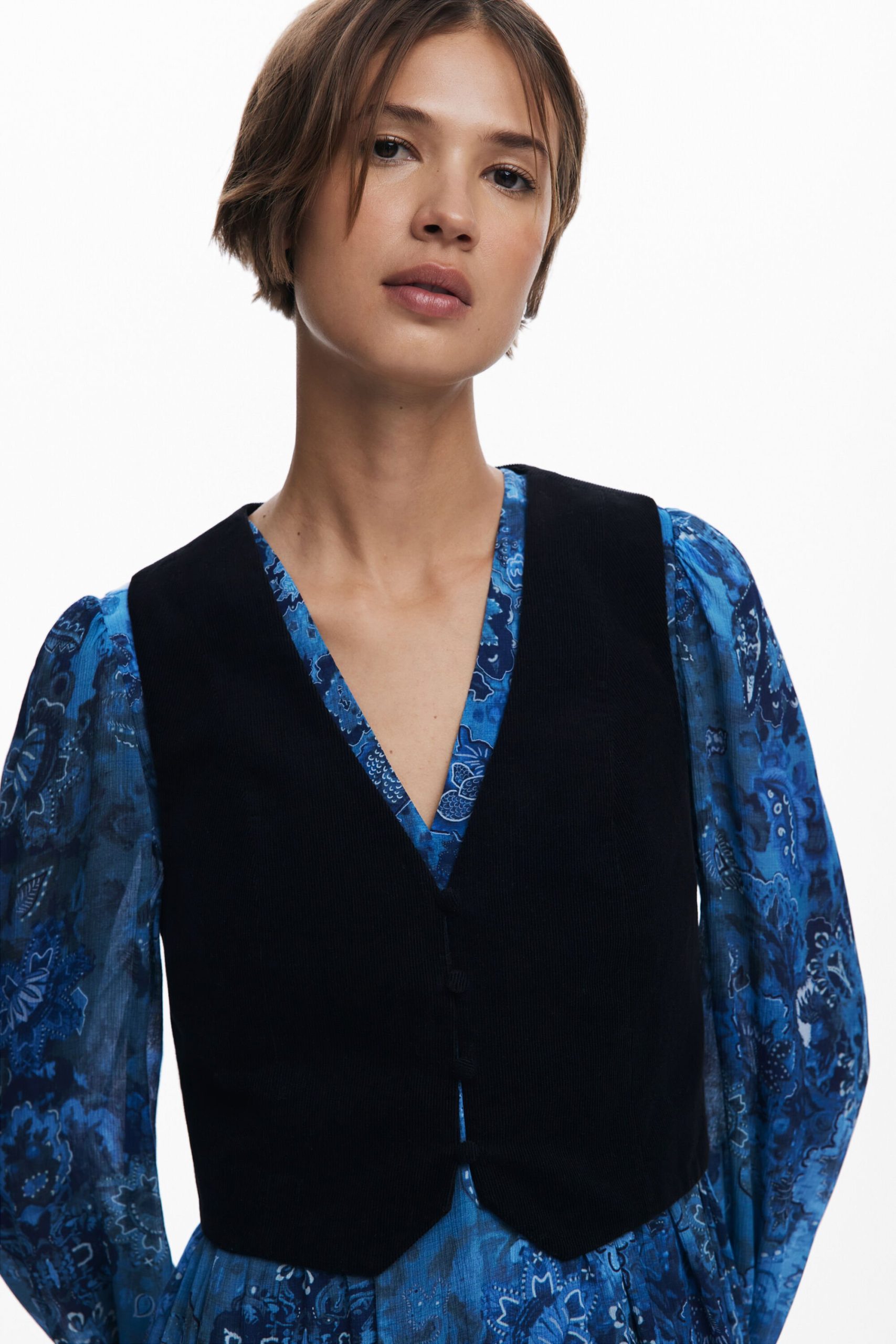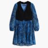 Short Boho-inspired dress with long sleeves, V-neckline, and flared skirt with removable vest.