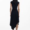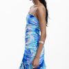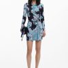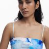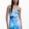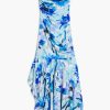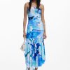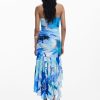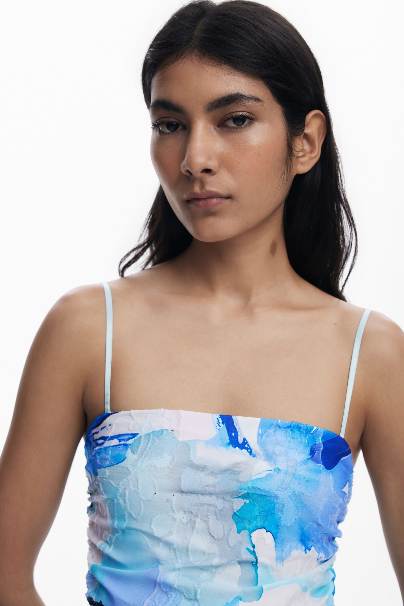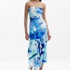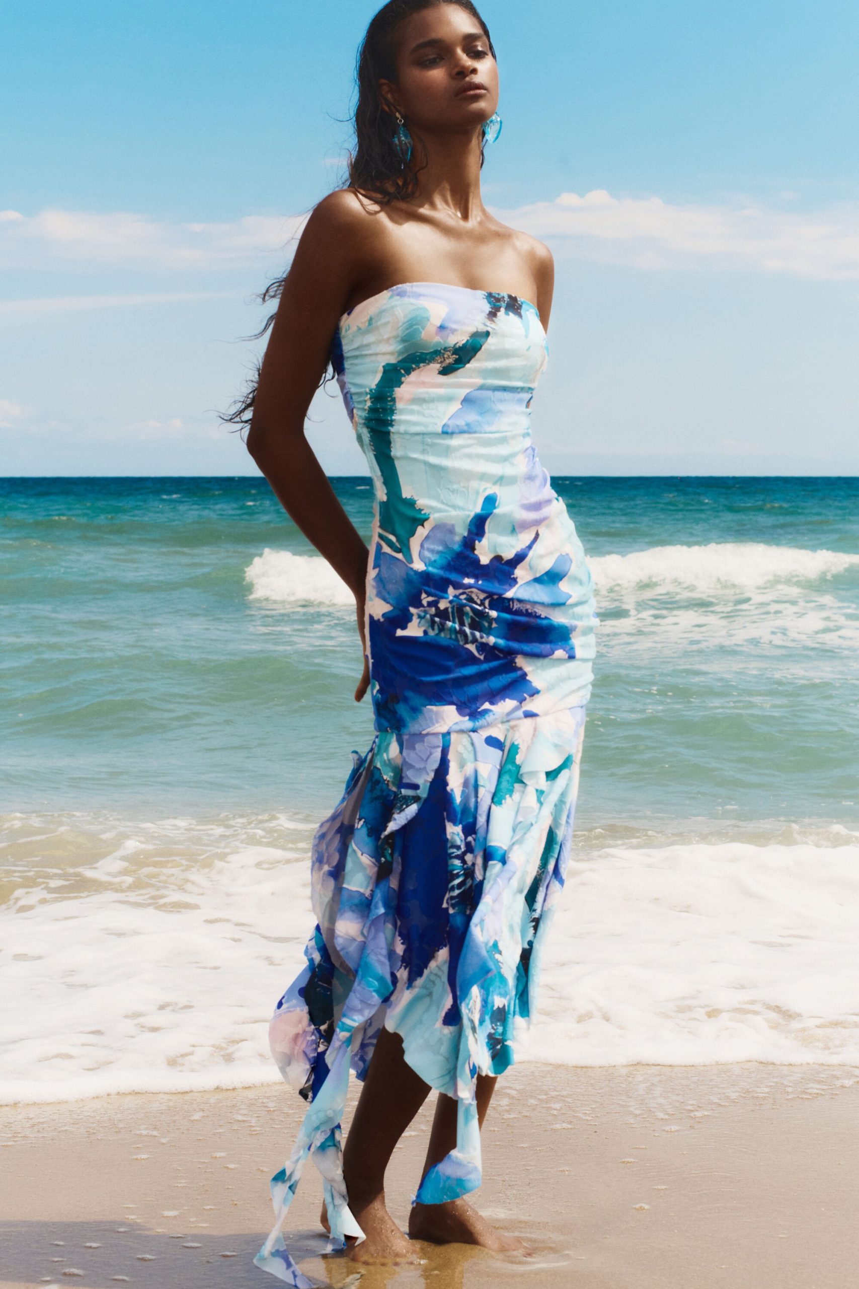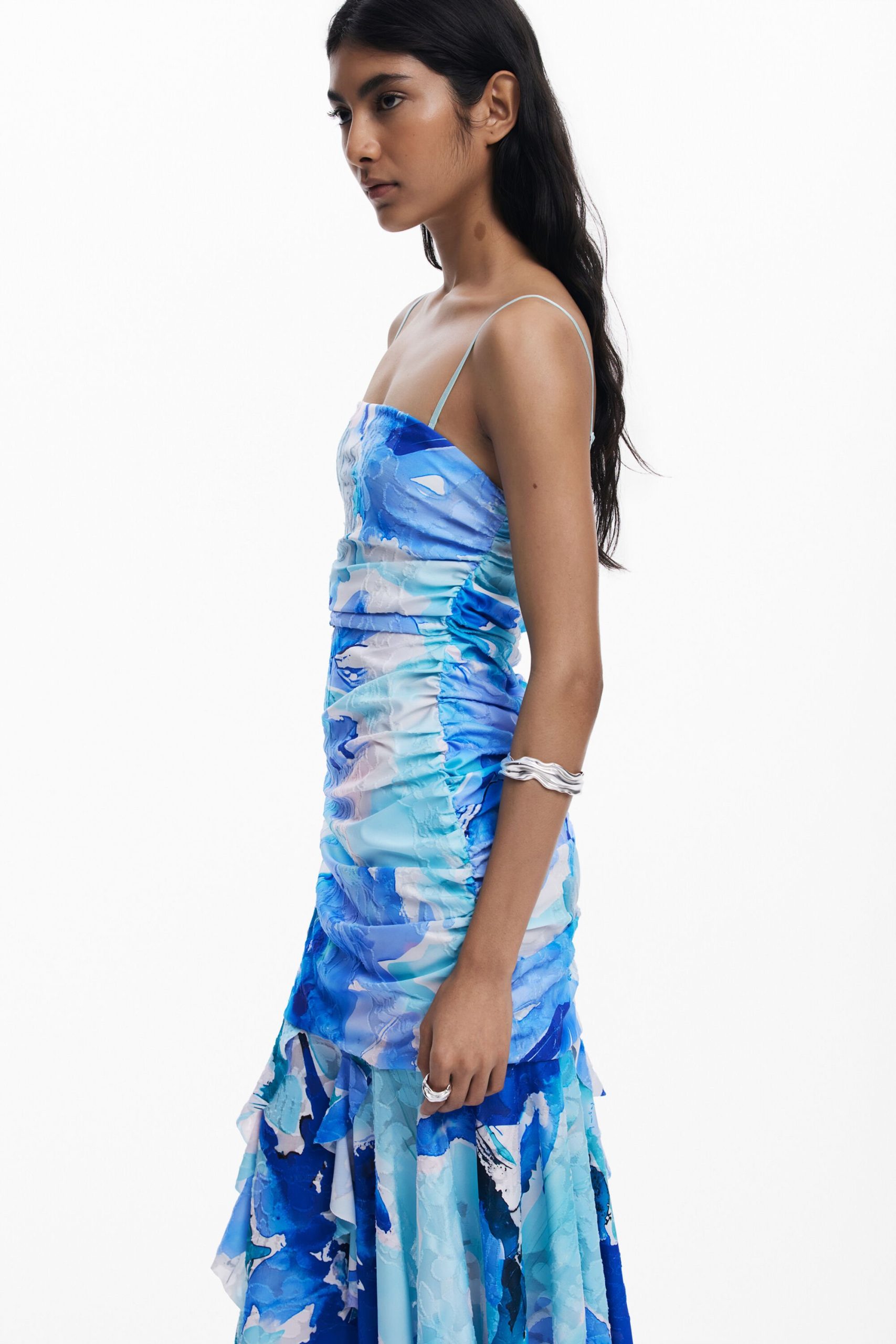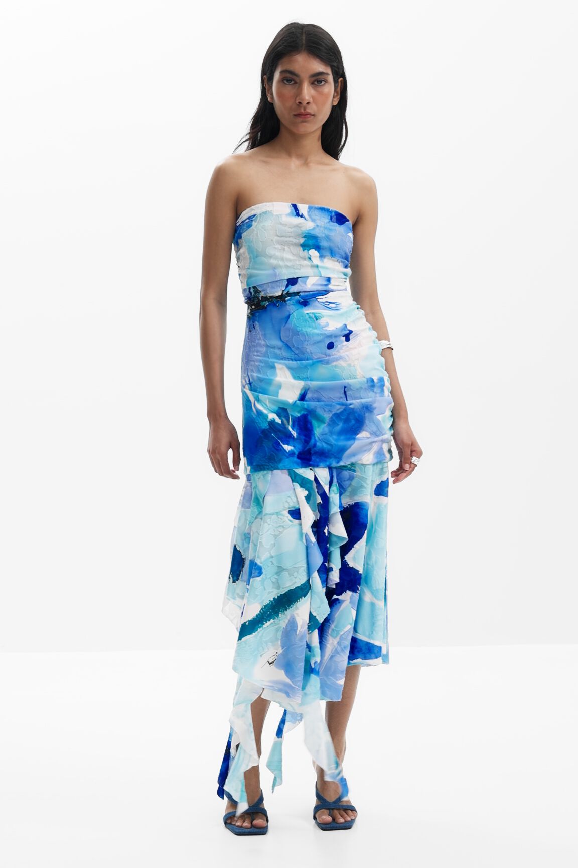 Dress with bandeau neckline, removable adjustable thin straps, with draping and asymmetric skirt with ruffles and floral print in blue tones.