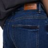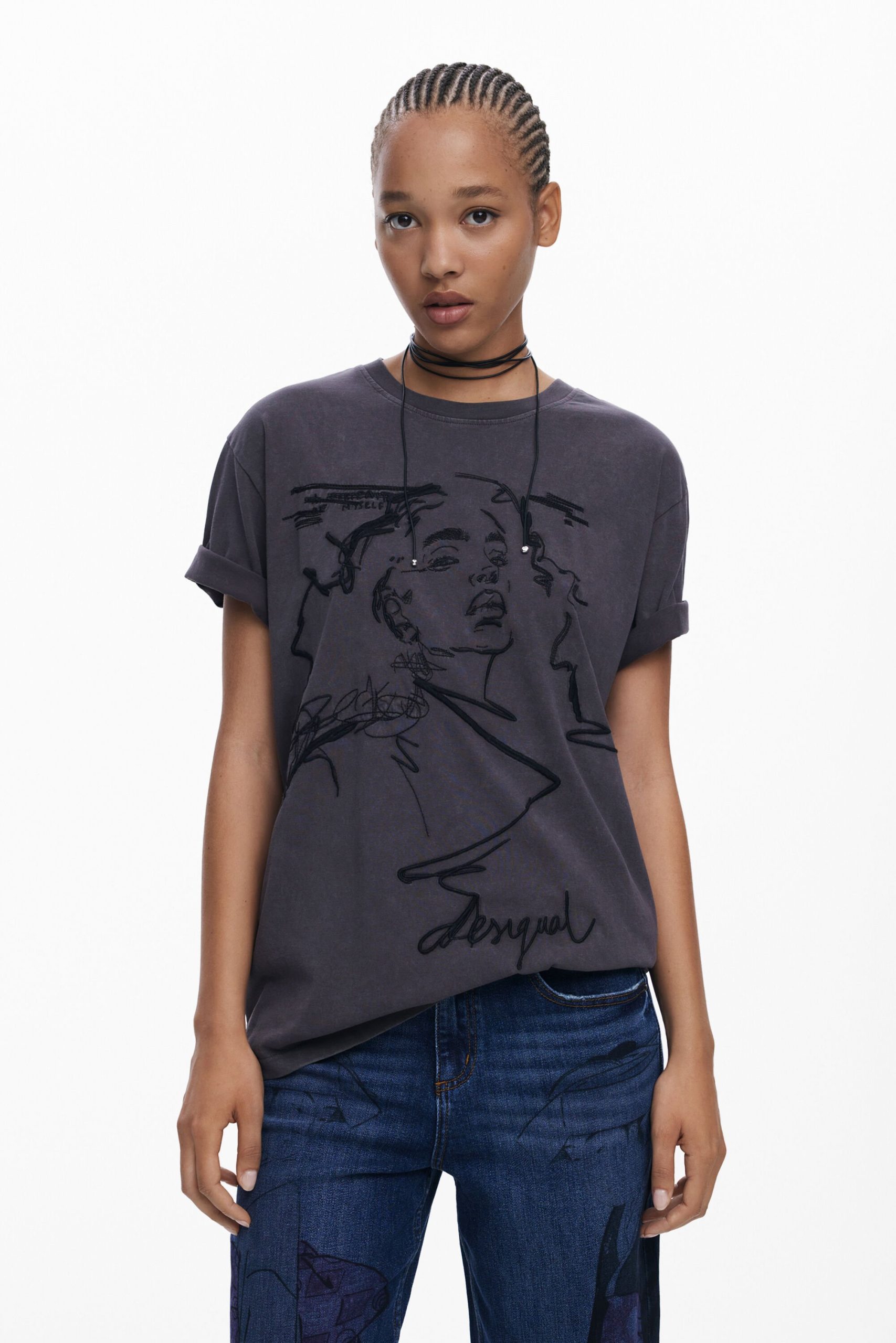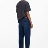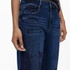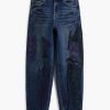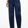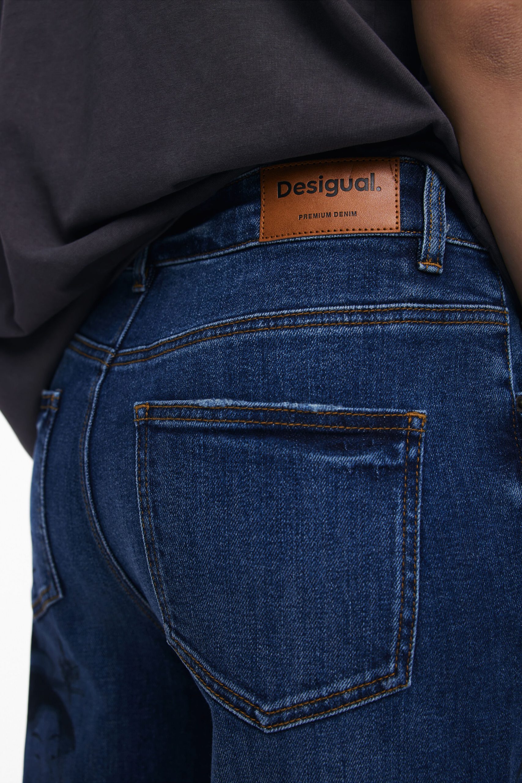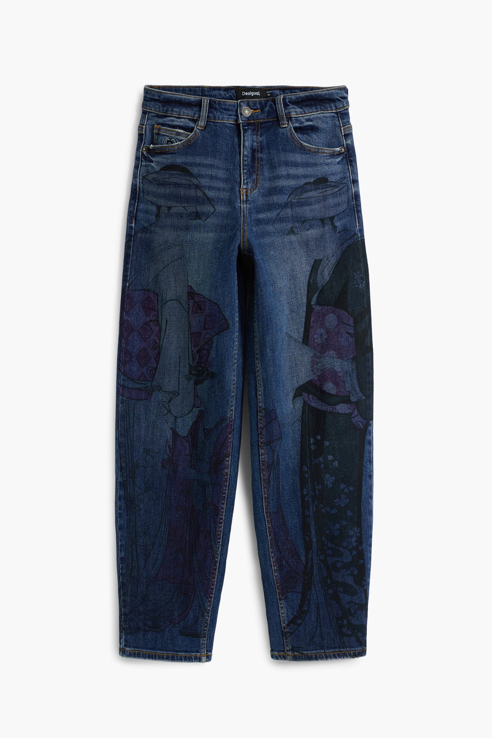 Long denim pants with a worn effect, Boyfriend cut, and Samurai print with oriental motifs.