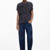 Long denim pants with a worn effect, Boyfriend cut, and Samurai print with oriental motifs.