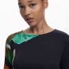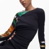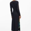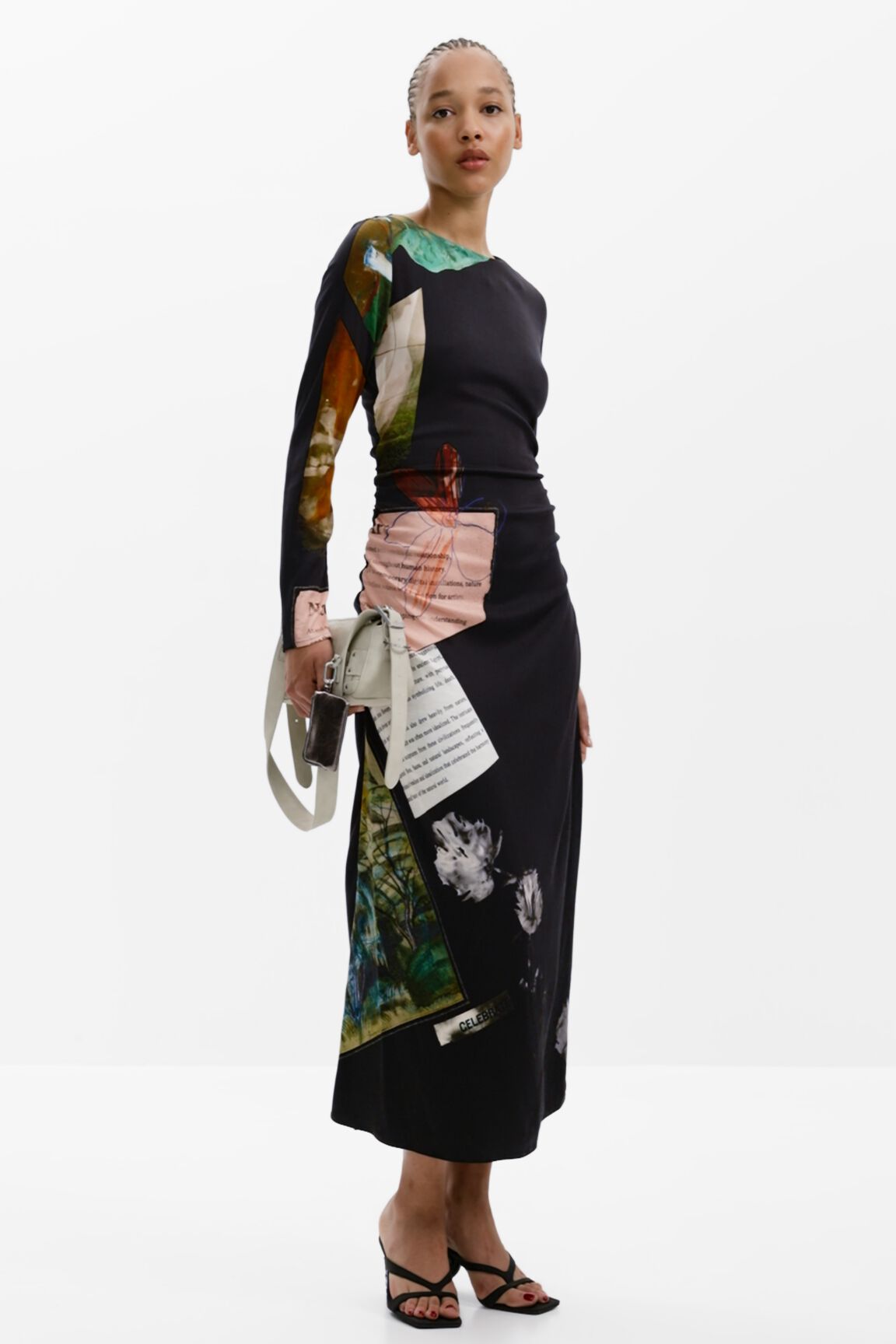 Long-sleeve dress, round neck, asymmetrical hem, side ruching, and Collage-style print.