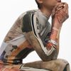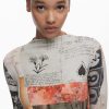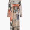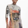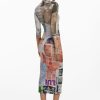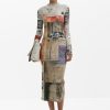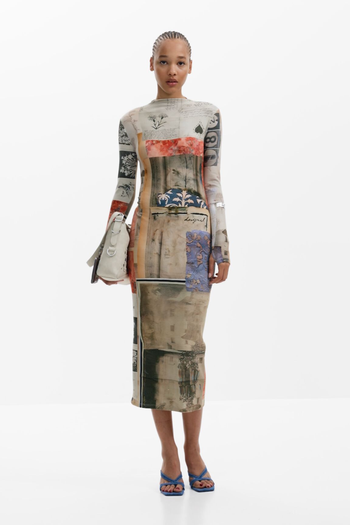 Fitted midi dress with a soft touch, long sleeves, turtleneck, and collage print.