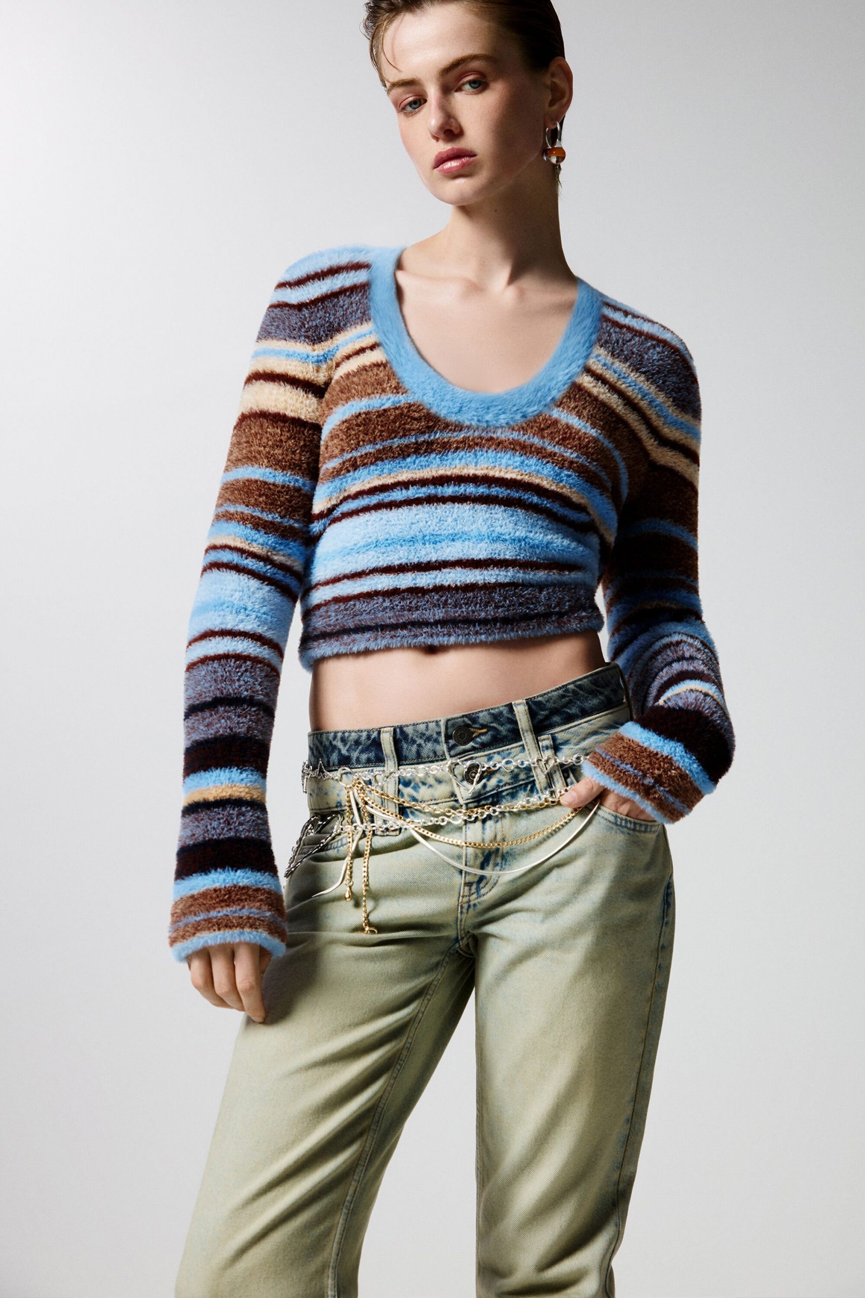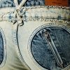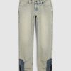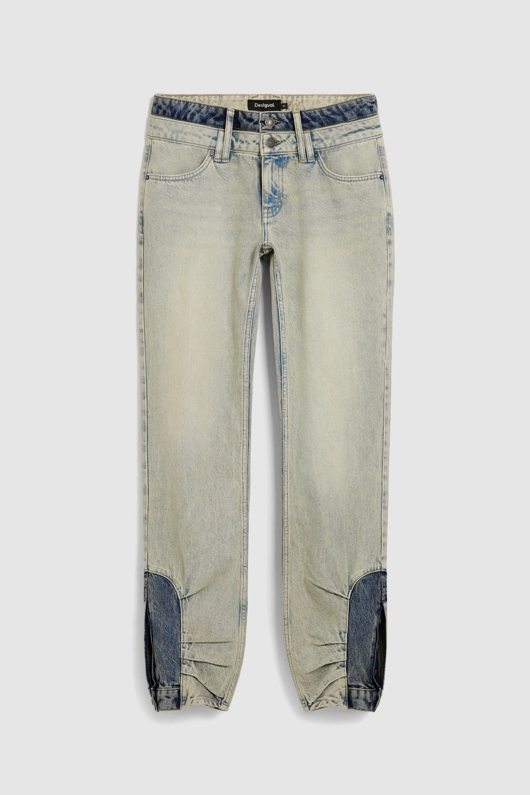 Jeans with double waistband, combined fabric, and hem details in jacket cuff style.