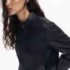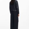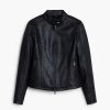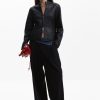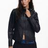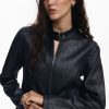 Short jacket in faux leather, zipper closure, mao collar, front pockets, and knitted fabric inside the sleeves.