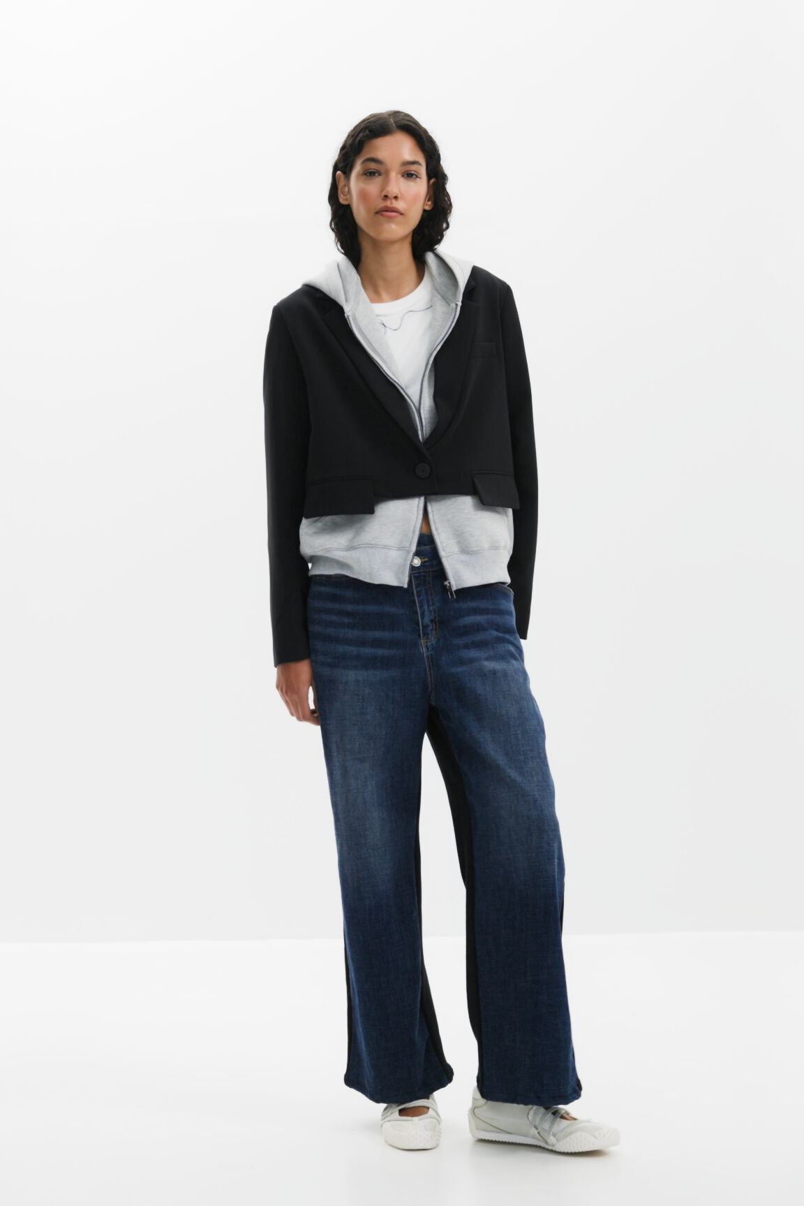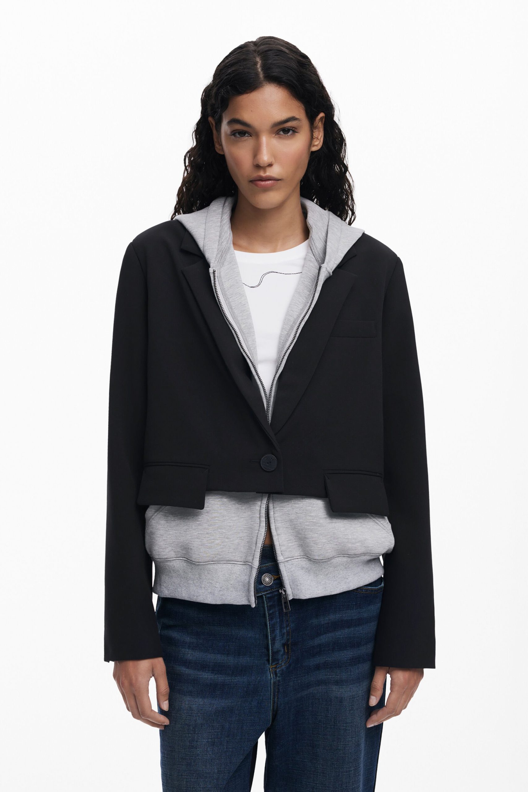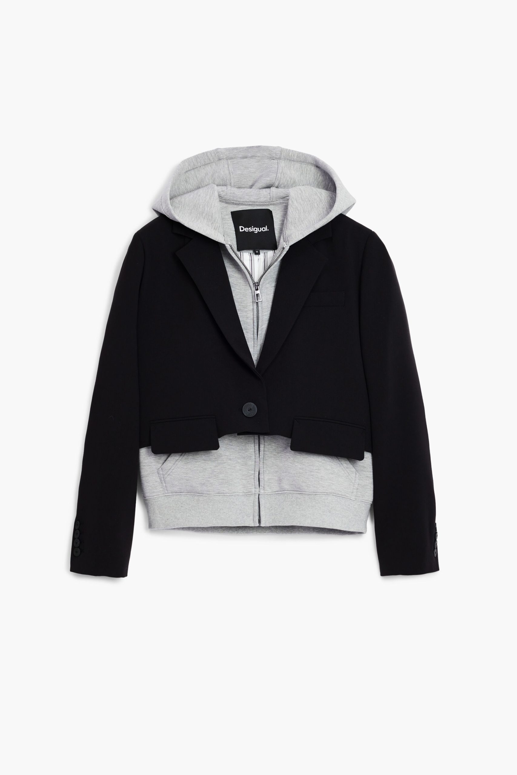 Two-tone blazer combined in knit with sweatshirt effect finish, front pockets, hood, and zipper and button closure.