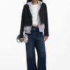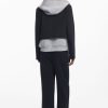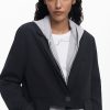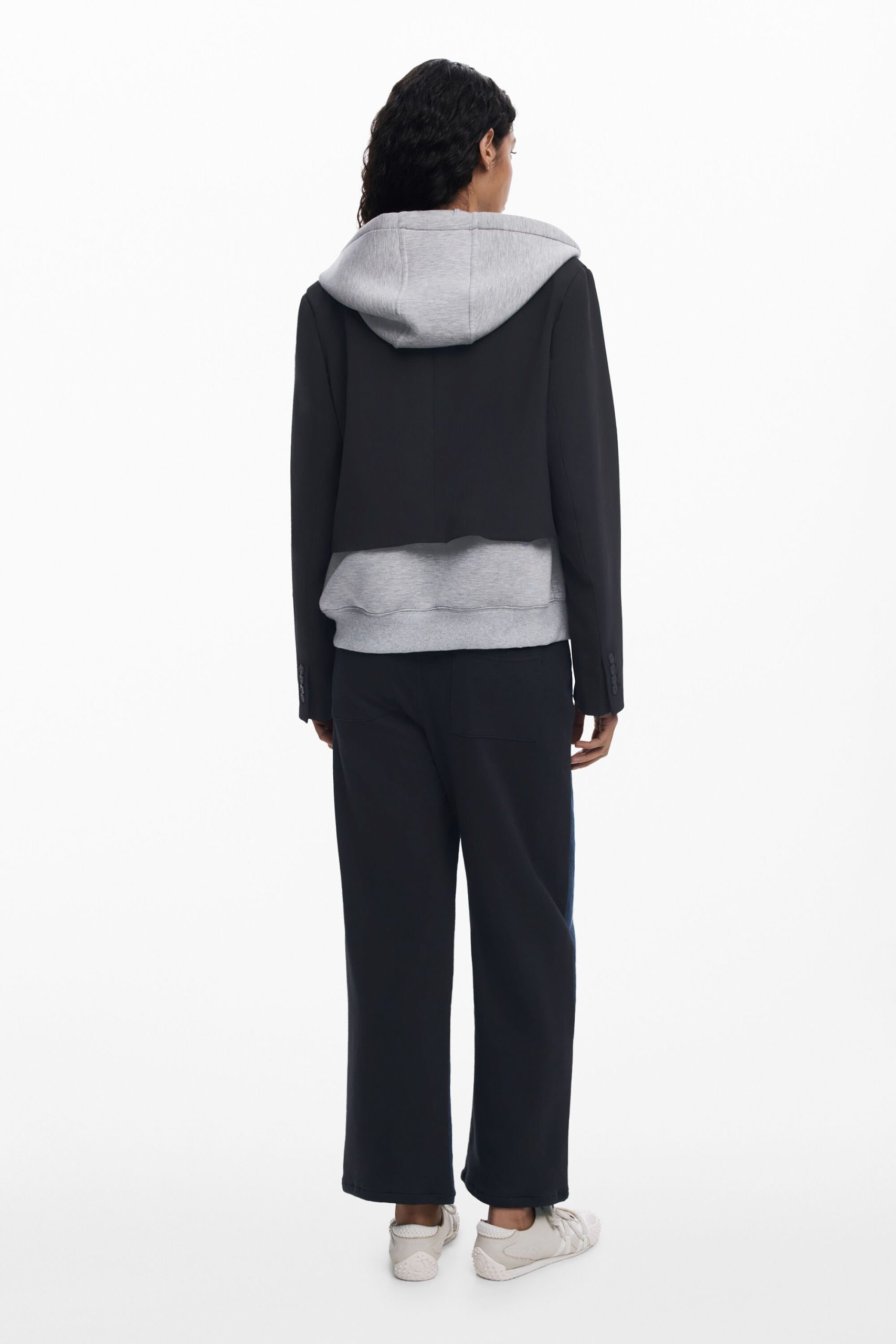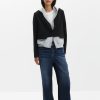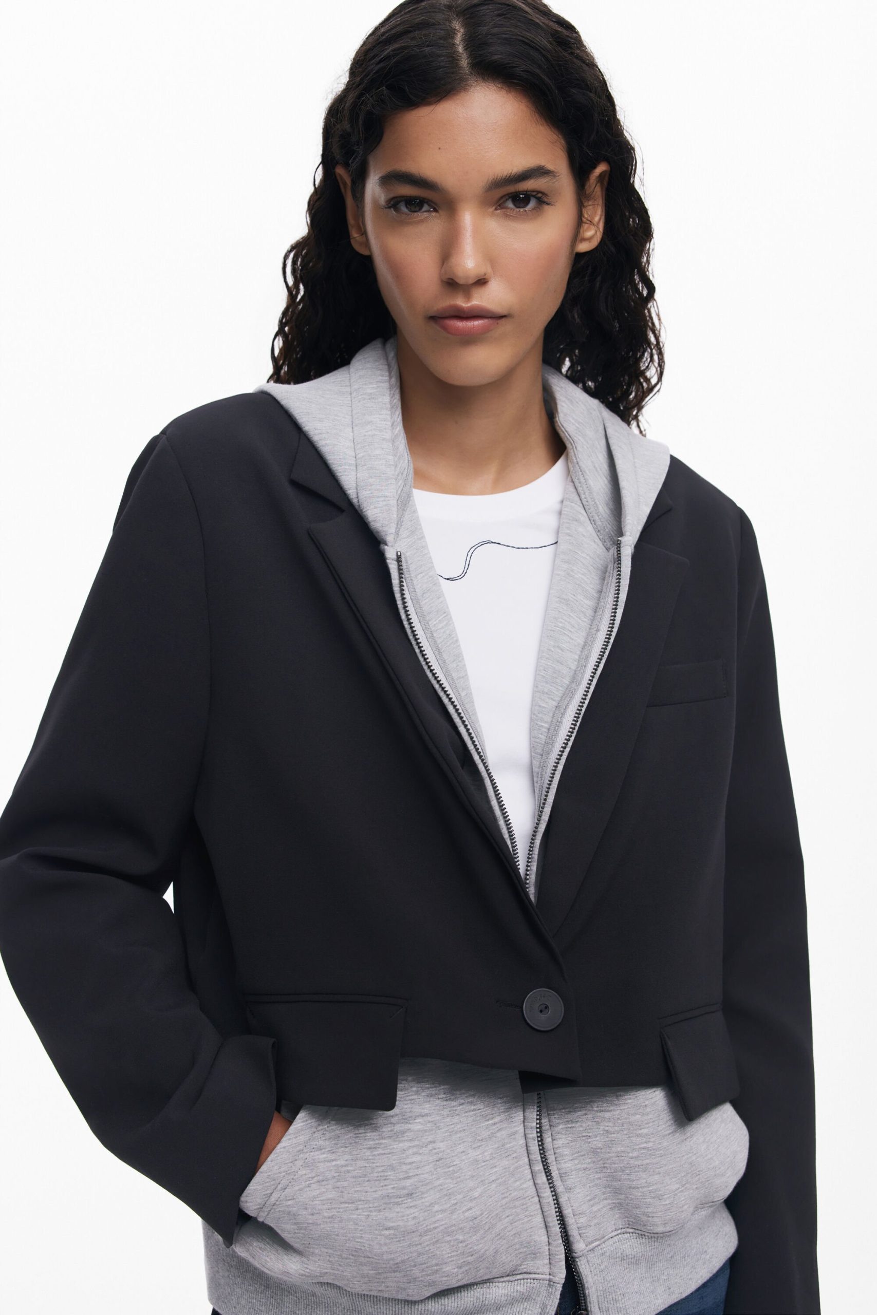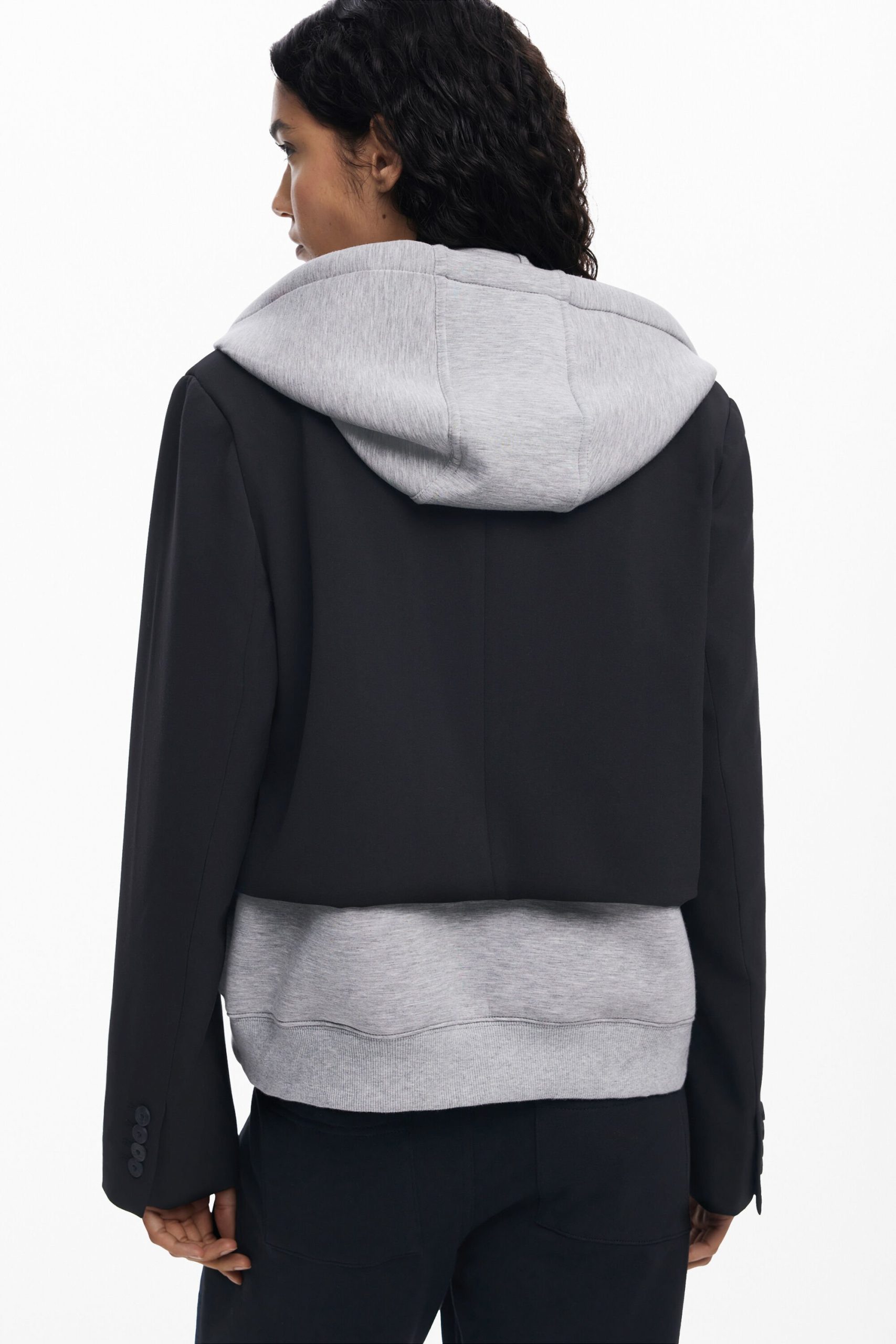 Two-tone blazer combined in knit with sweatshirt effect finish, front pockets, hood, and zipper and button closure.