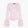 Fine knit sweater, long sleeves, trim details on the neckline and ruffles on the sleeves in coquette style designed by María Escoté.