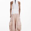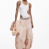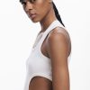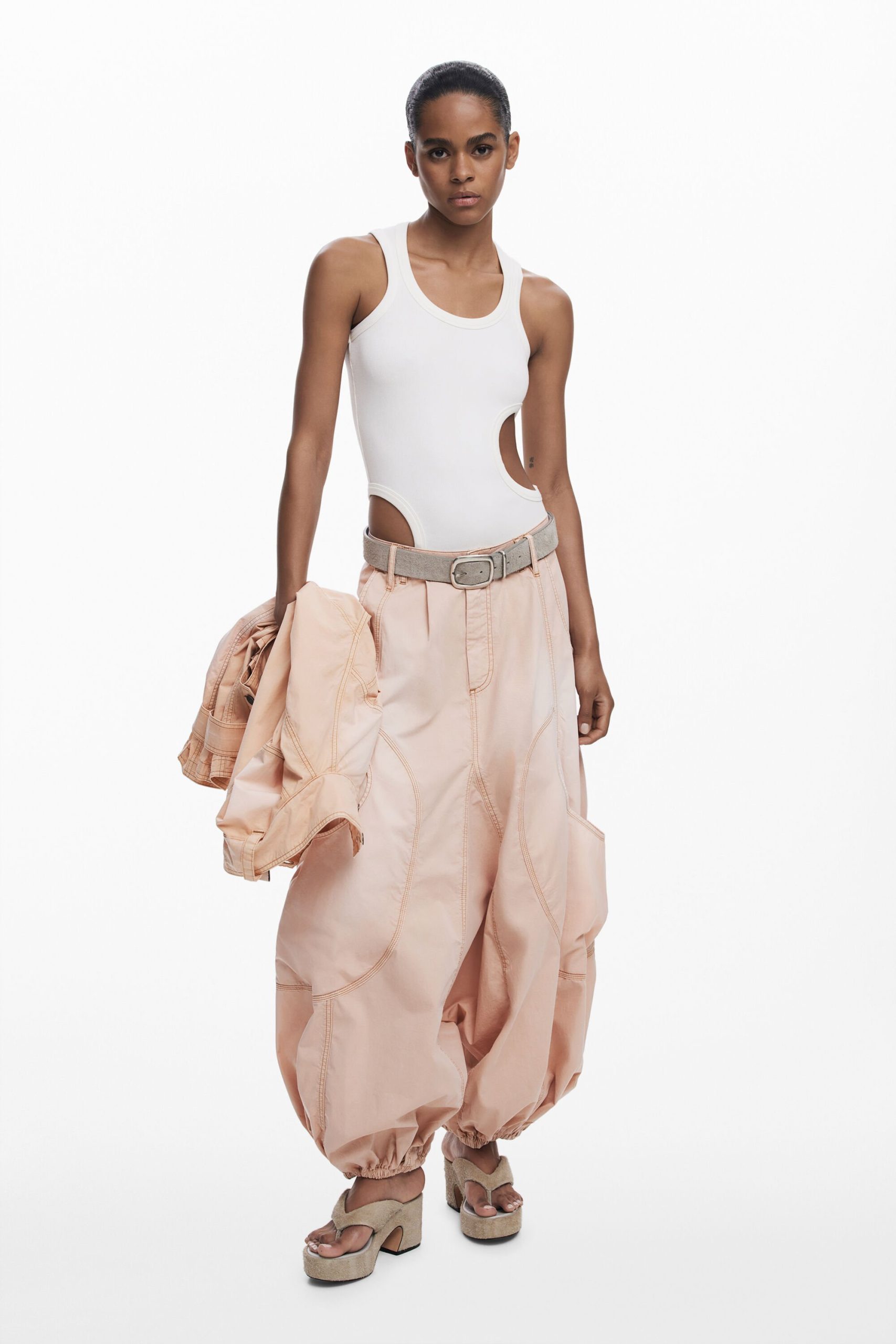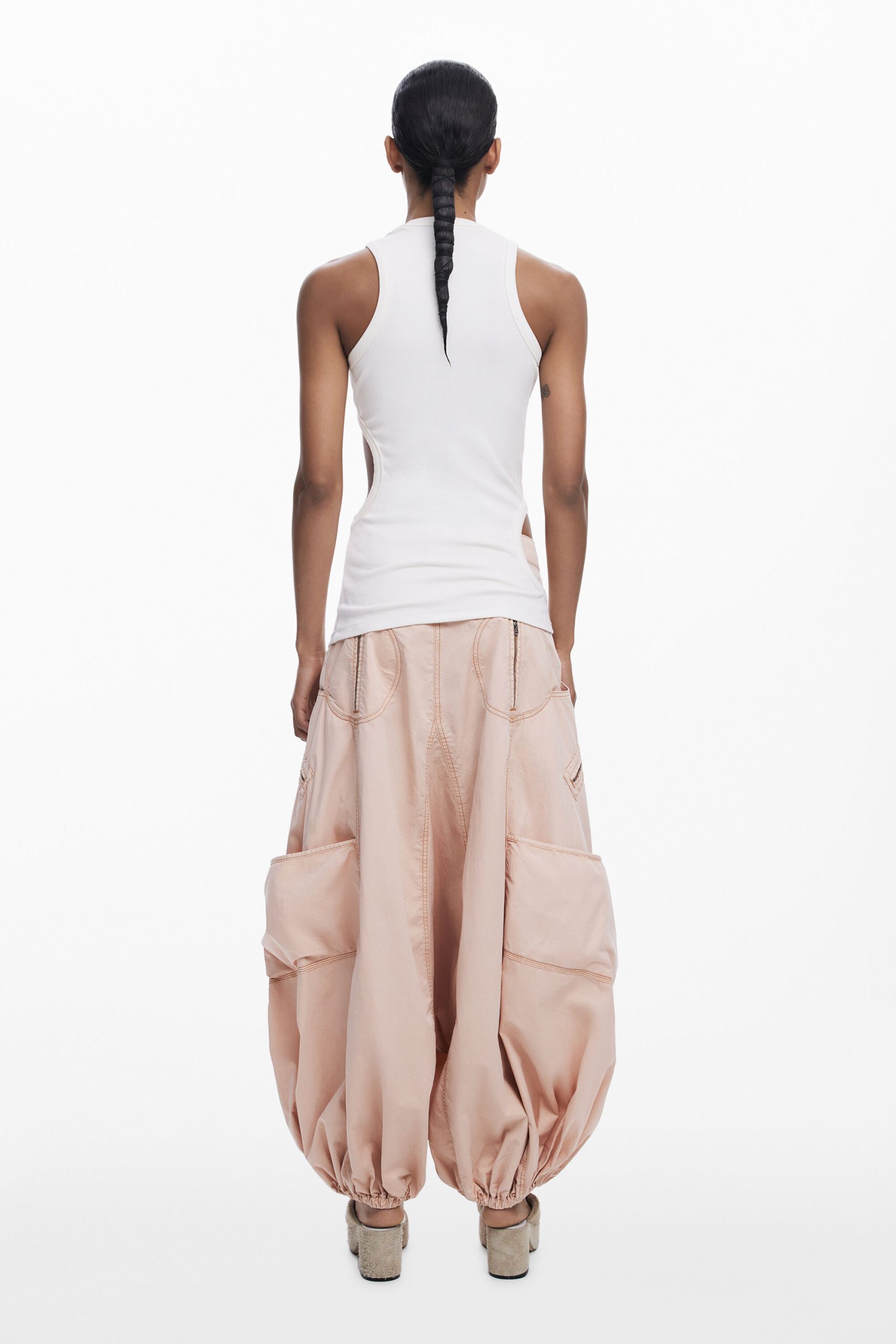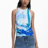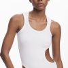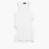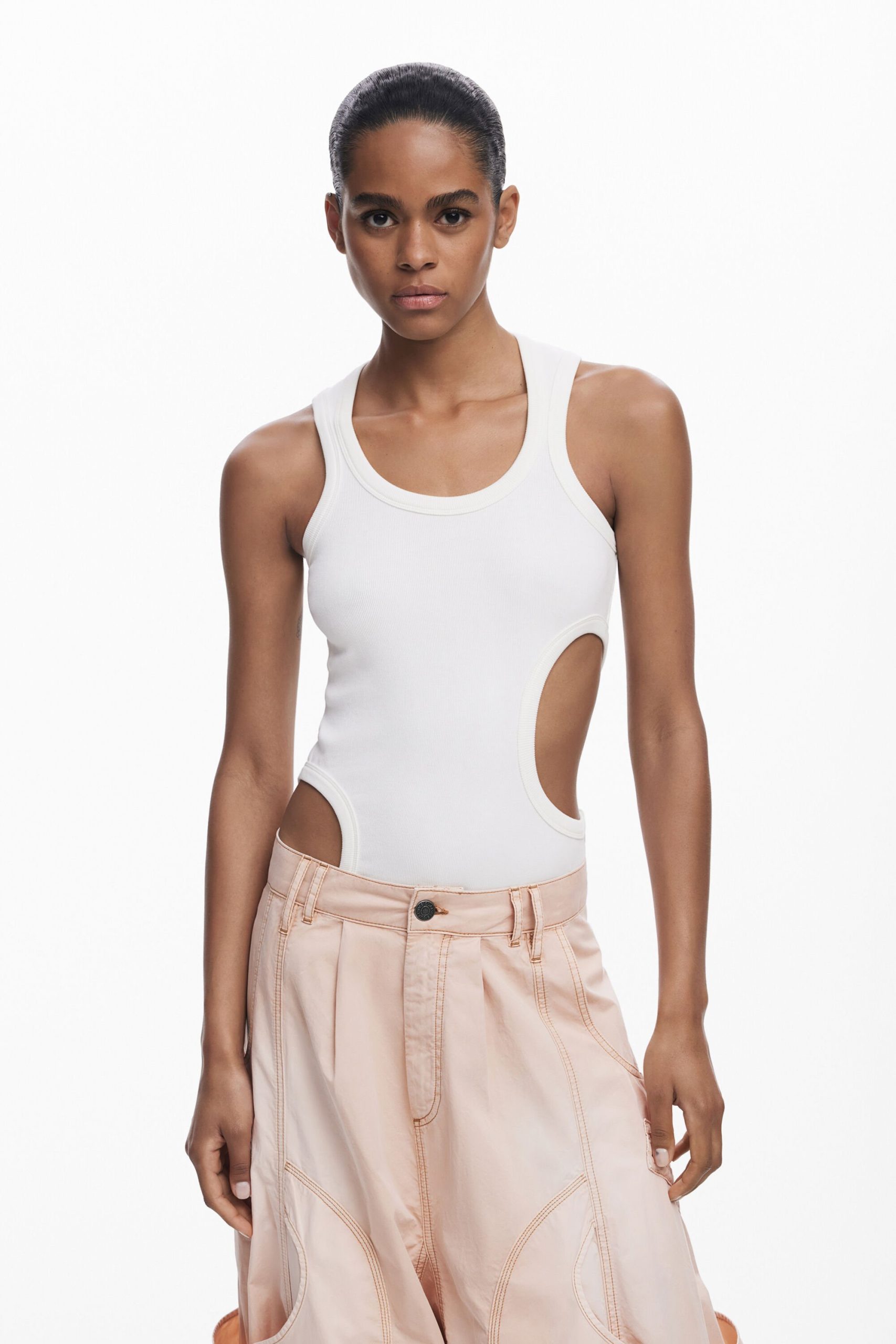 Sleeveless regular-fit T-shirt in solid color with several cut-out details and decorative stitching.